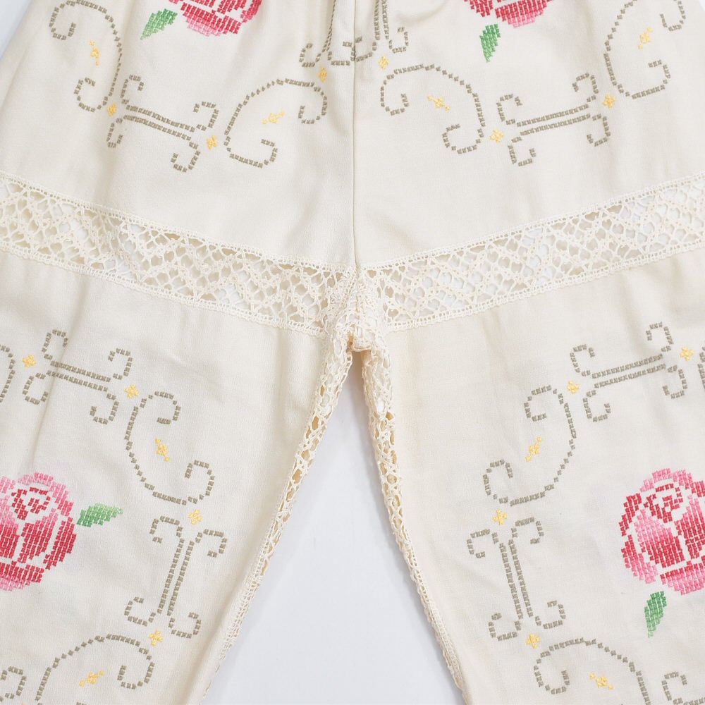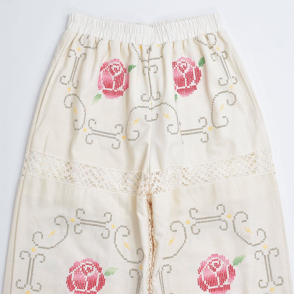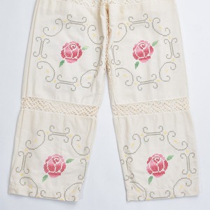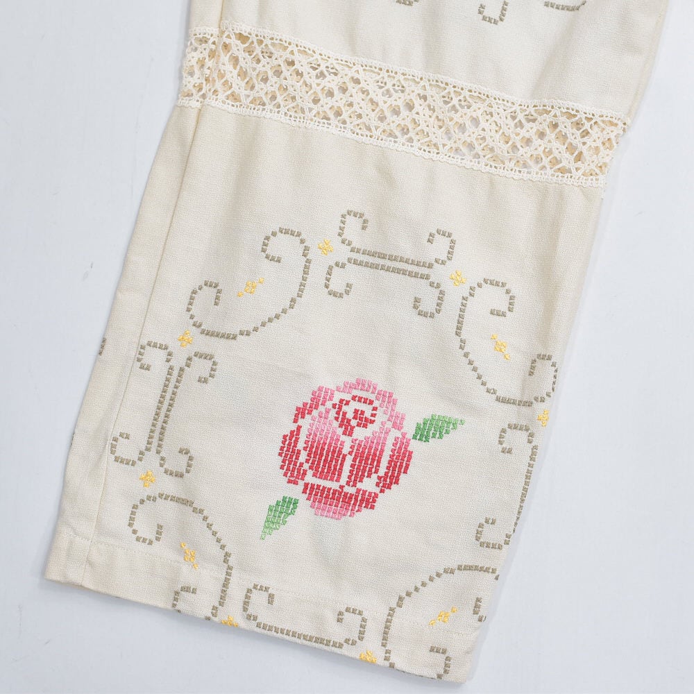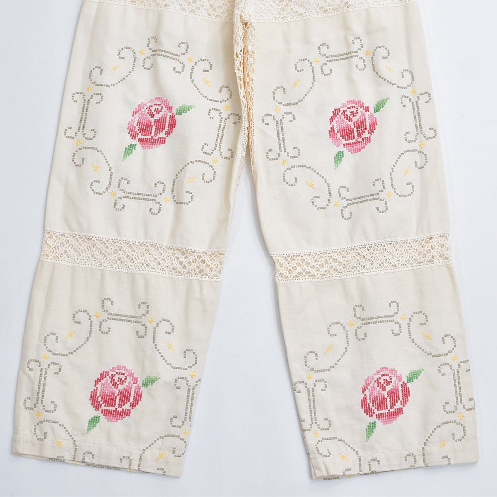 ホッとした気持ちになれるアイボリーベースに、クロスステッチで描かれた花々とレースで切り替えられた生地をボトムスに再構築したパッチワークのリメイクパンツ