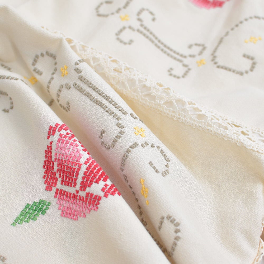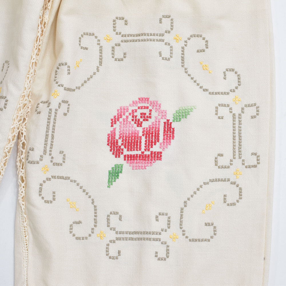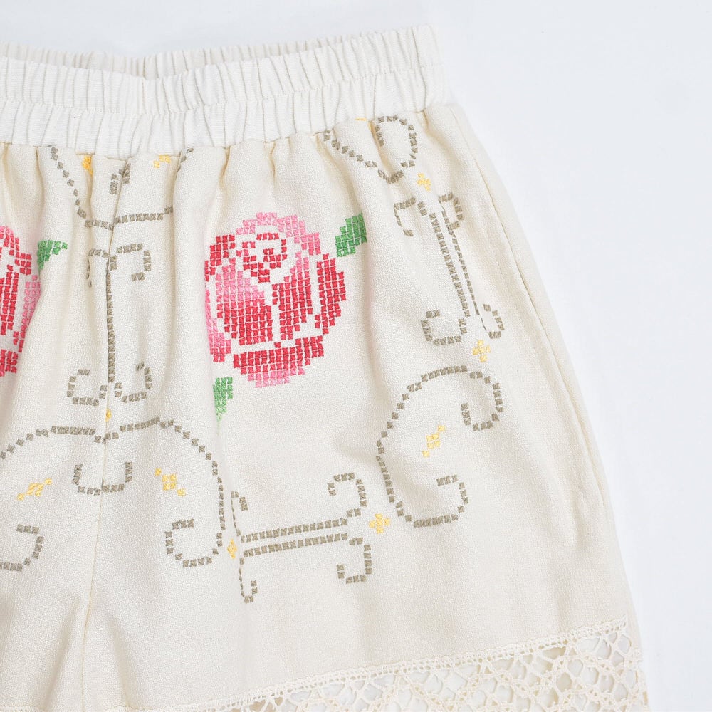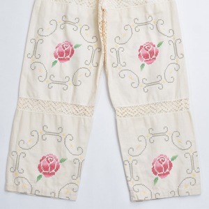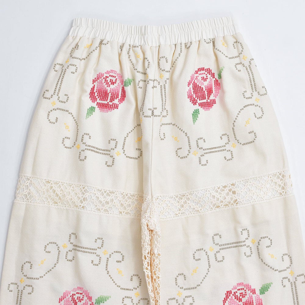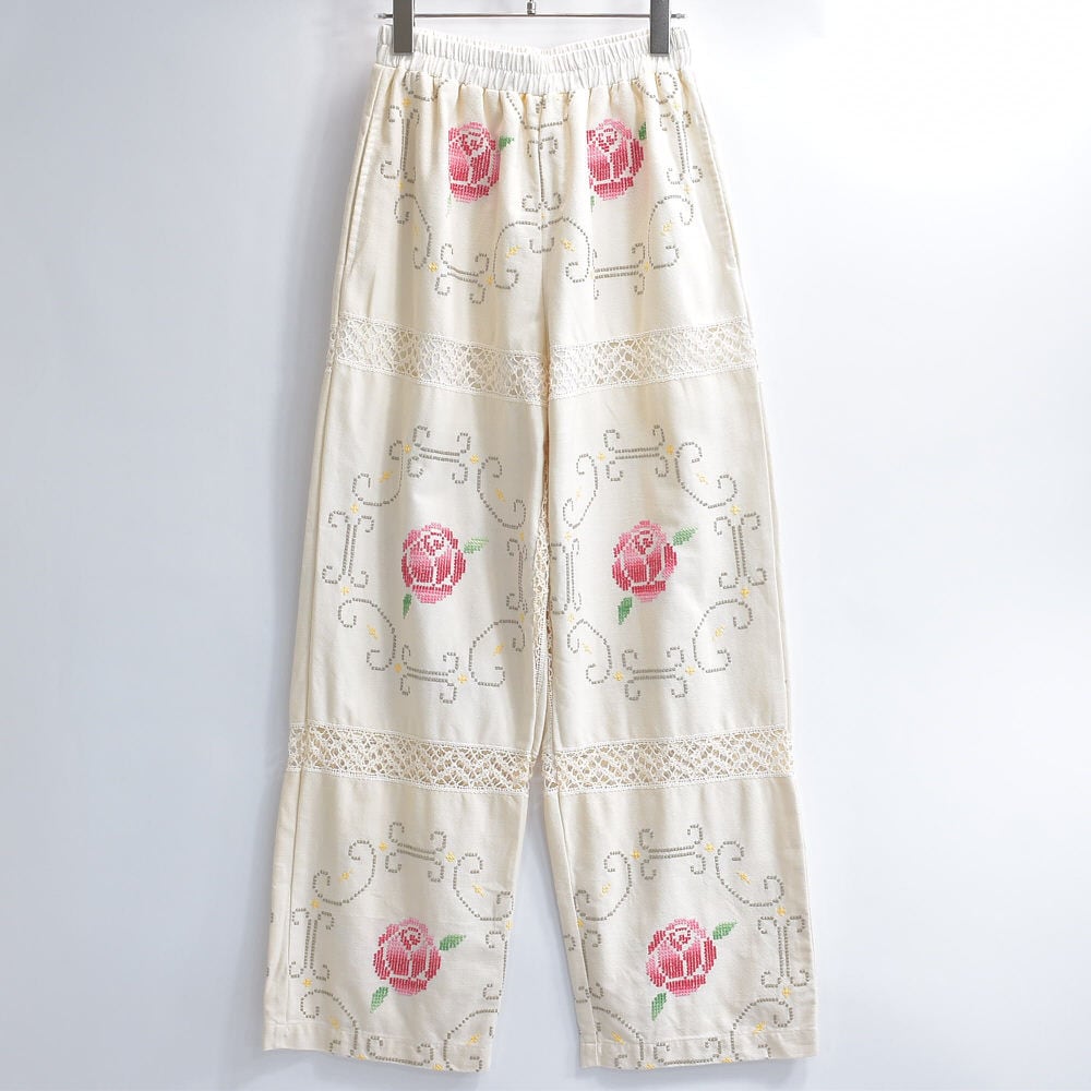 ホッとした気持ちになれるアイボリーベースに、クロスステッチで描かれた花々とレースで切り替えられた生地をボトムスに再構築したパッチワークのリメイクパンツ