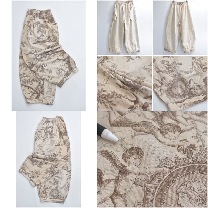 フランスの伝統柄、トワル・ド・ジュイのパターンクロスをボトムスに再構築したリメイクパンツ
