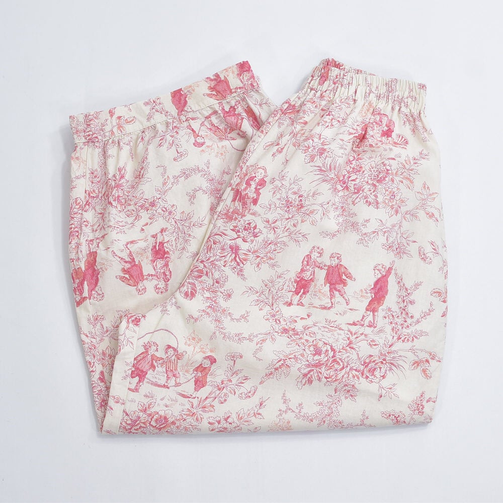 フランスの伝統柄、トワル・ド・ジュイのパターンクロスをボトムスに再構築したリメイクパンツ