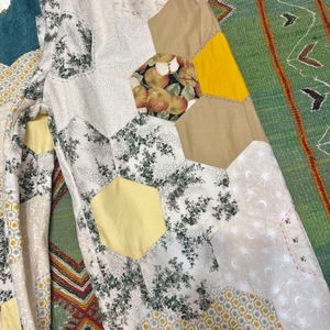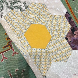 六角形の色んな生地をお花の模様の様に一枚一枚繋ぎ合わせて作られたフラワーガーデンの相性で人気のヘキサゴンのパッチワーク