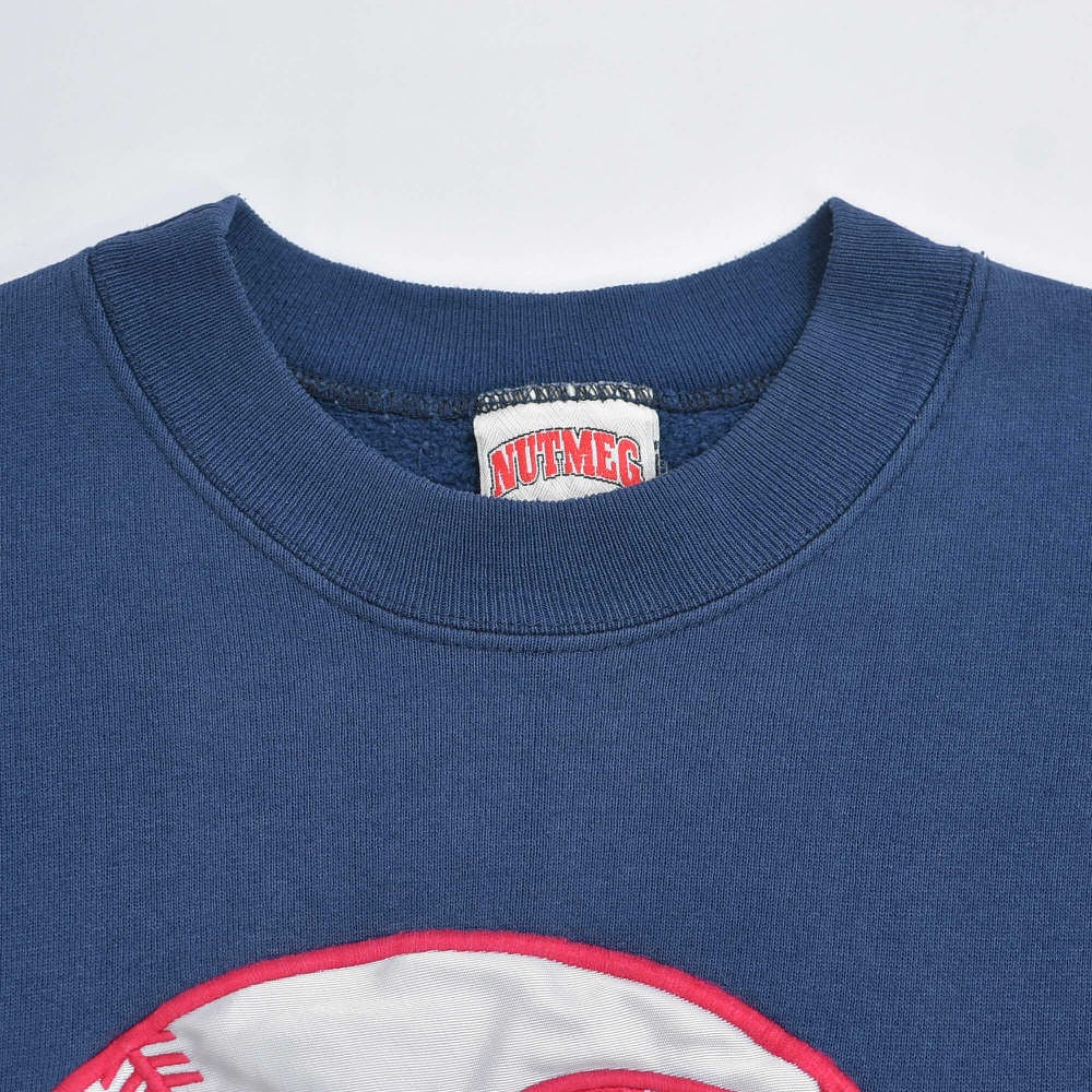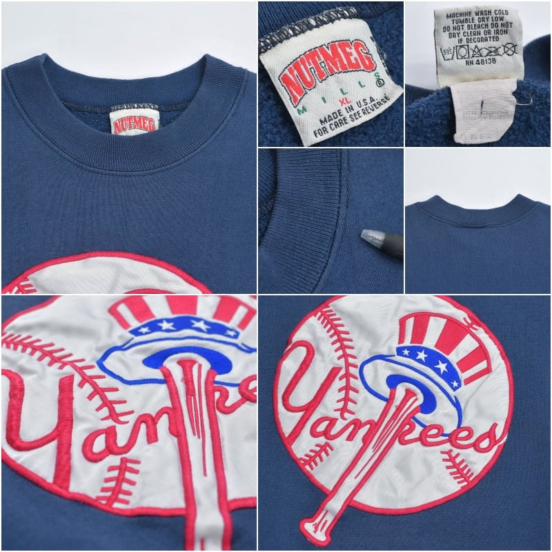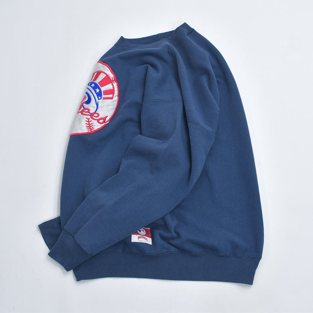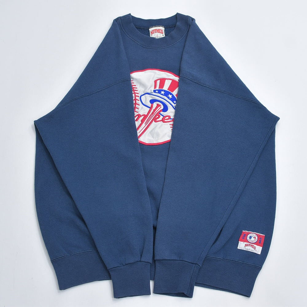 90s USA製 NUTMEG ナツメグ MLB ニューヨークヤンキース サテンワッペン 刺繍ロゴ クルーネックスウェット トレーナー チームロゴ ネイビー ヴィンテージ ビンテージ アメリカ古着 メンズXLサイズ