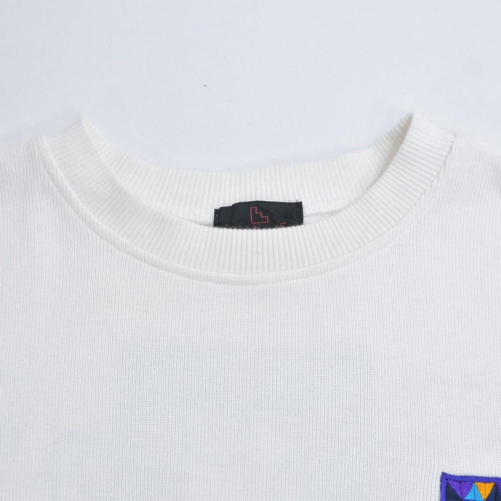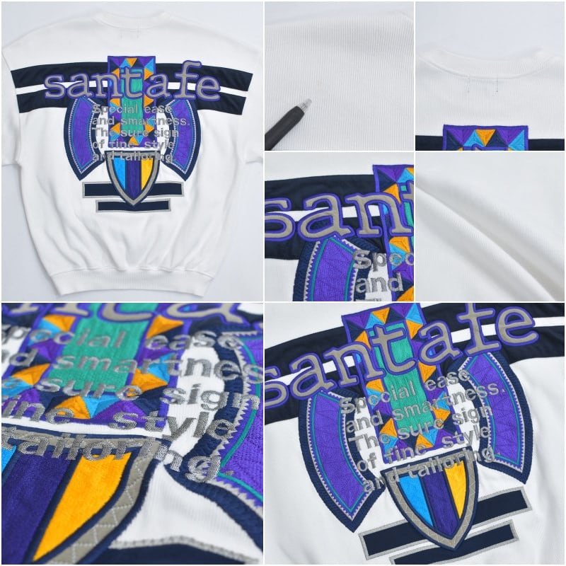 90s 日本製 santa fe サンタフェ 刺繍 アップリケ ビッグロゴ デザイン バックロゴ ワイド ドロップショルダー クルーネック スウェット トレーナー ホワイト 白 ジャパンヴィンテージ ビンテージ 国産古着 メンズLサイズ相当