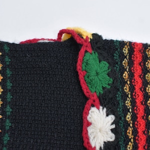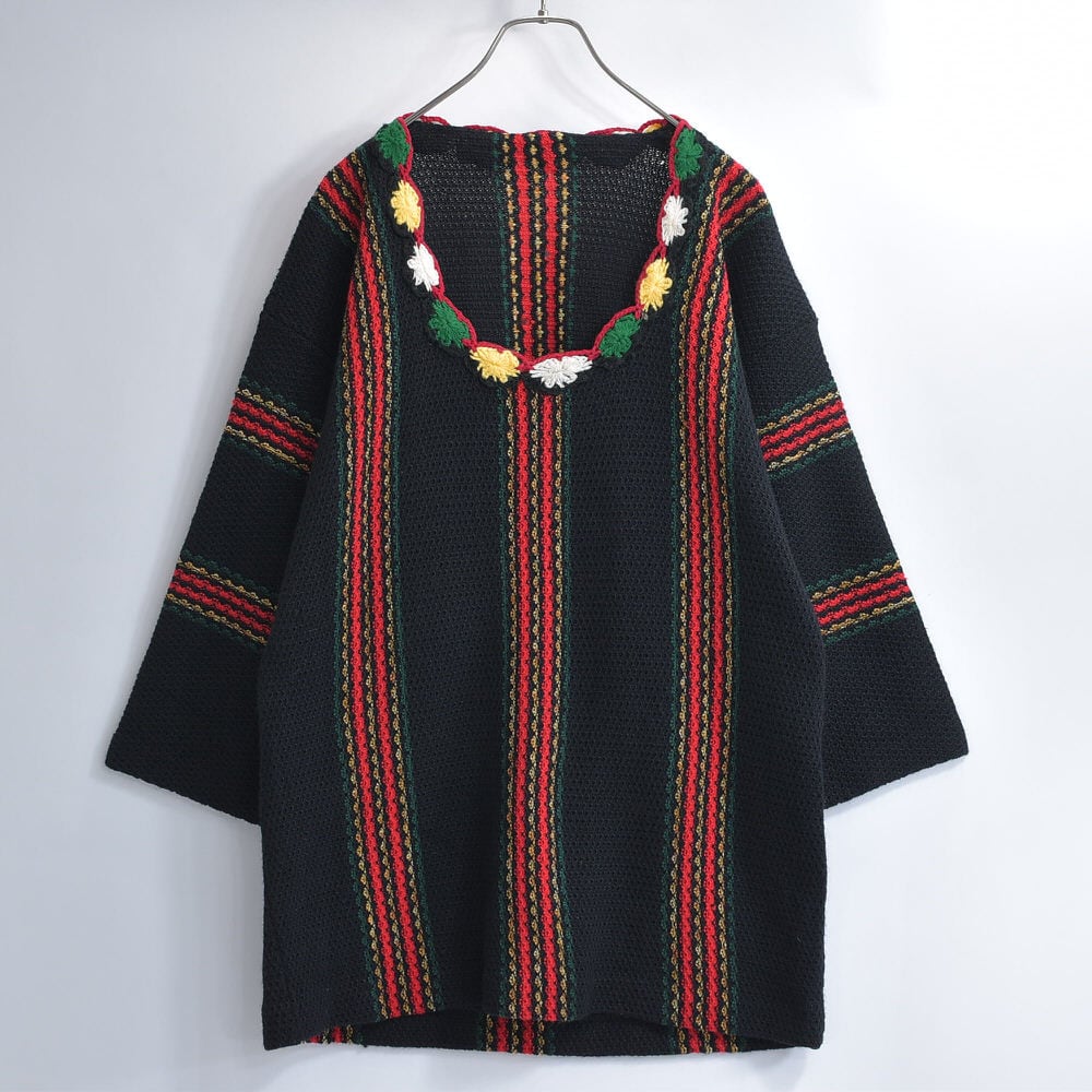 70~80s Used Uネック 半端丈 クロシェットフラワー パイピングデザイン ストライプ プルオーバーニット エスニック フォークロア セーター ブラック ヴィンテージ ビンテージ 古着 メンズL相当
