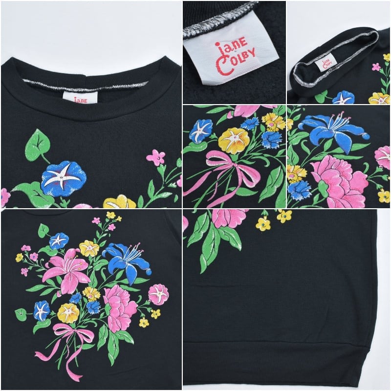 80~90s Jane Colby ジェーンコルビー ドロップショルダー フラワーブーケデザイン プリント スウェット トレーナー 花柄 ブラック ヴィンテージ ビンテージ USA アメリカ古着 レディースL~XL相当