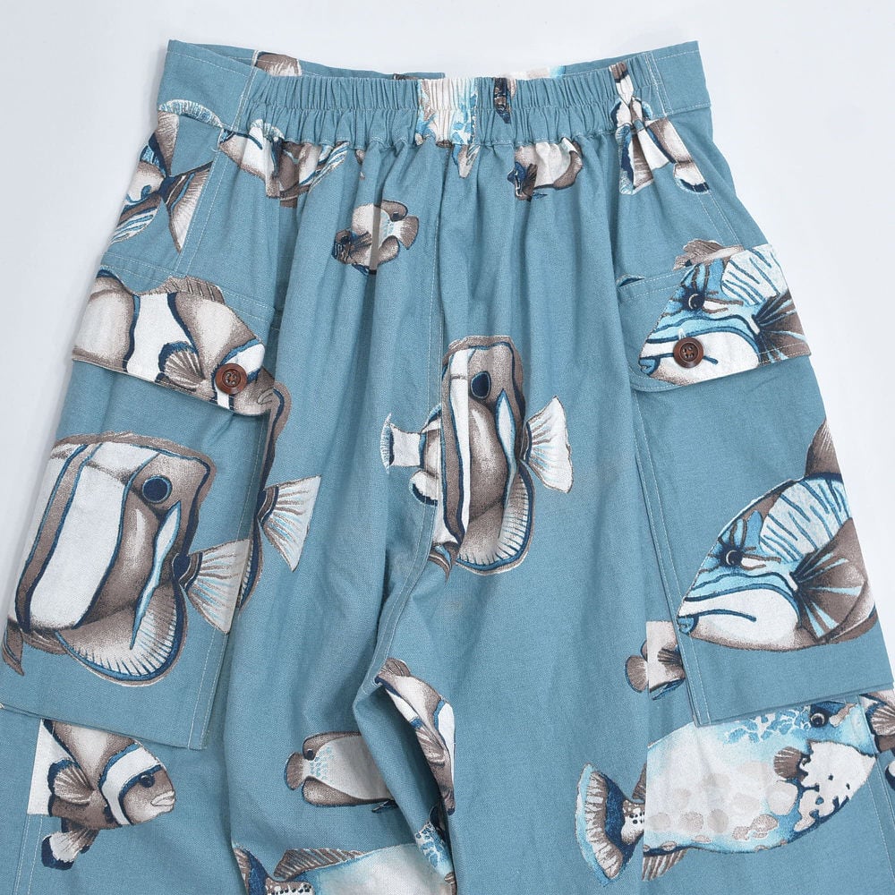 Remake リメイク ハンドメイド テキスタイル パッチワーク デザイン ルーズシルエット カーゴパンツ 熱帯魚 フィッシュ柄 魚 再構築 総柄 W67〜88cm