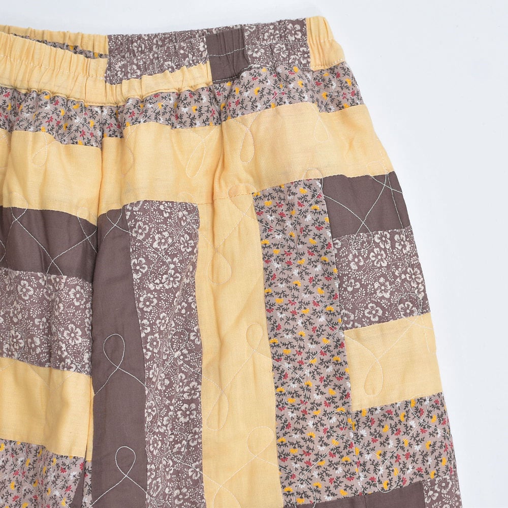レトロな趣を感じる小さな花々が描かれたパッチワークのキルト生地をボトムスに再構築したリメイクパンツ
