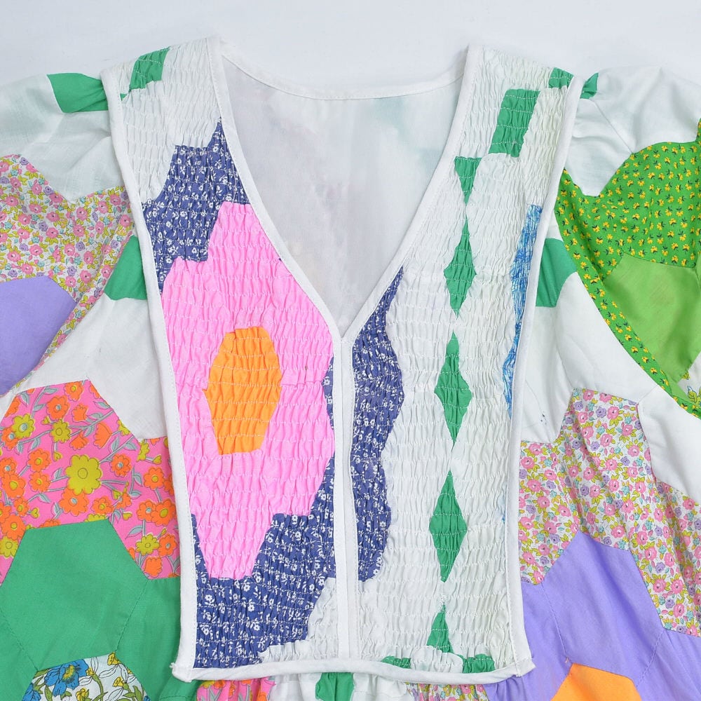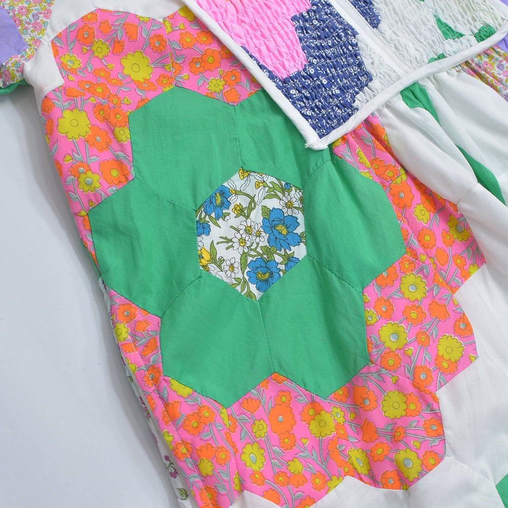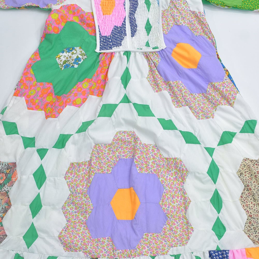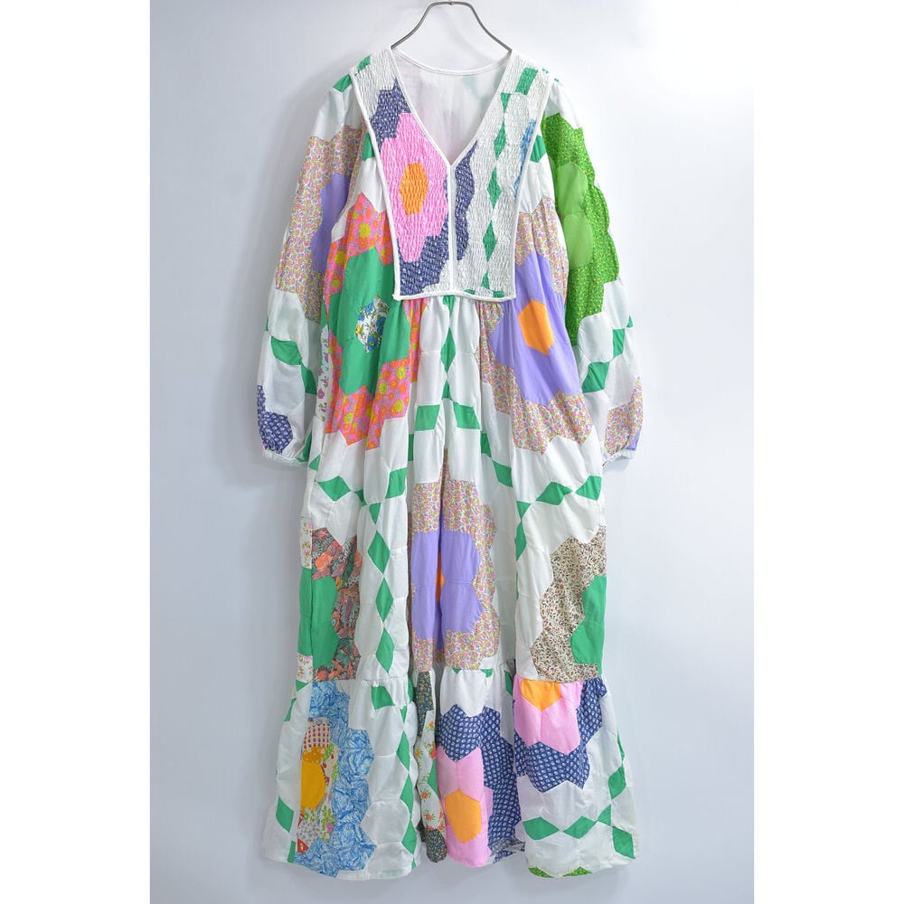 Remake リメイク 再構築 パッチワークキルトトップ フラワーガーデン ヘキサゴン デザイン ロングワンピース ビブフロント シャーリング 裏地付き レディースM~相当