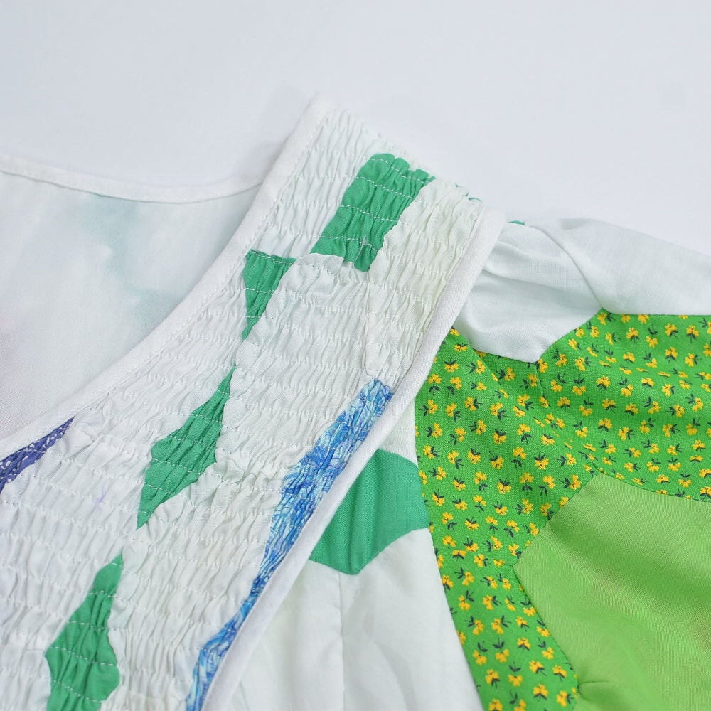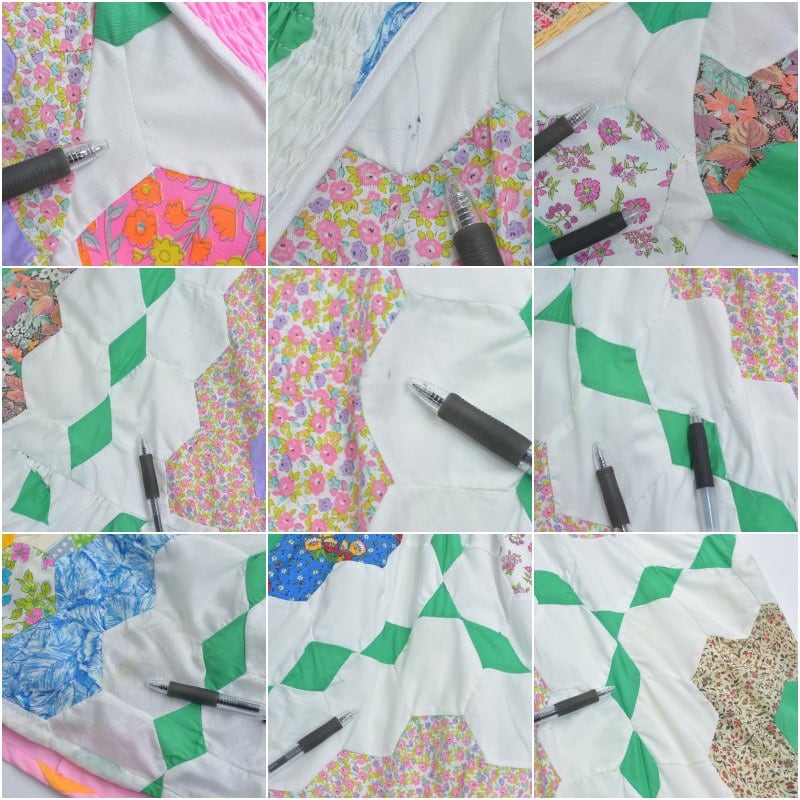 Remake リメイク 再構築 パッチワークキルトトップ フラワーガーデン ヘキサゴン デザイン ロングワンピース ビブフロント シャーリング 裏地付き レディースM〜相当