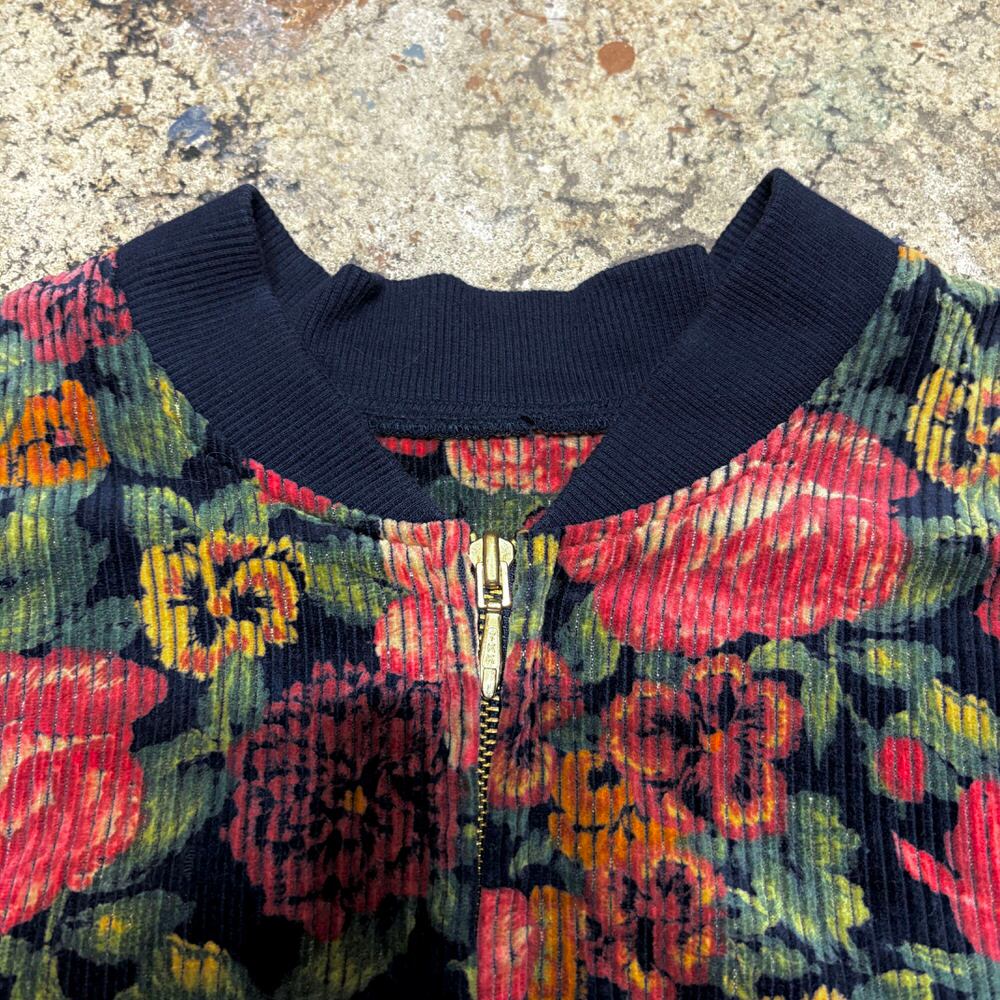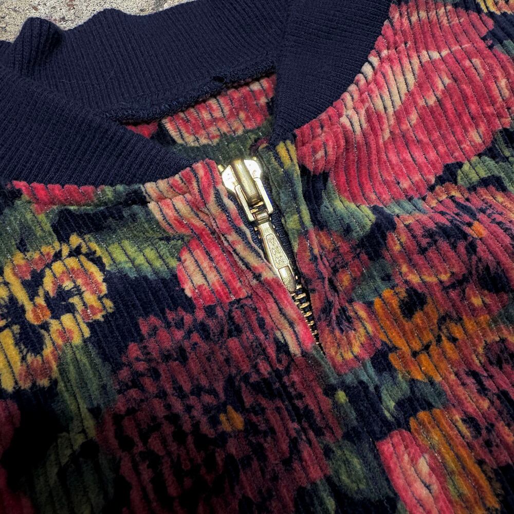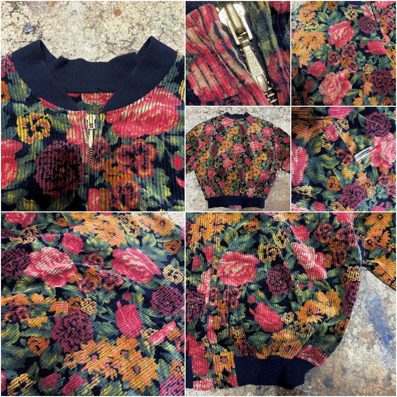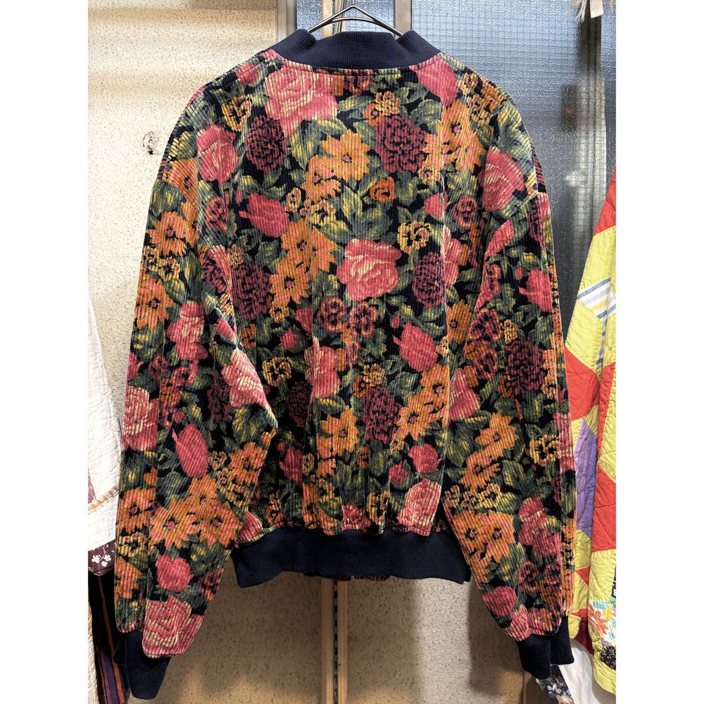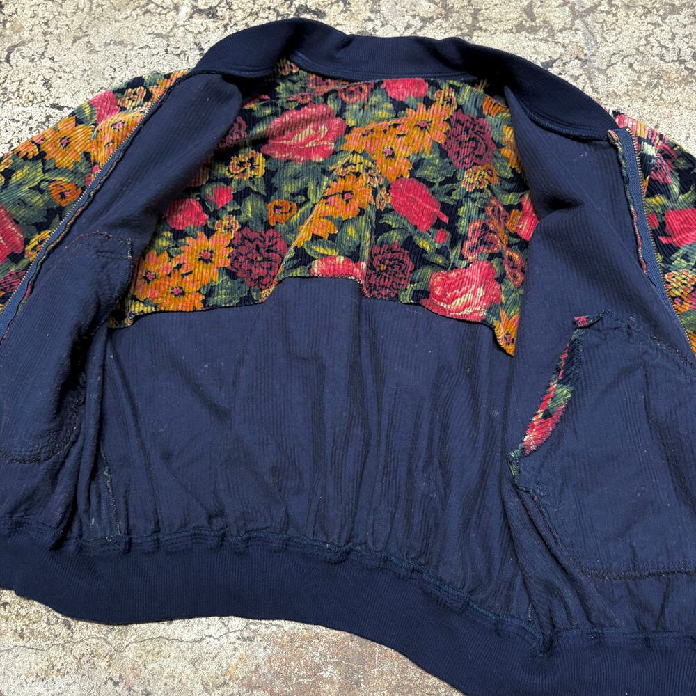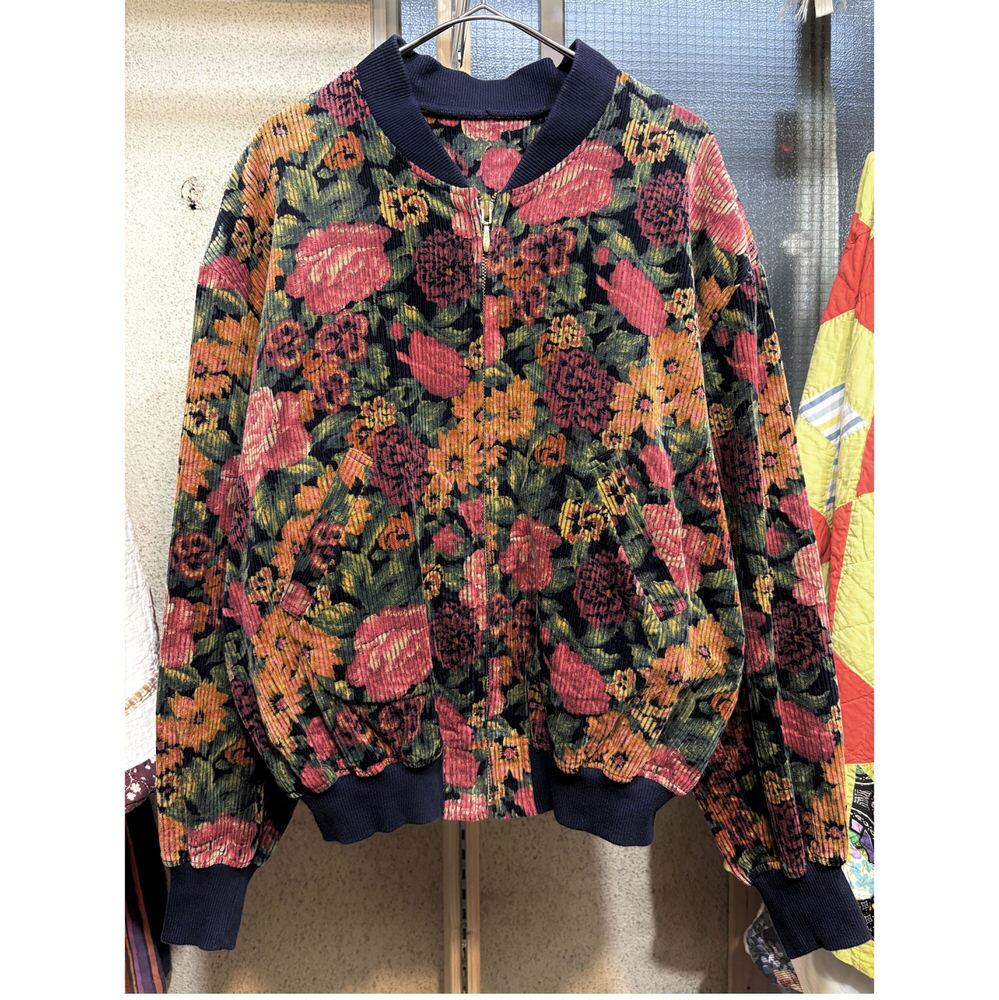 80~90s Retro Flower太畝 コーデュロイ リブブルゾン 花柄 総柄 フルジップ ジャケット ボンバー ショート丈 ネイビー マルチカラー ヴィンテージ ビンテージ 古着 レディースM~L相当