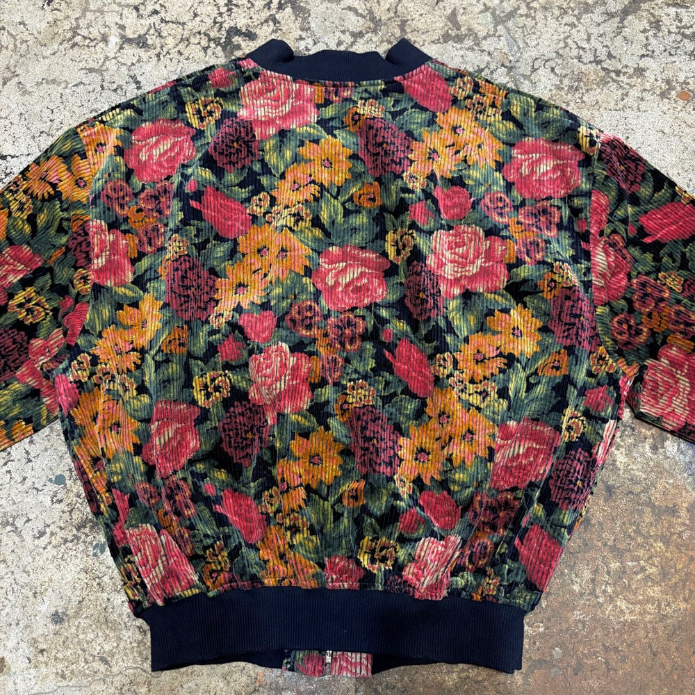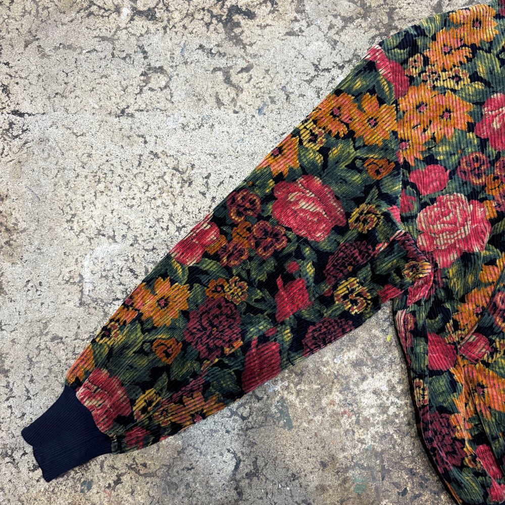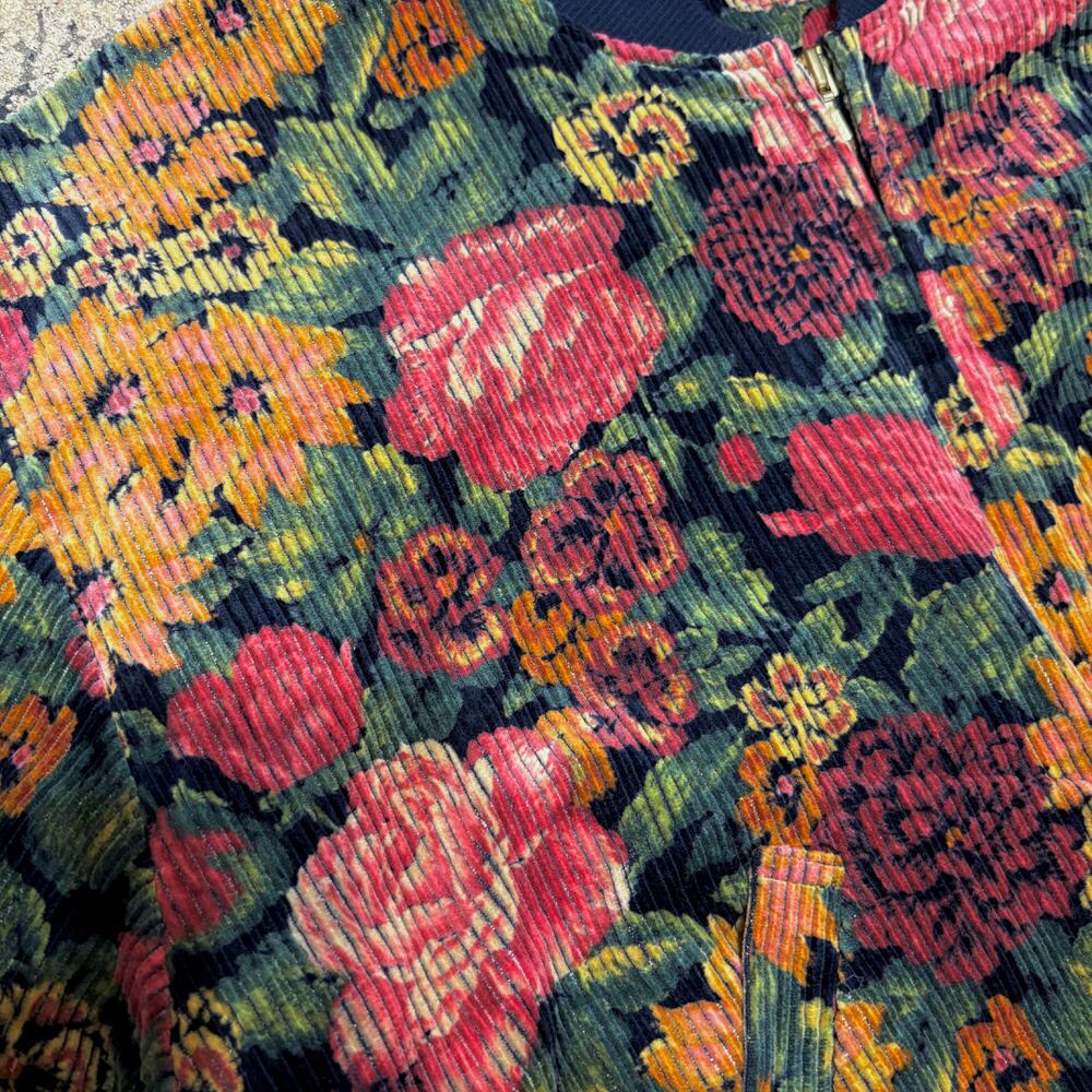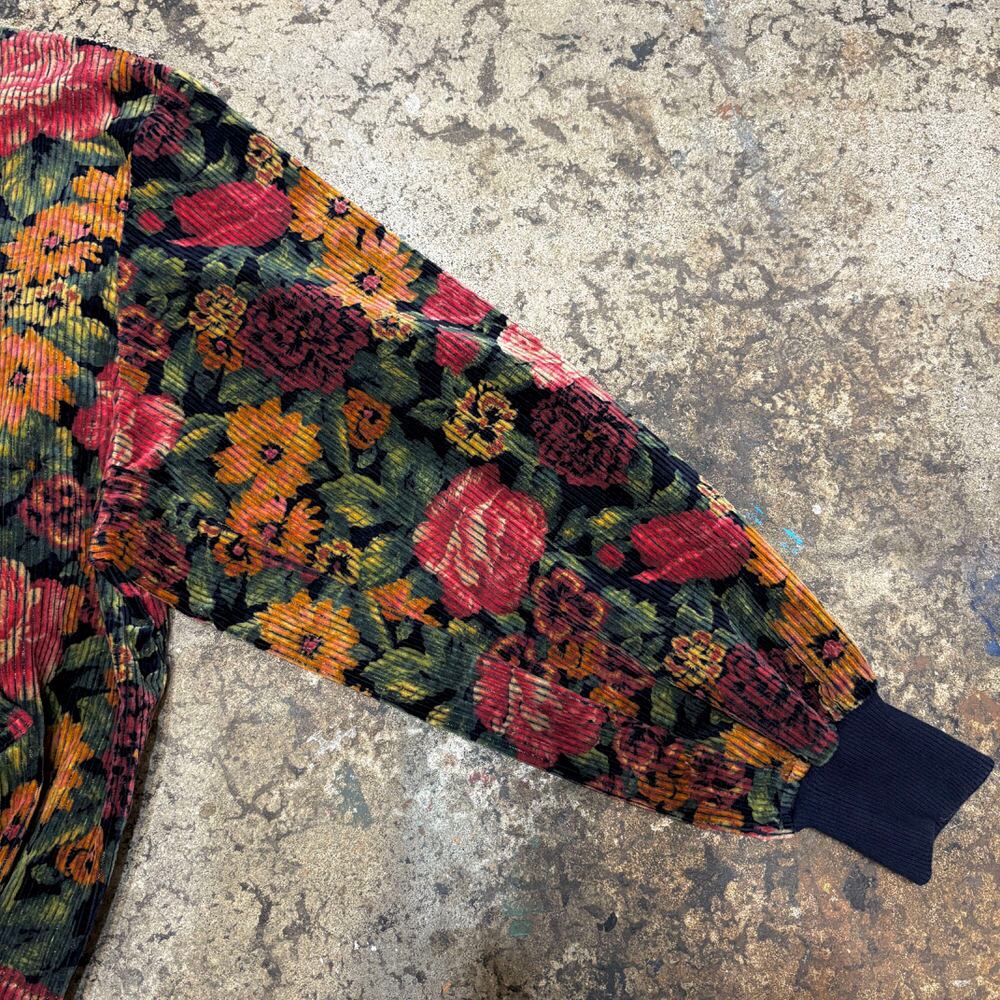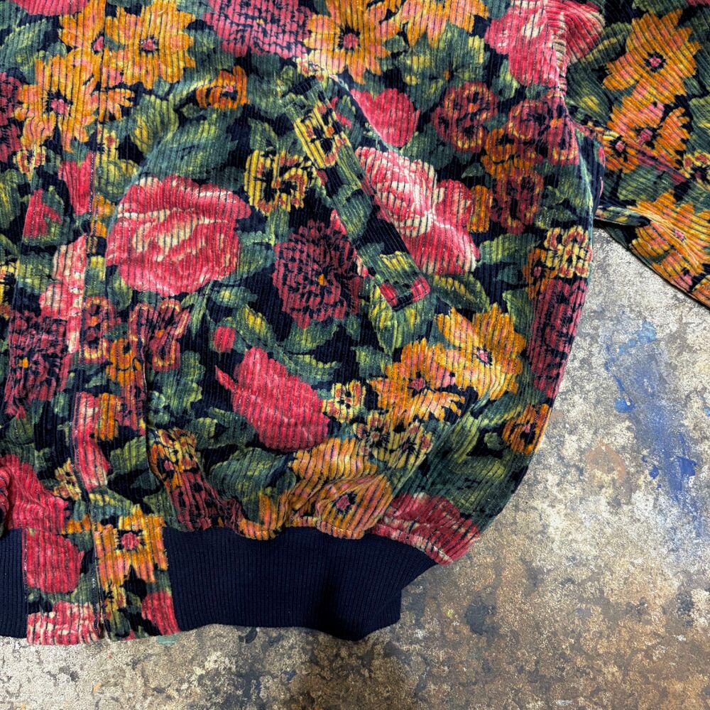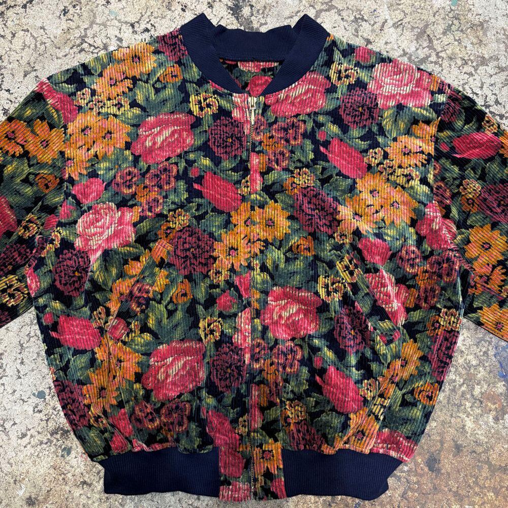 80~90s Retro Flower太畝 コーデュロイ リブブルゾン 花柄 総柄 フルジップ ジャケット ボンバー ショート丈 ネイビー マルチカラー ヴィンテージ ビンテージ 古着 レディースM~L相当