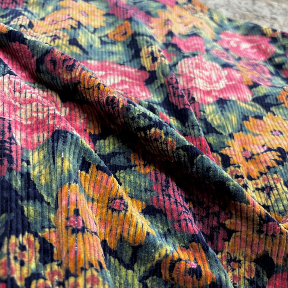 太畝のコーデュロイが持つ温かみのある素材感に、鮮やかな色彩が大胆に踊る