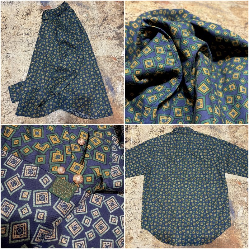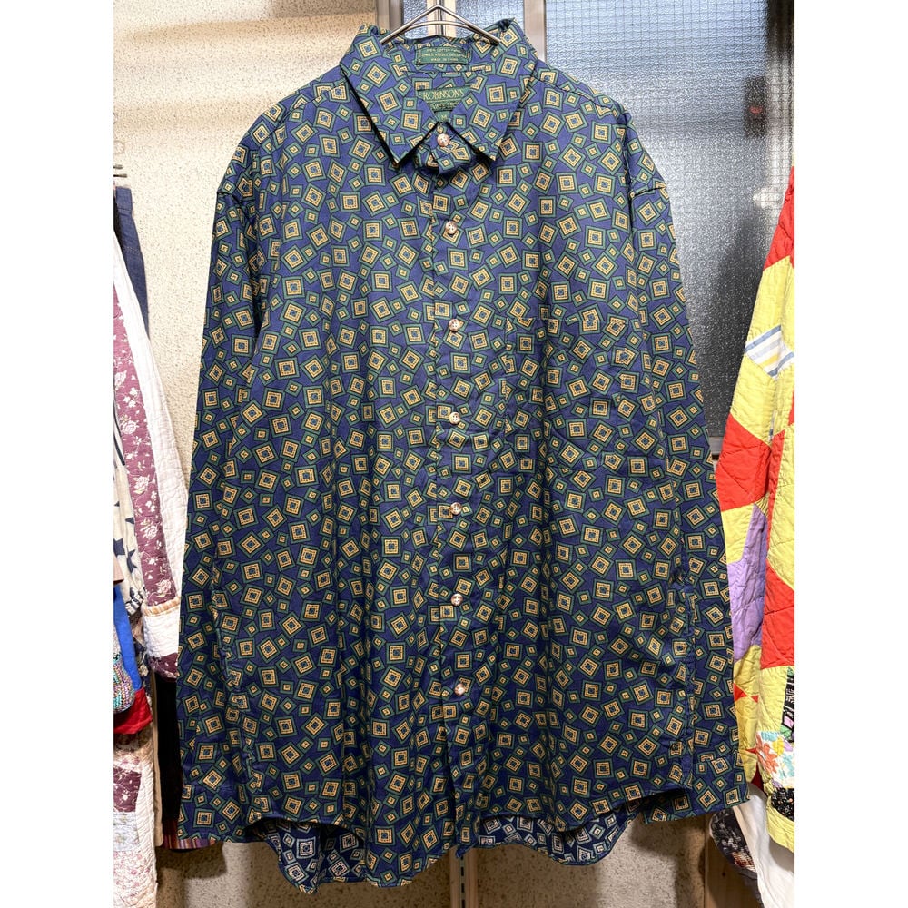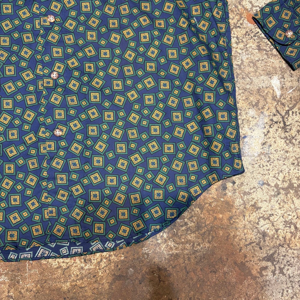 90s ROBINSONS PRIVATE STOCK シングルニードル 幾何学柄 総柄 ボタンダウン シャツ 長袖 小紋柄風 ネイビー グリーン ヴィンテージ ビンテージ USA アメリカ古着 メンズL相当