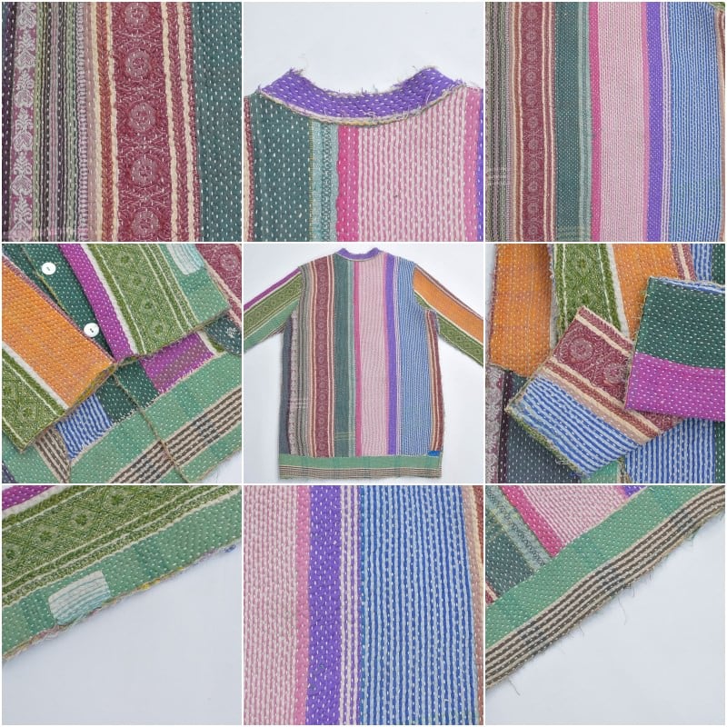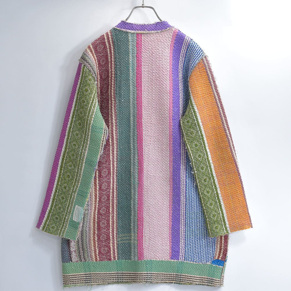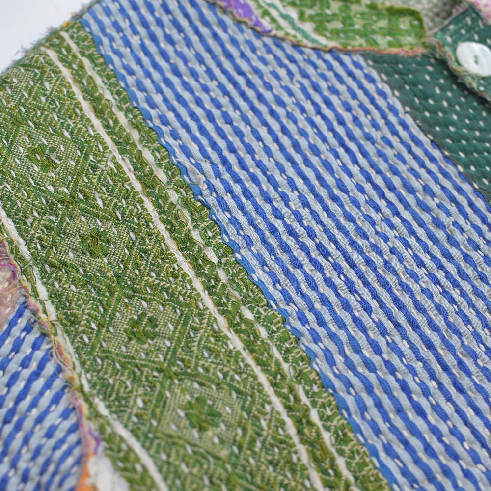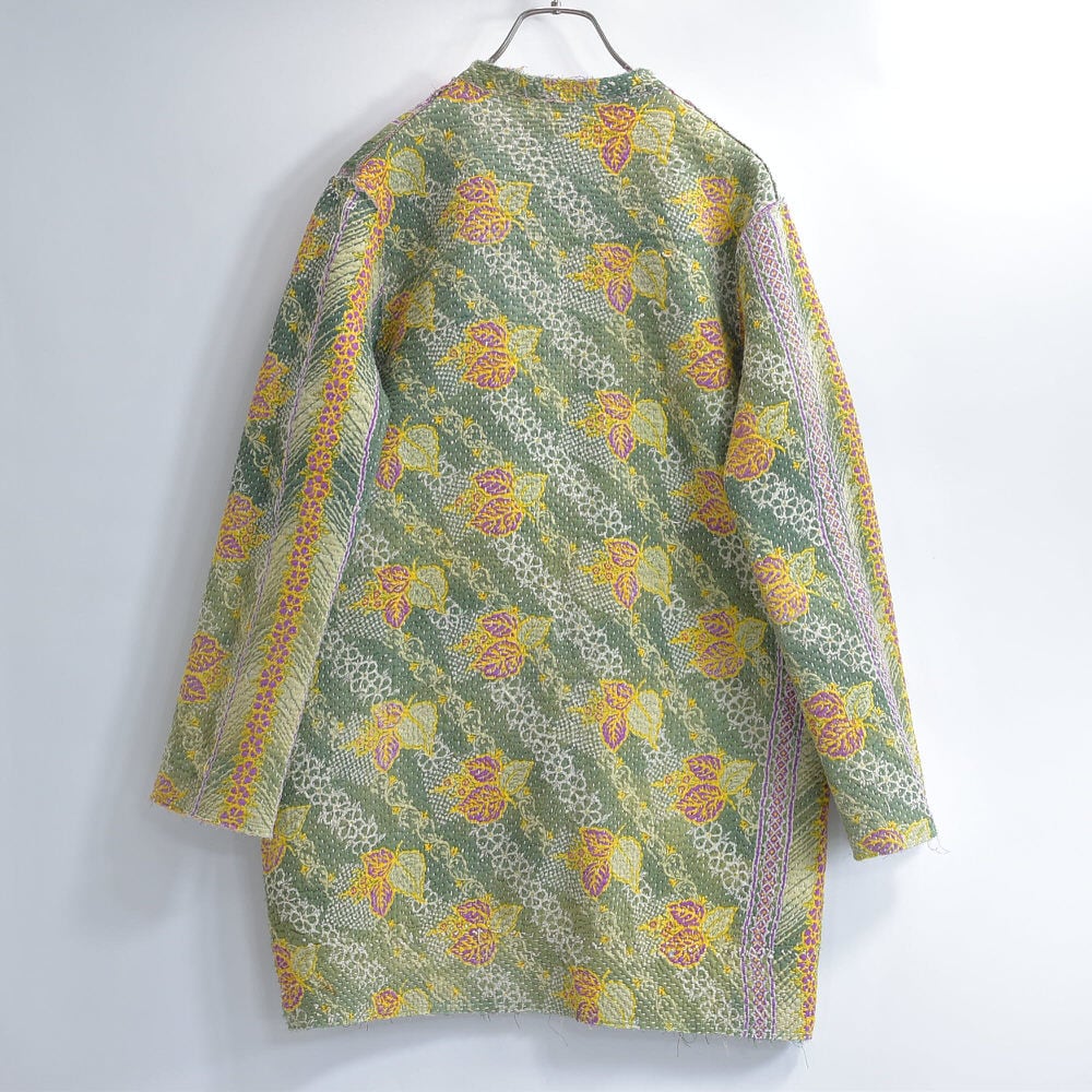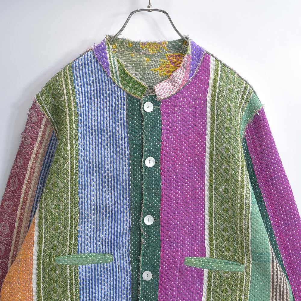 VINTAGE 刺し子ステッチ カンタキルト パッチワーク デザイン ジャケット ラリーキルト バンドカラー シェルボタン ヴィンテージ ビンテージ 古着 レディースL相当