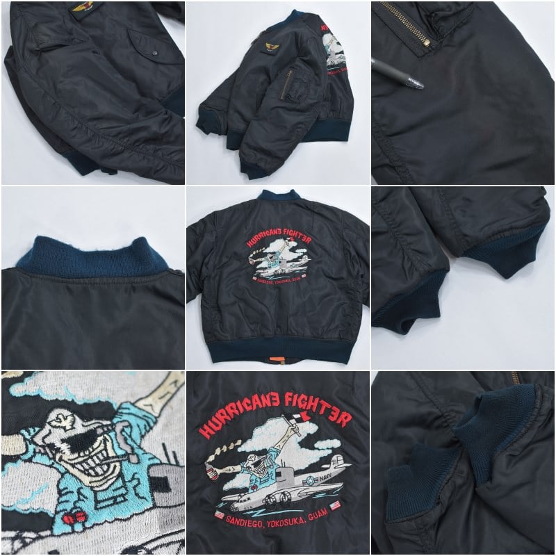 80~90s MA-1 フライトジャケット フライヤーズ マーワン U.S. NAVY 刺繍 HURRICANE FIGHTER スカル IDEALジップ ブラック ヴィンテージ ビンテージ 古着 メンズLサイズ