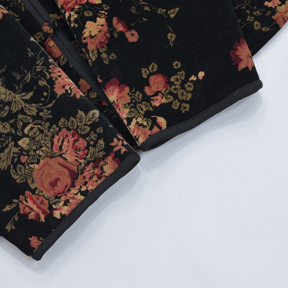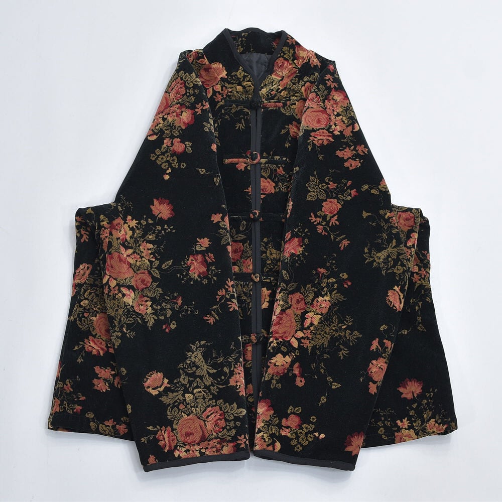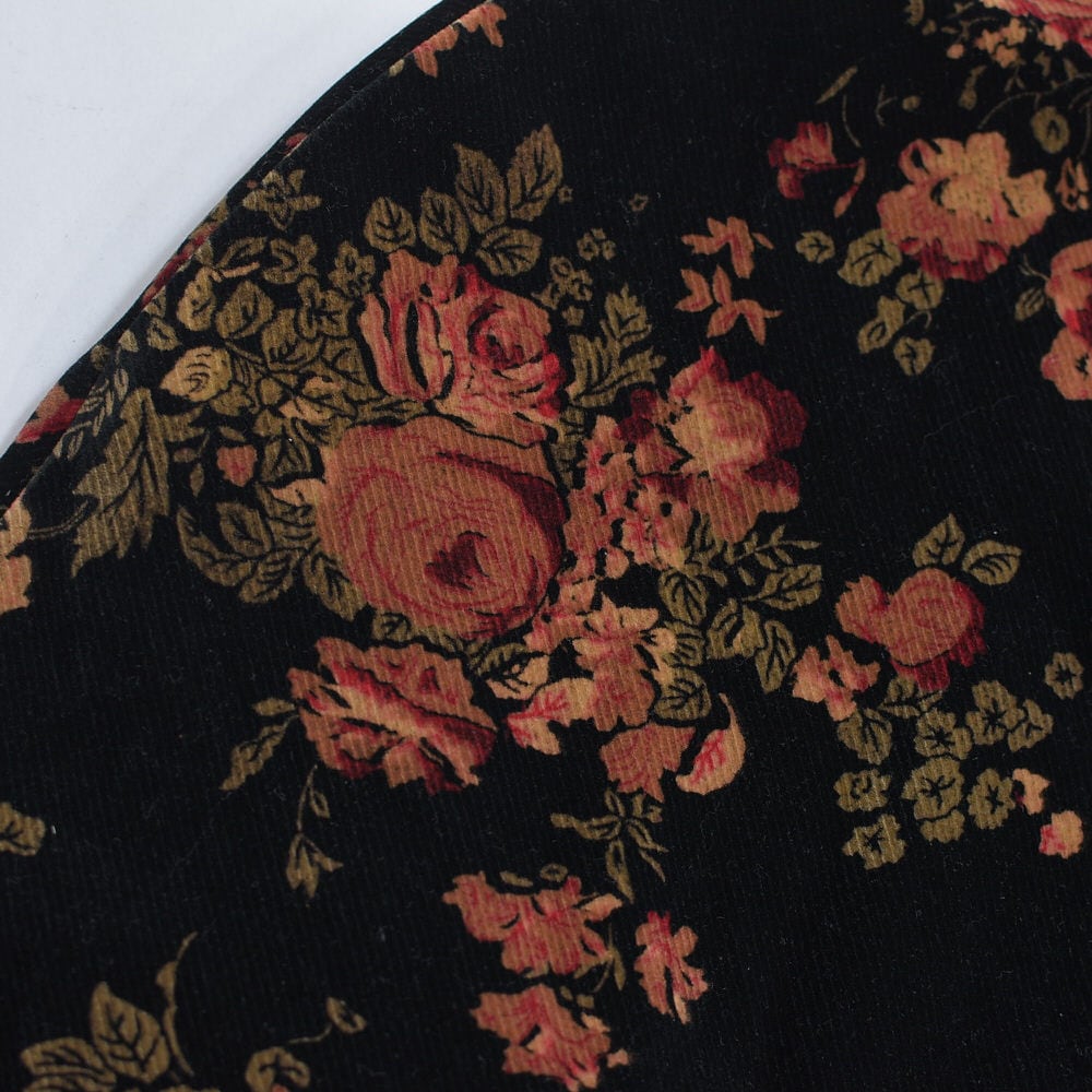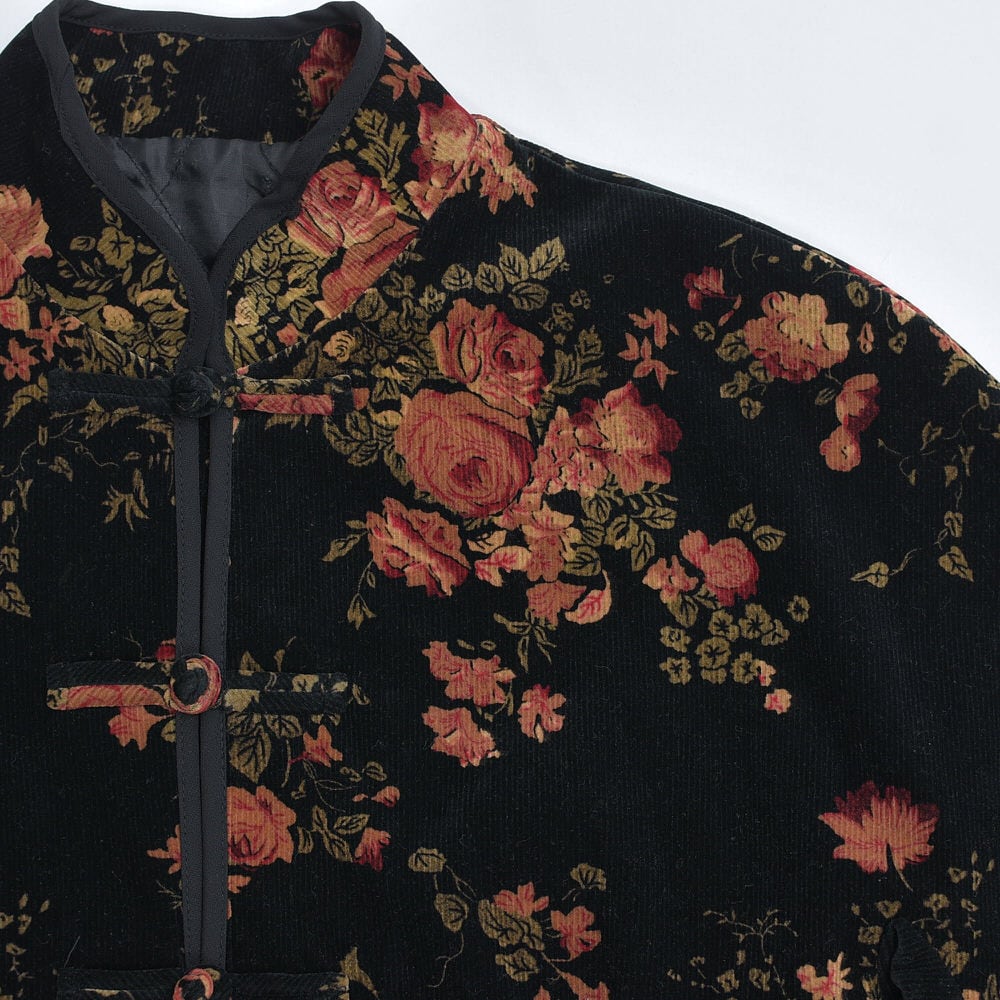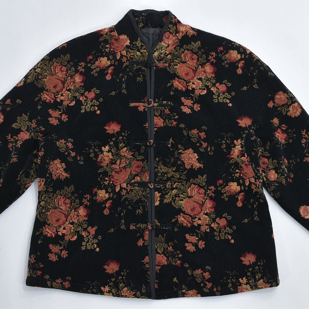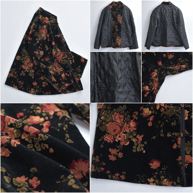 90〜00s China Jacket レトロフラワー デザイン コーデュロイ チャイナジャケット マンダリンジャケット 花柄 ローズ キルティング 中綿入り ブラック ヴィンテージ ビンテージ 古着 レディースL相当