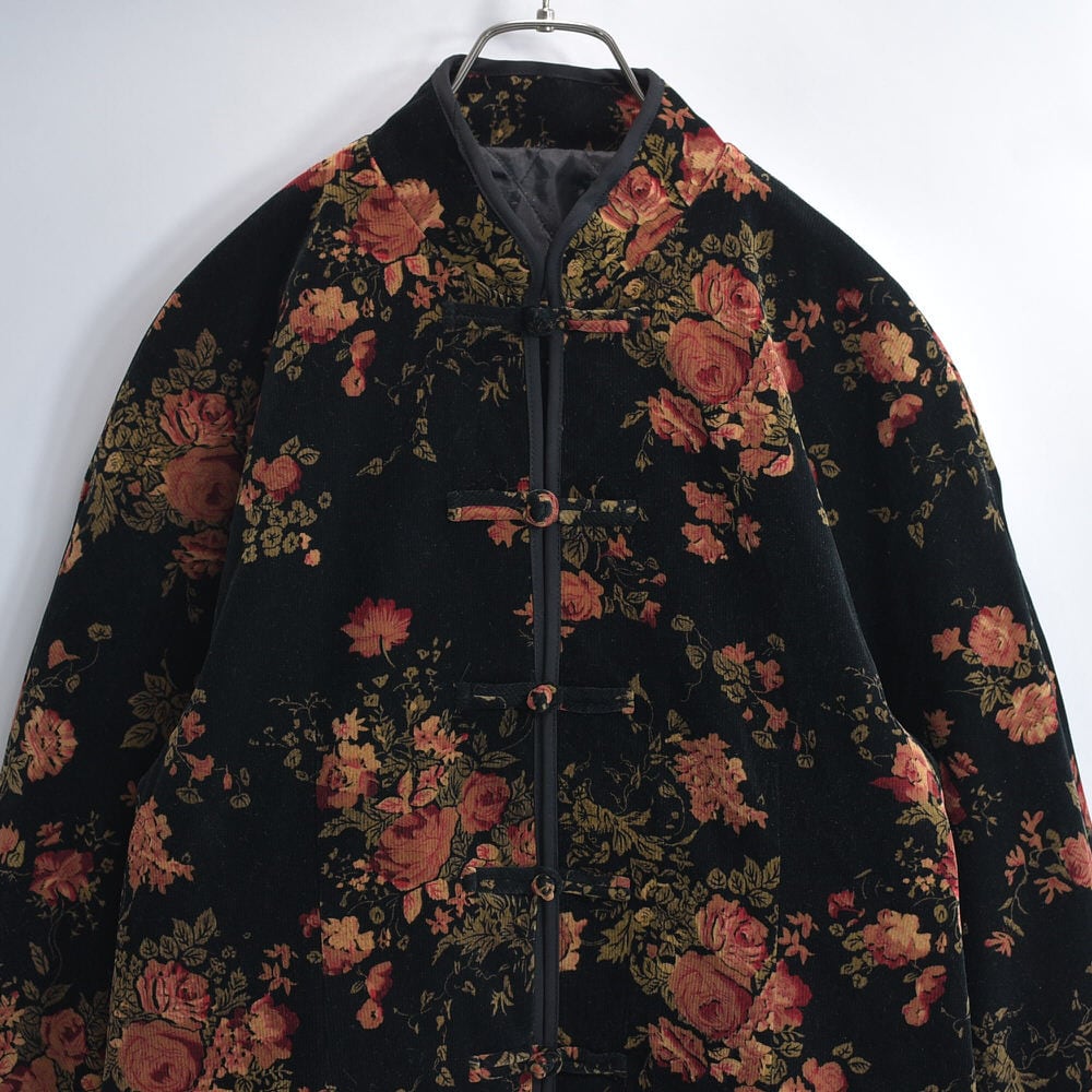 90~00s China Jacket レトロフラワー デザイン コーデュロイ チャイナジャケット マンダリンジャケット 花柄 ローズ キルティング 中綿入り ブラック ヴィンテージ ビンテージ 古着 レディースL相当