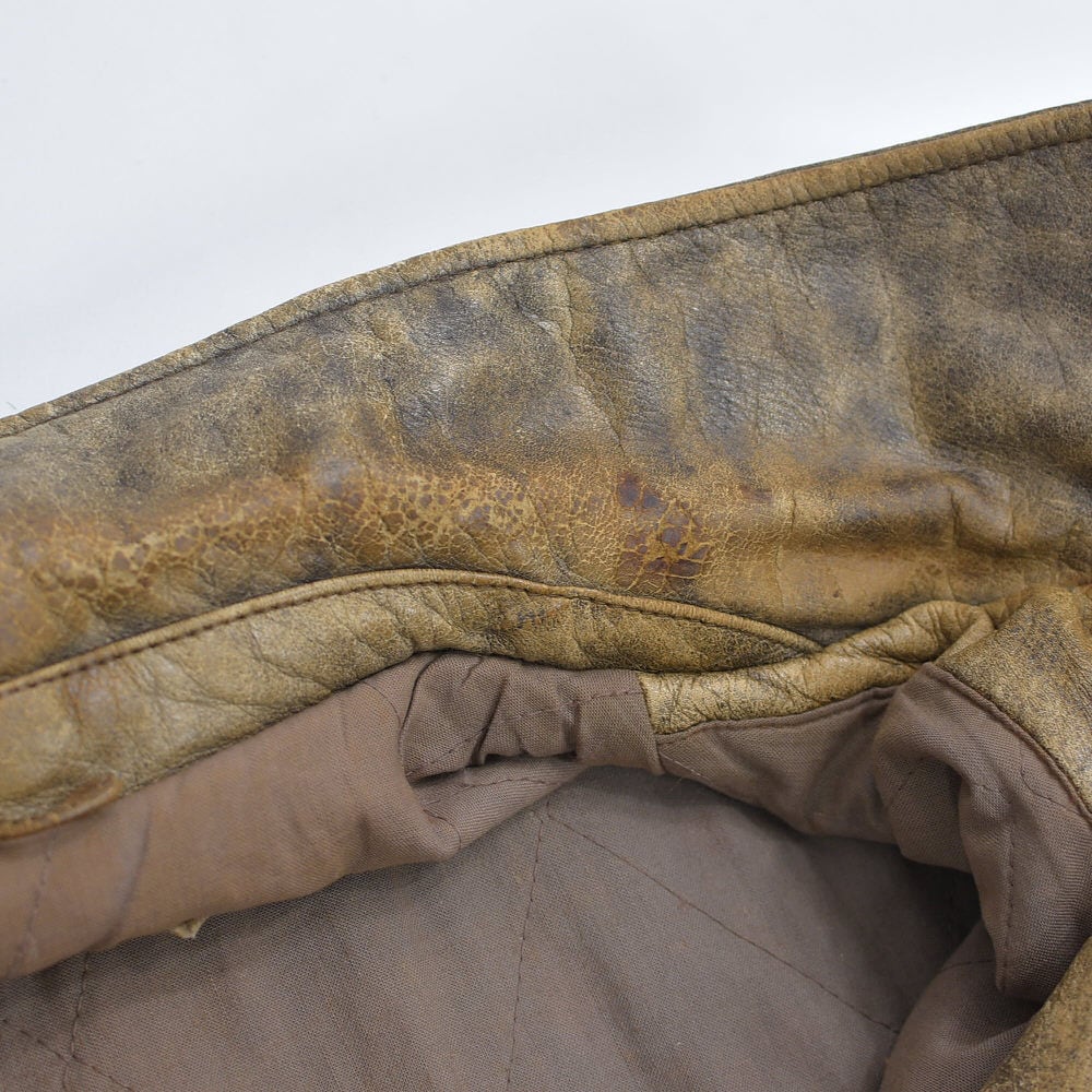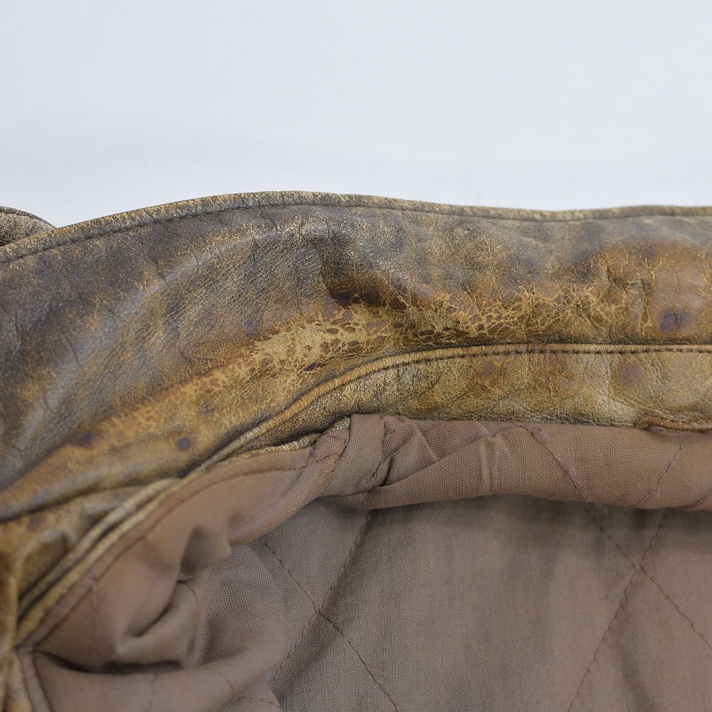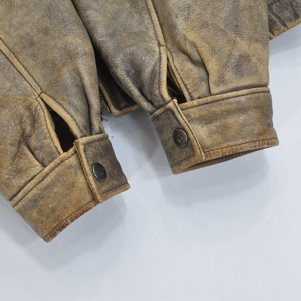 ・使用感や、経年による褪色や腕や背中のシミやキズ、汚れ、裏地の色褪せやステッチほつれ、襟の折り返し部分やカフス内側の汚れや、経年劣化によるひび割れやダメージなどありますが、着用に支障が出る汚れやダメージは見当たらず、汚れやダメージ、経年変化を雰囲気としてお楽しみ頂ける方におすすめのコンディションです