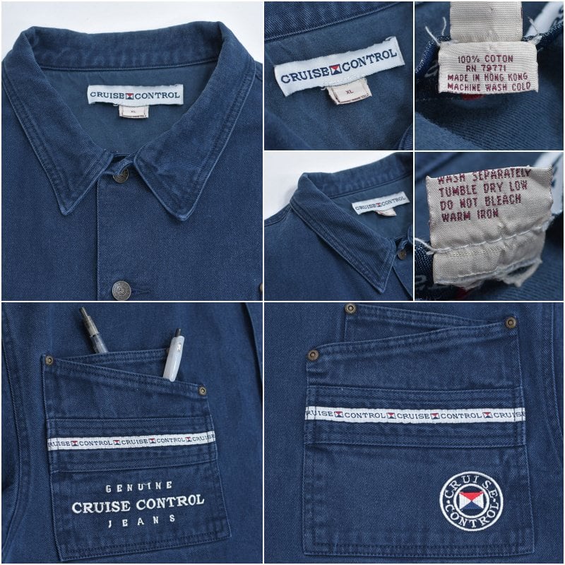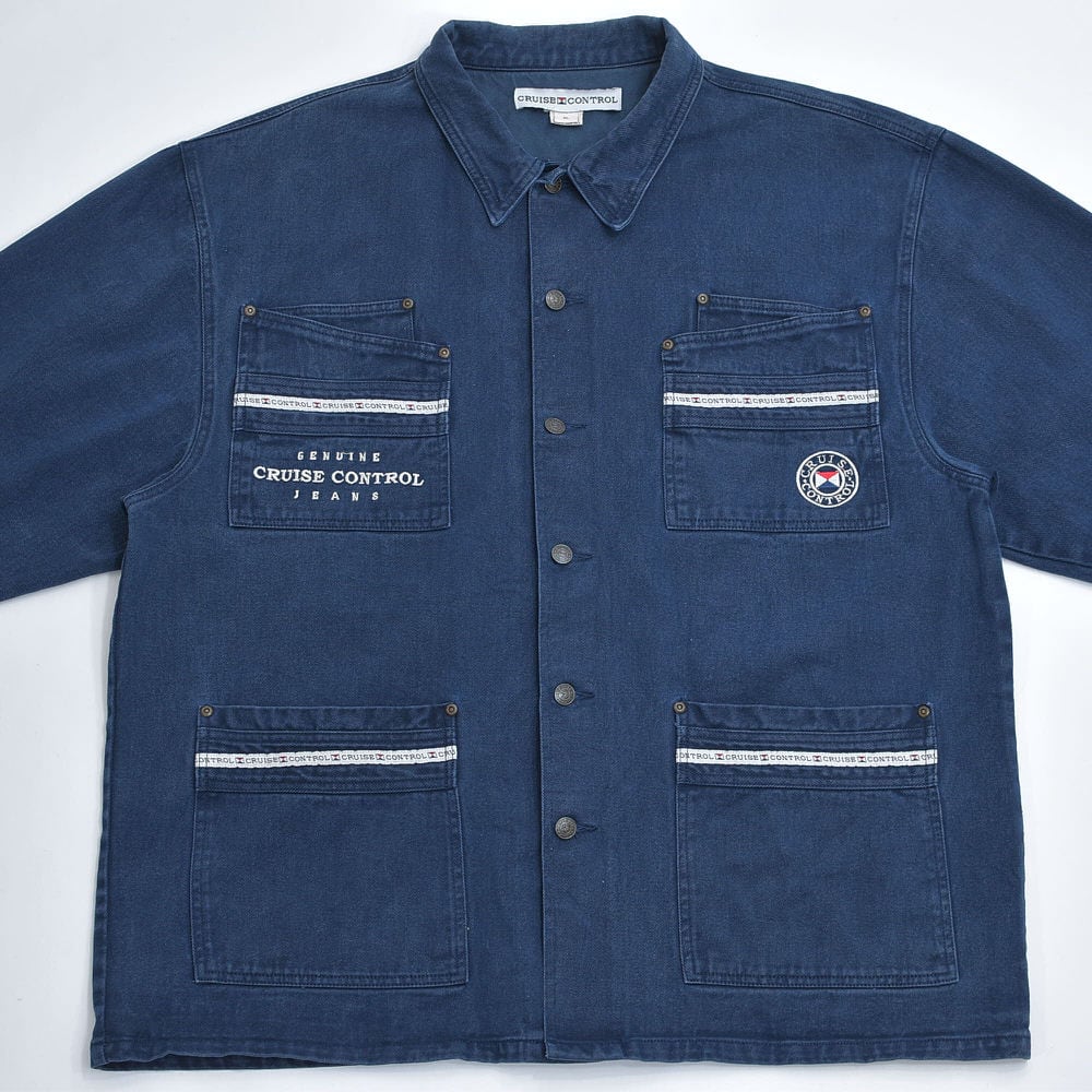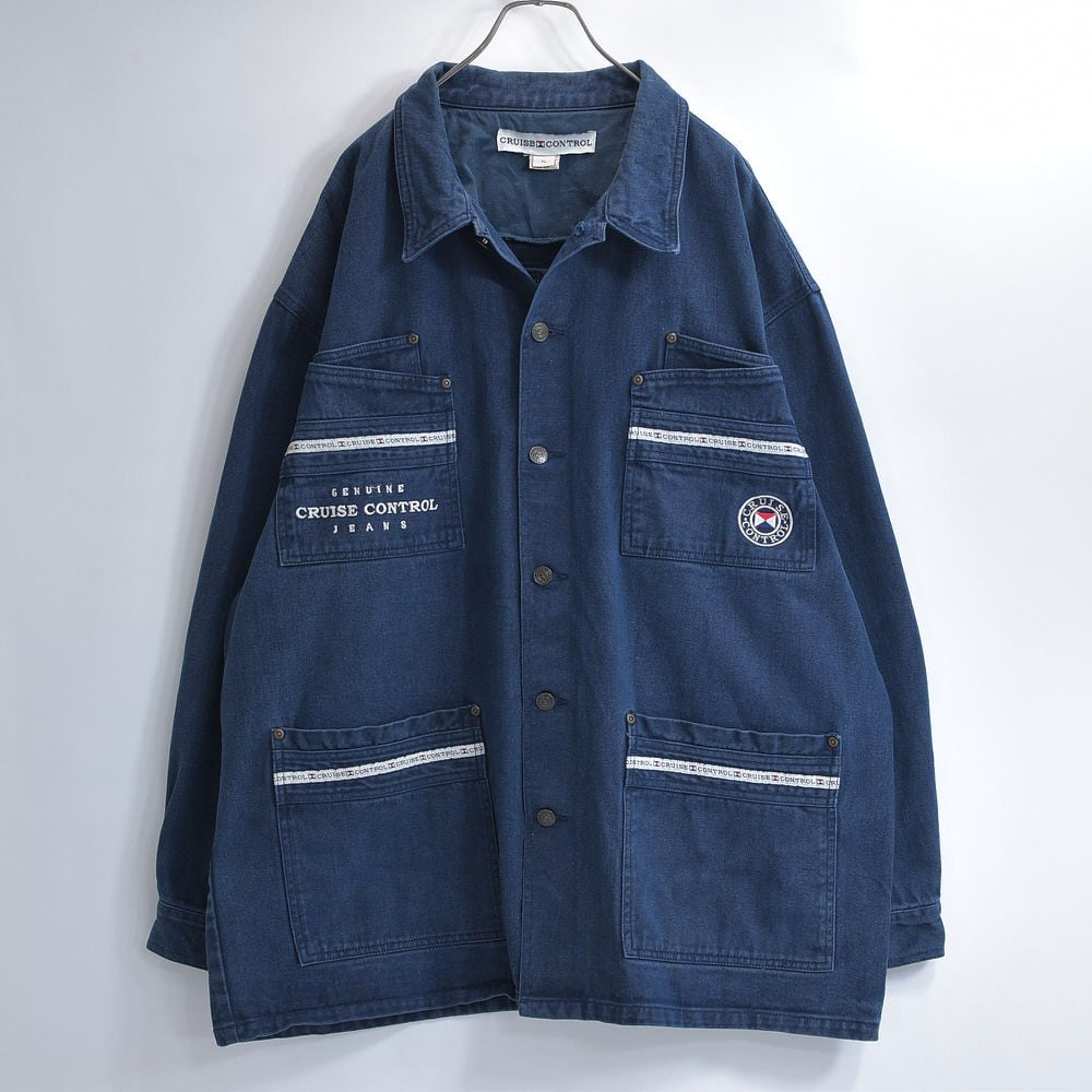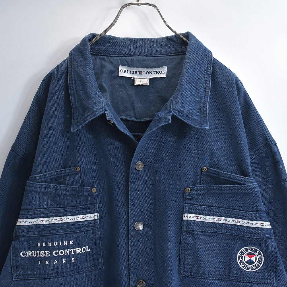 90s CRUISE CONTROL クルーズコントロール オーバーサイズ 4ポケット ロゴテープ ロゴワッペン 刺繍 デニム カバーオール ジャケット ブルー ヴィンテージ ビンテージ USA アメリカ古着 メンズXXL〜XXXL相当