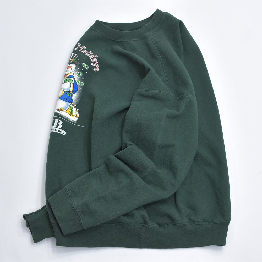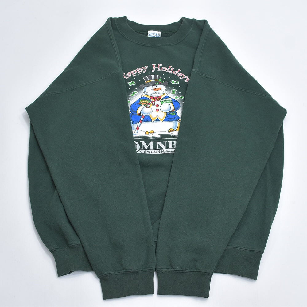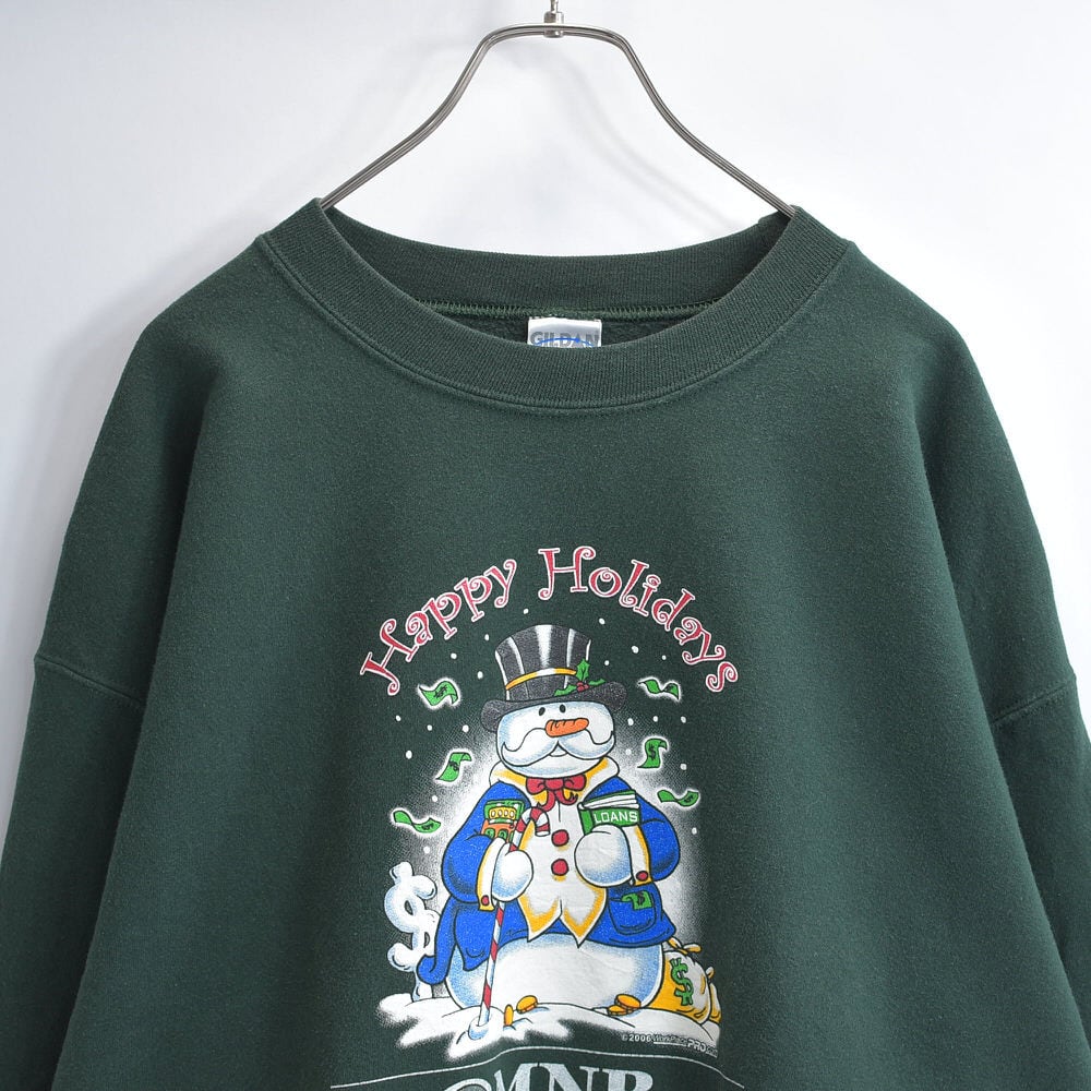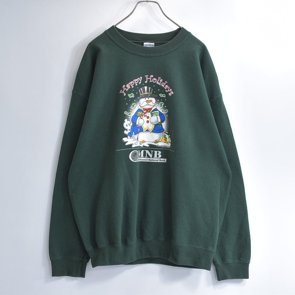 00s GILDAN ギルダン OMNB 銀行 企業系 スノーマン 雪だるま デザイン プリント スウェット アメカジ クリスマス ダークグリーン ヴィンテージ ビンテージ 古着 メンズLサイズ