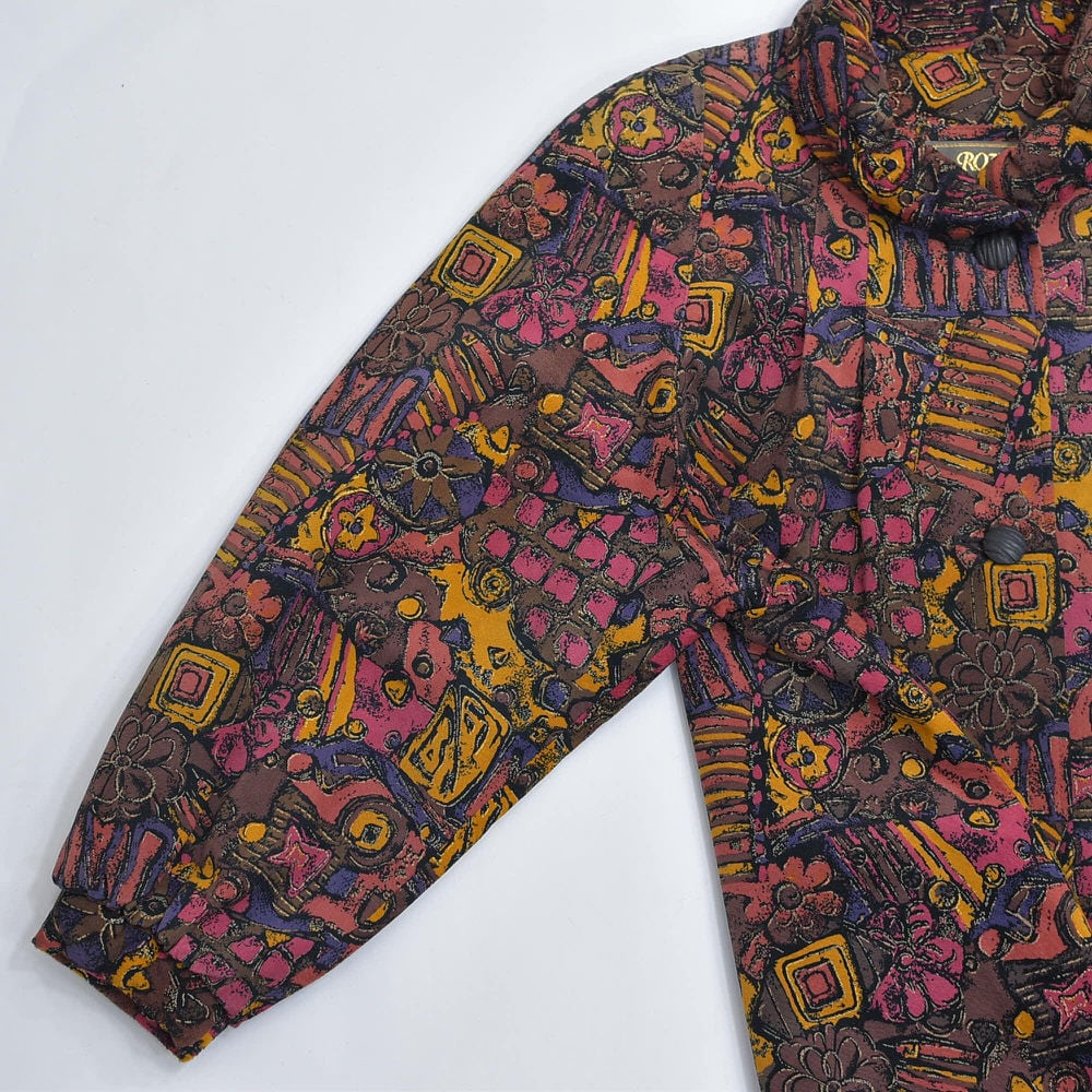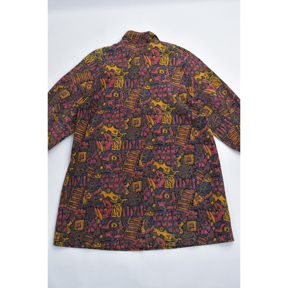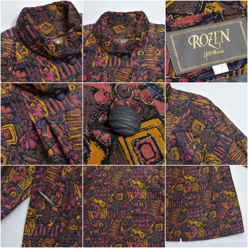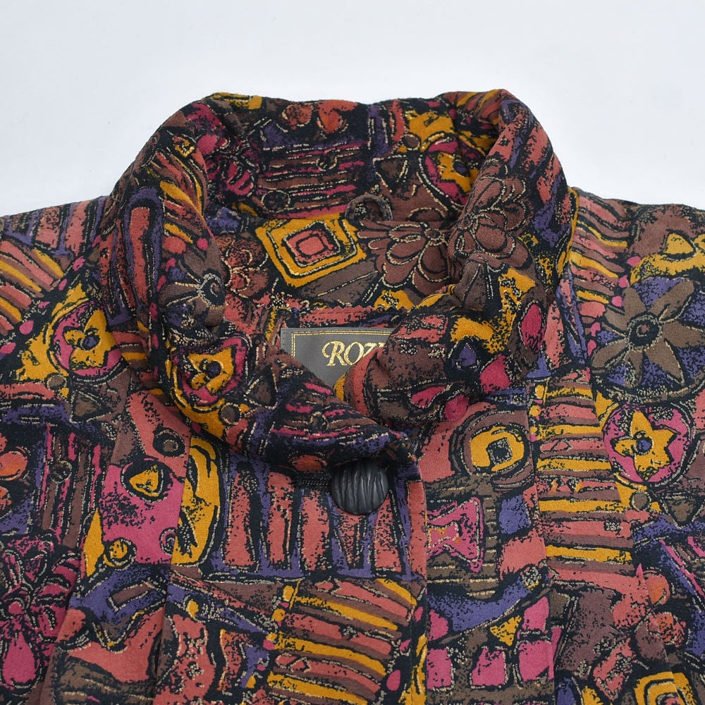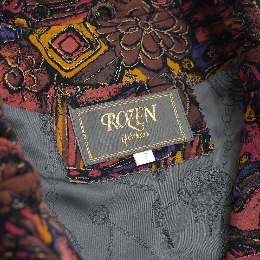 90s 日本製 ROZEN yokohama ピッグスキン アート プリント レザーコート 本革 ロングコート 総柄 幾何学模様 フラワー レトロ Aライン ジャパンヴィンテージ ビンテージ 古着 レディースフリーサイズL〜XL相当