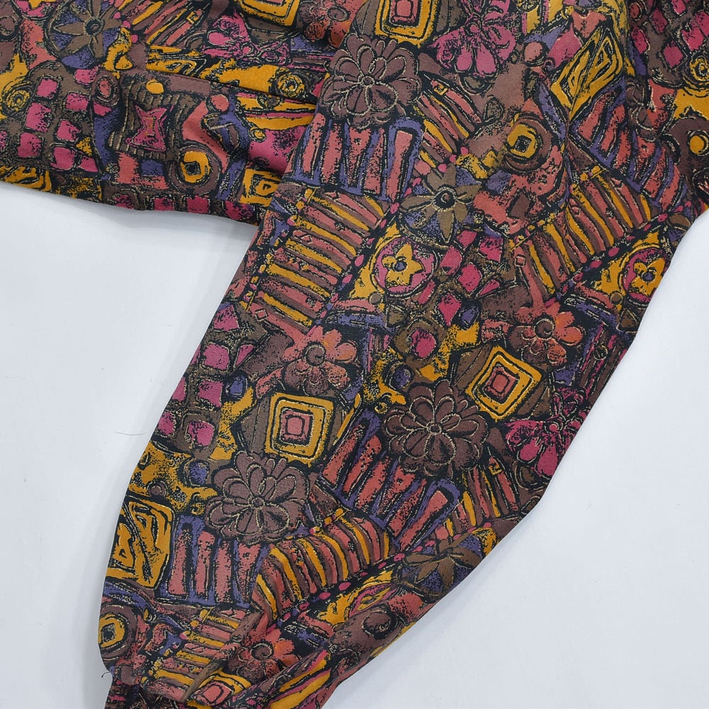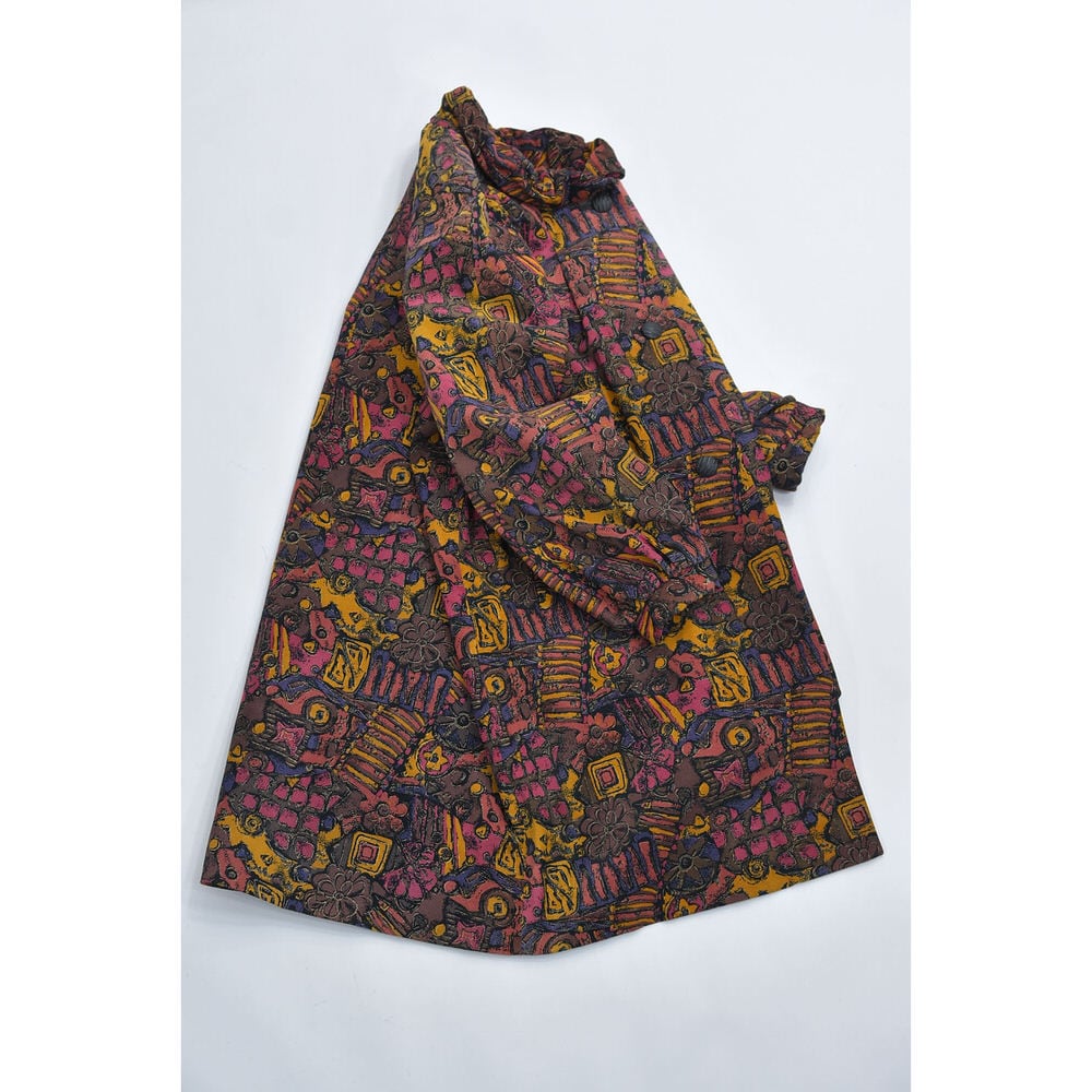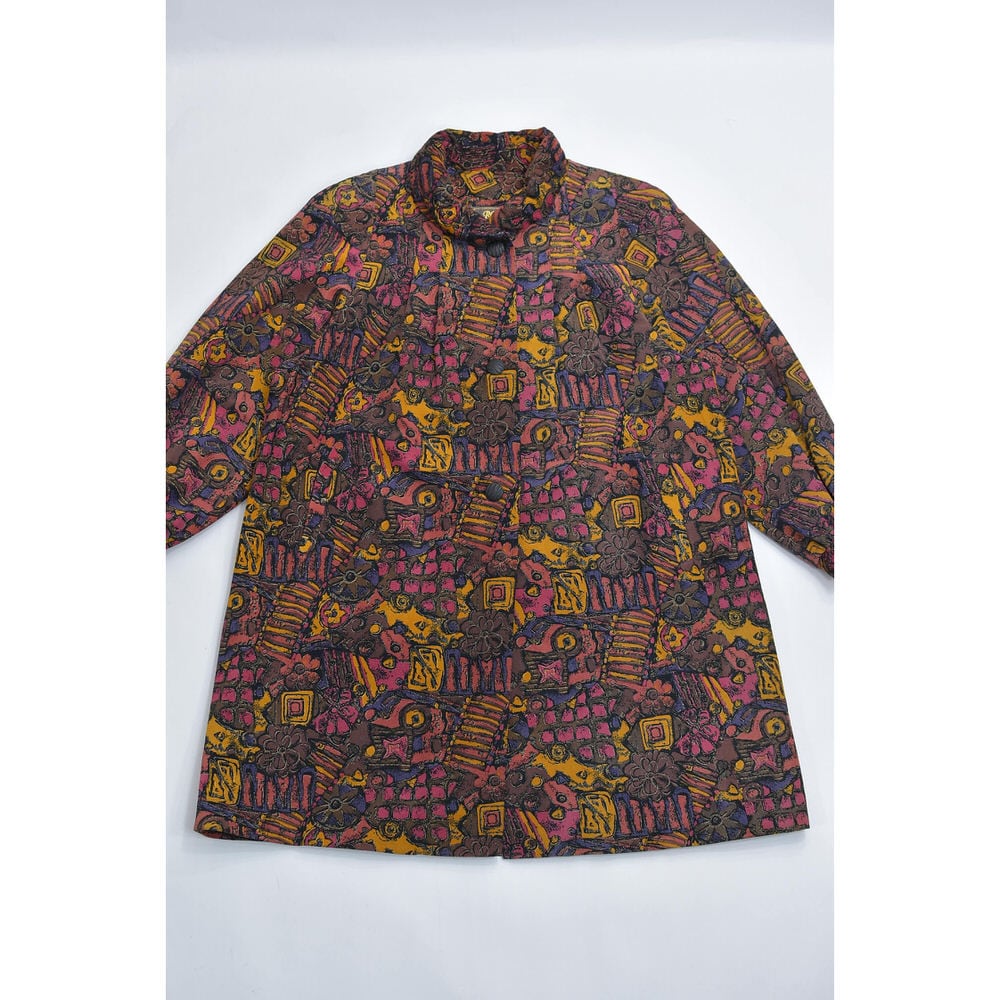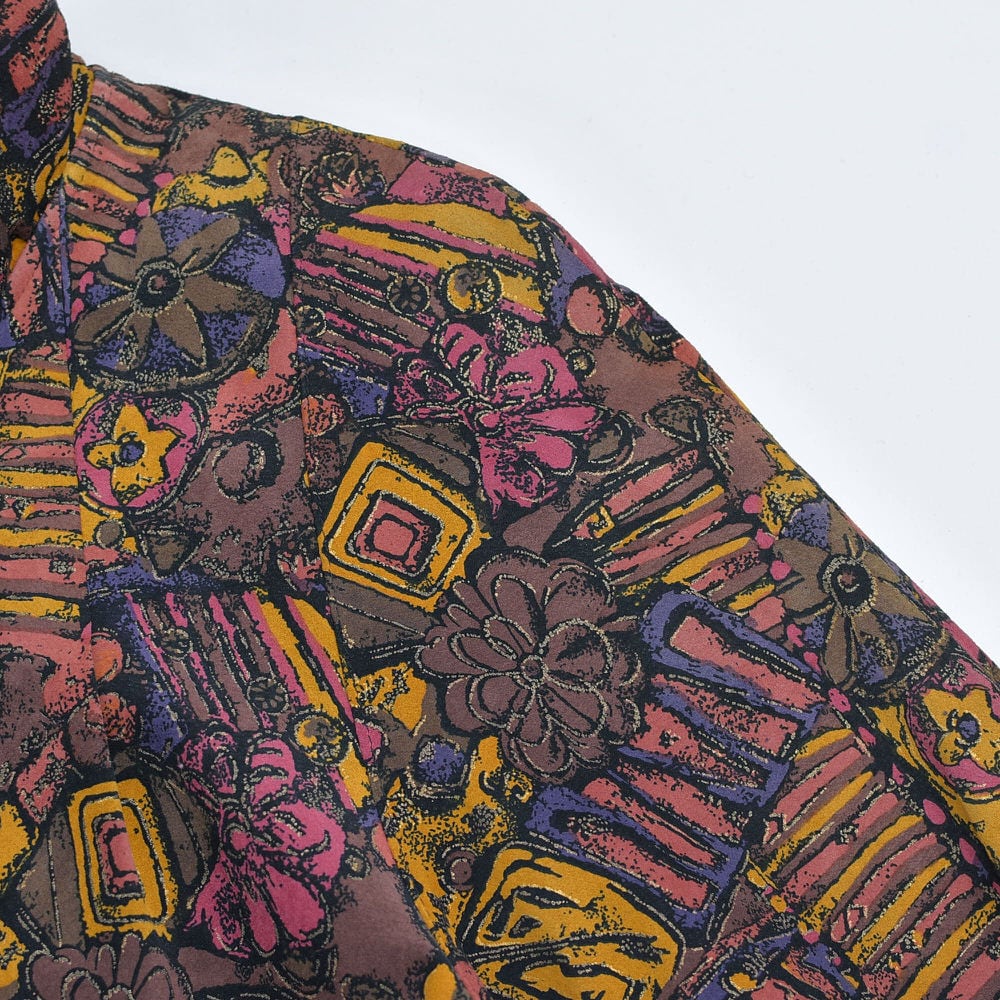 90s 日本製 ROZEN yokohama ピッグスキン アート プリント レザーコート 本革 ロングコート 総柄 幾何学模様 フラワー レトロ Aライン ジャパンヴィンテージ ビンテージ 古着 レディースフリーサイズL〜XL相当