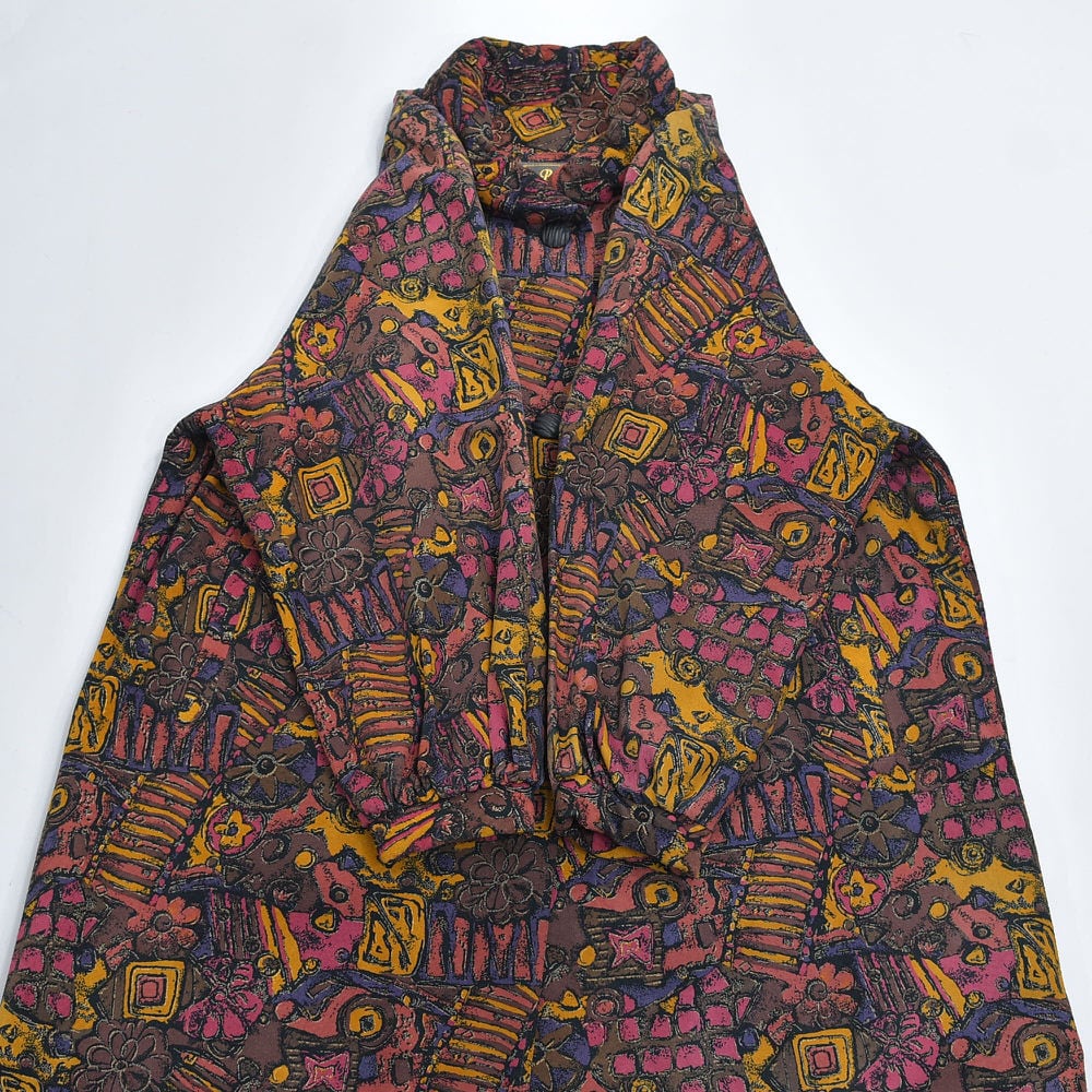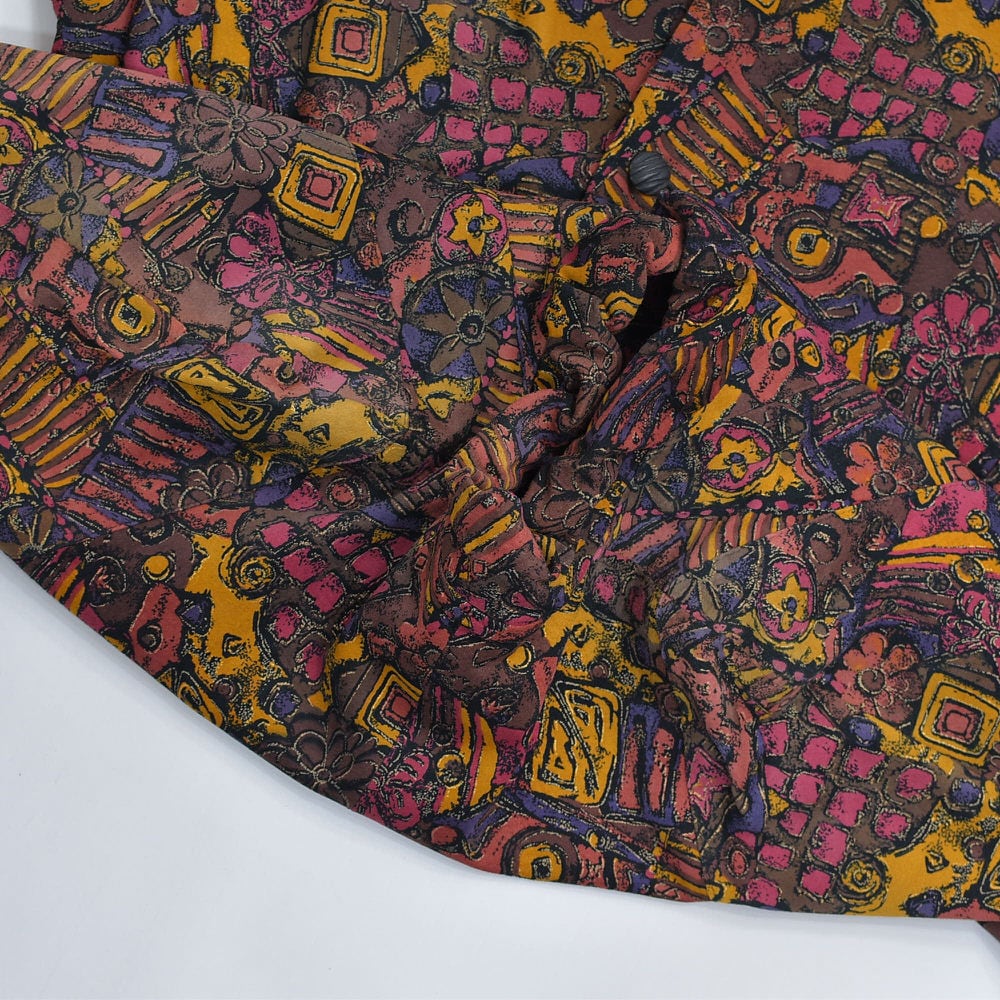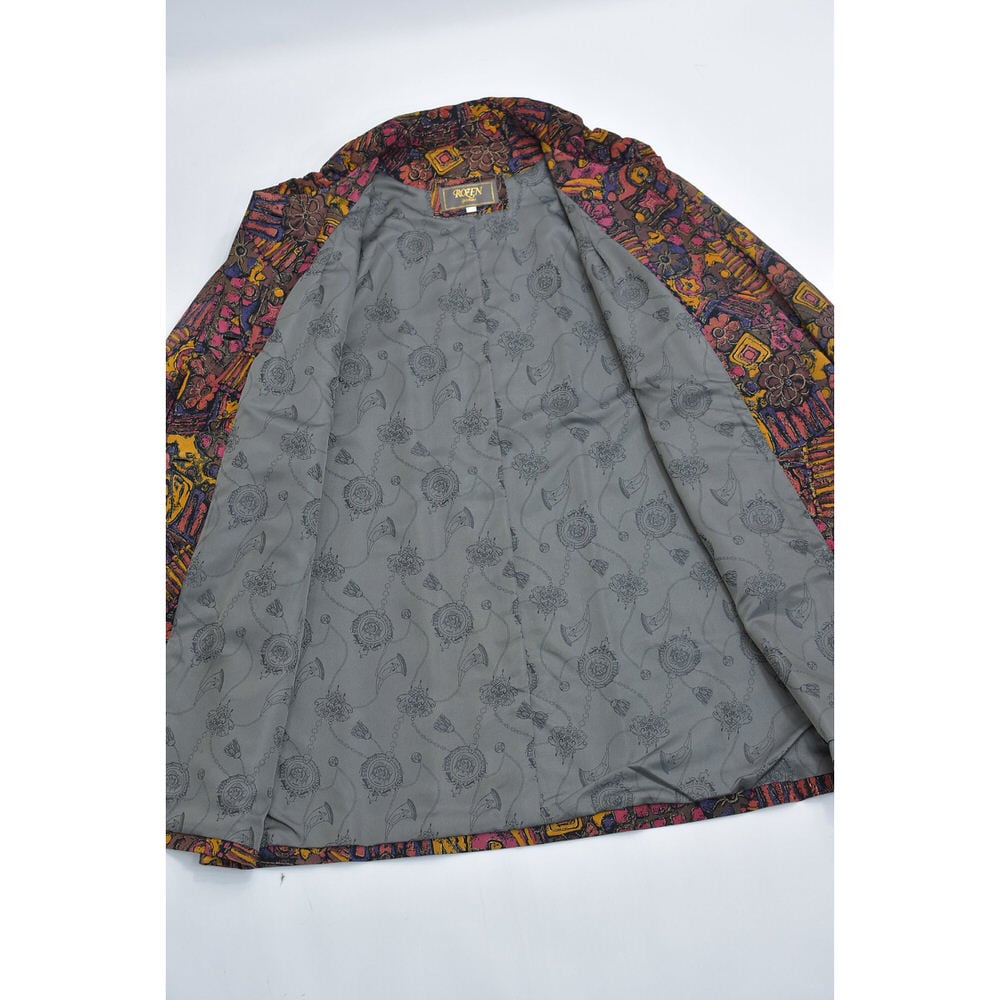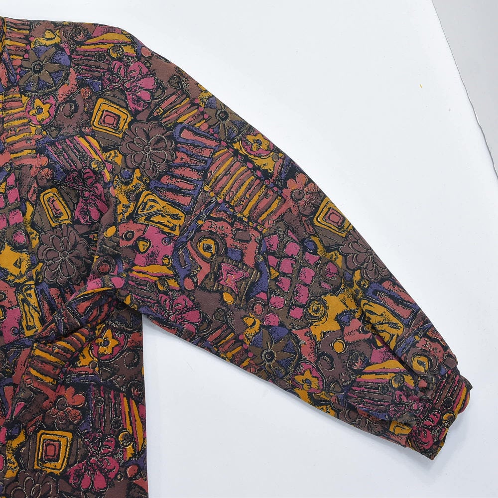 90s 日本製 ROZEN yokohama ピッグスキン アート プリント レザーコート 本革 ロングコート 総柄 幾何学模様 フラワー レトロ Aライン ジャパンヴィンテージ ビンテージ 古着 レディースフリーサイズL〜XL相当