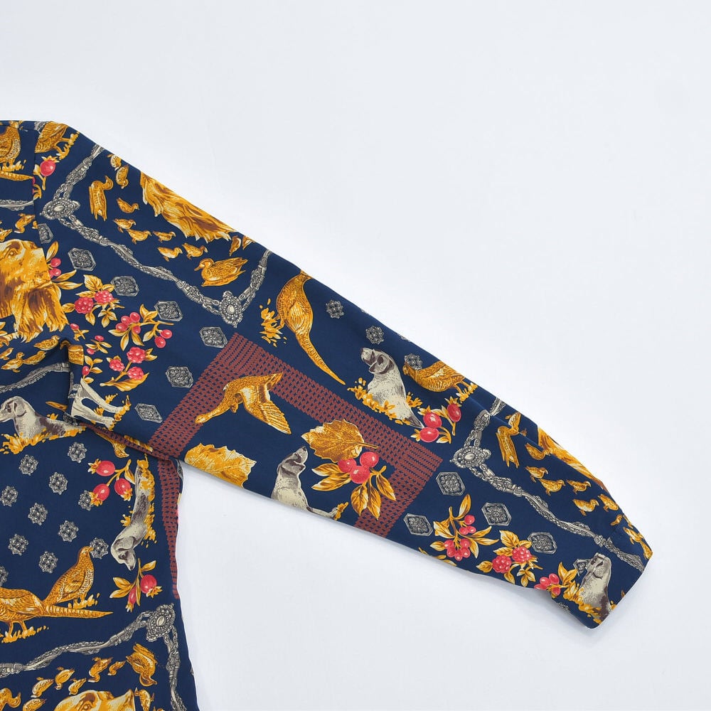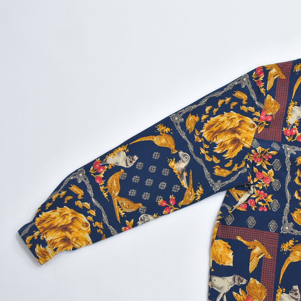 80~90s 日本製 312 アンティーク調 スカーフ柄 総柄 ポリエステル シャツ ブラウス アニマル柄 犬 鳥 ドッグ柄 ネイビー ジャパンヴィンテージ ビンテージ 国産古着 レディースMサイズ
