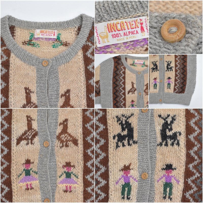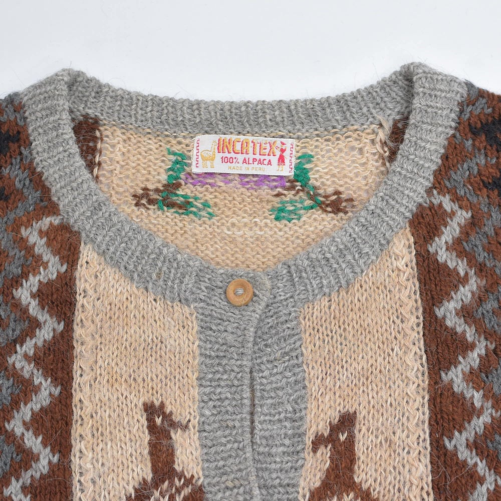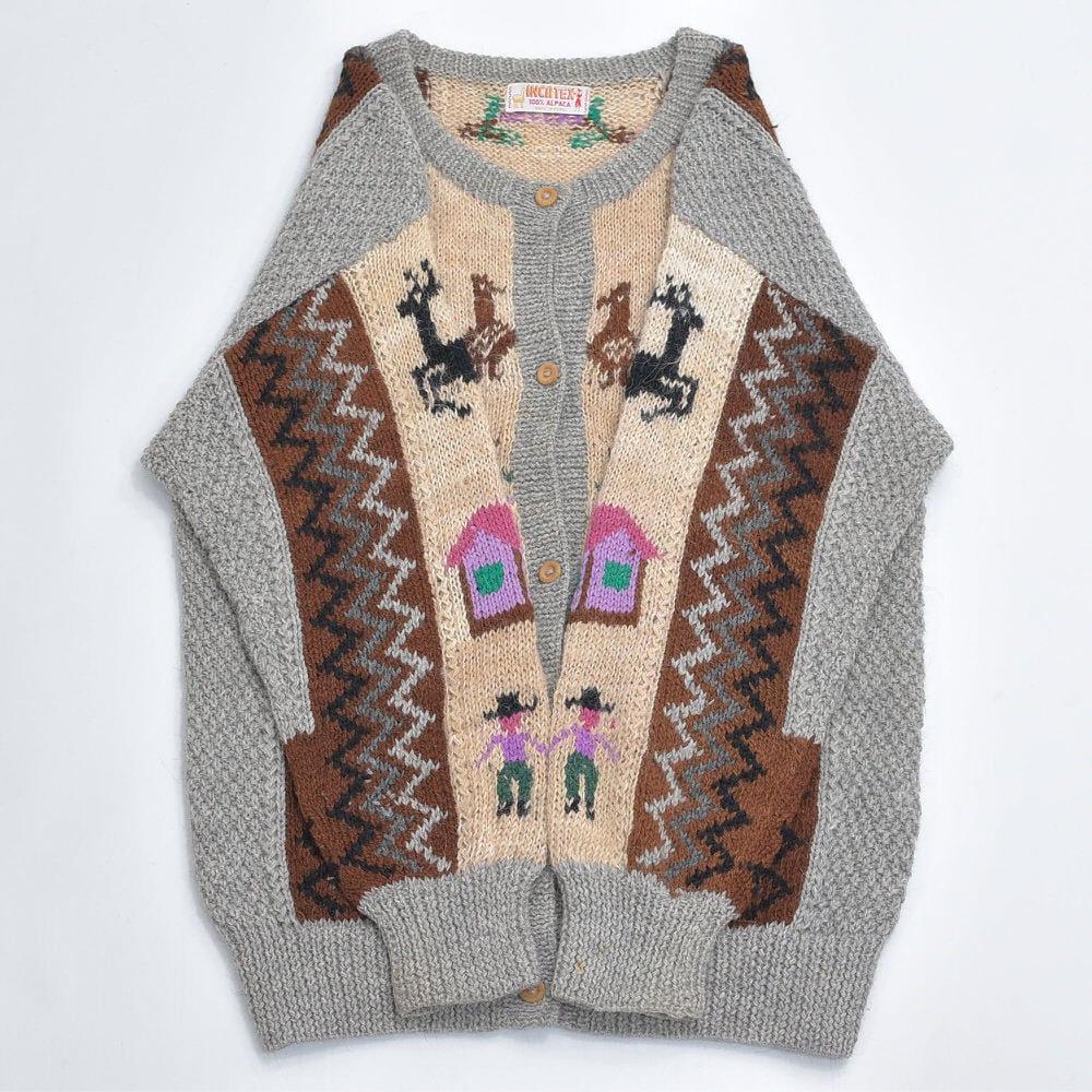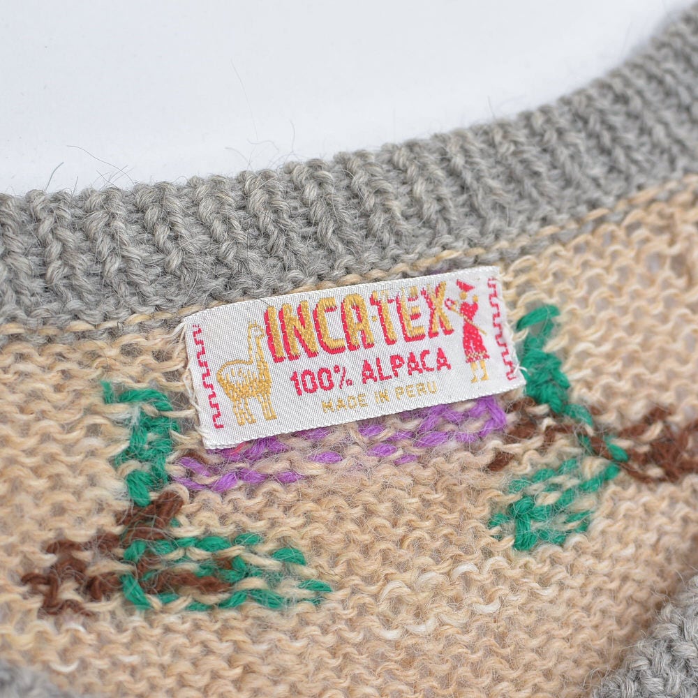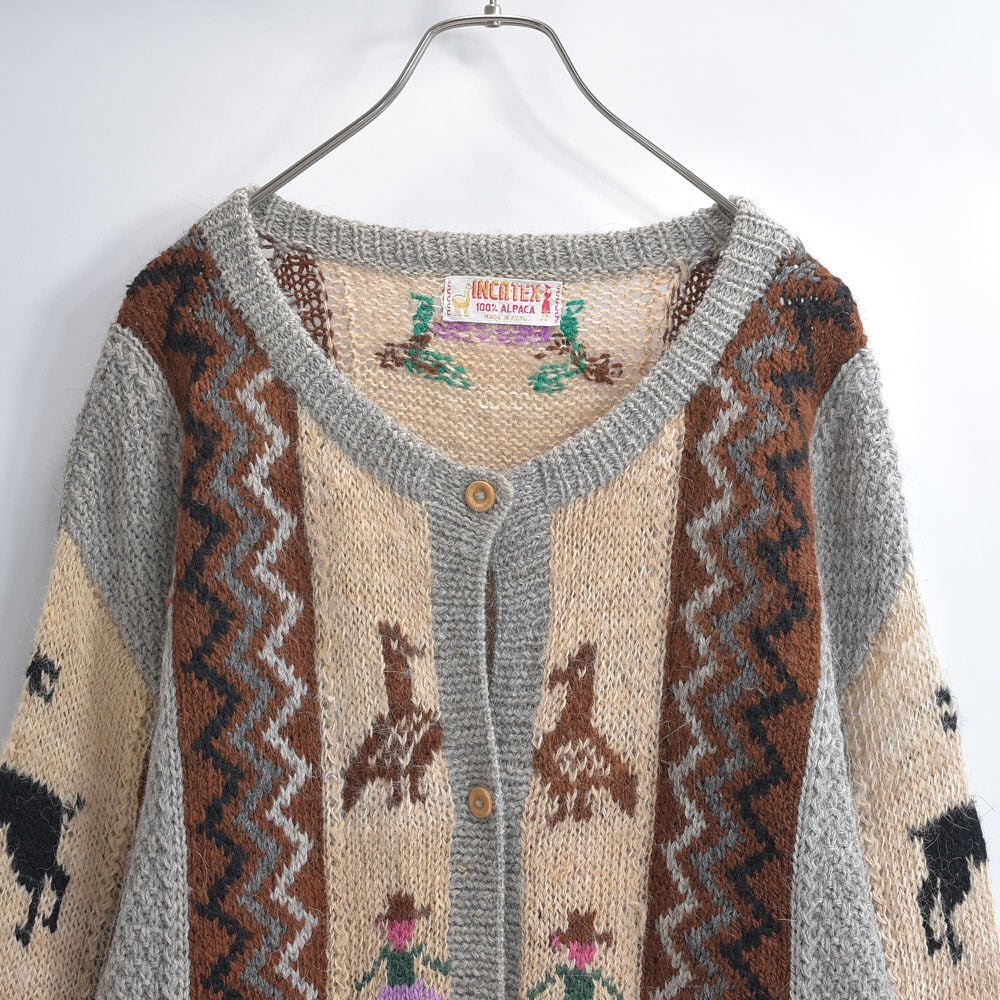 80〜90s INCATEX インカテックス モチーフデザイン アルパカ ウール ニット カーディガン セーター ペルー製 ハンドニット ベージュ 手編み ヴィンテージ ビンテージ 古着 レディースXL相当