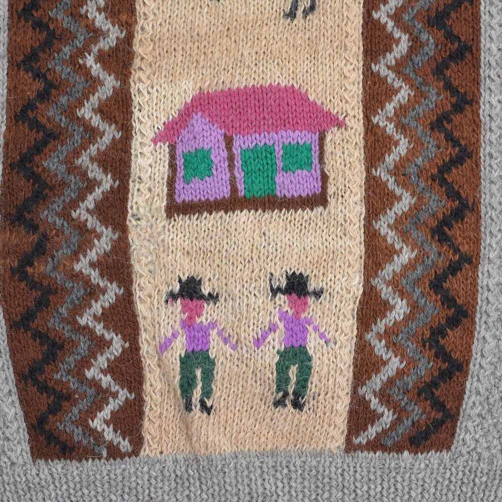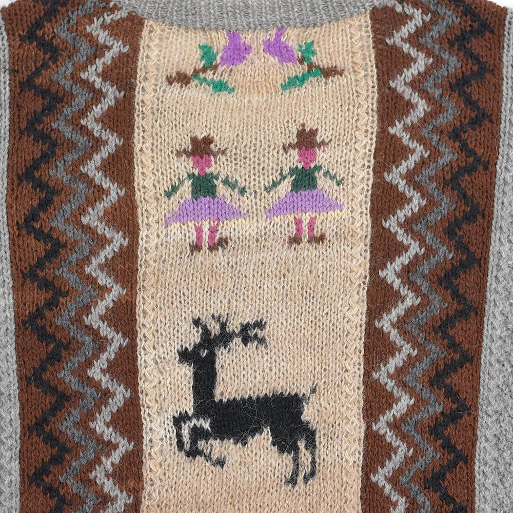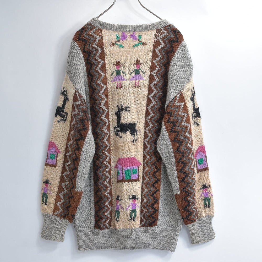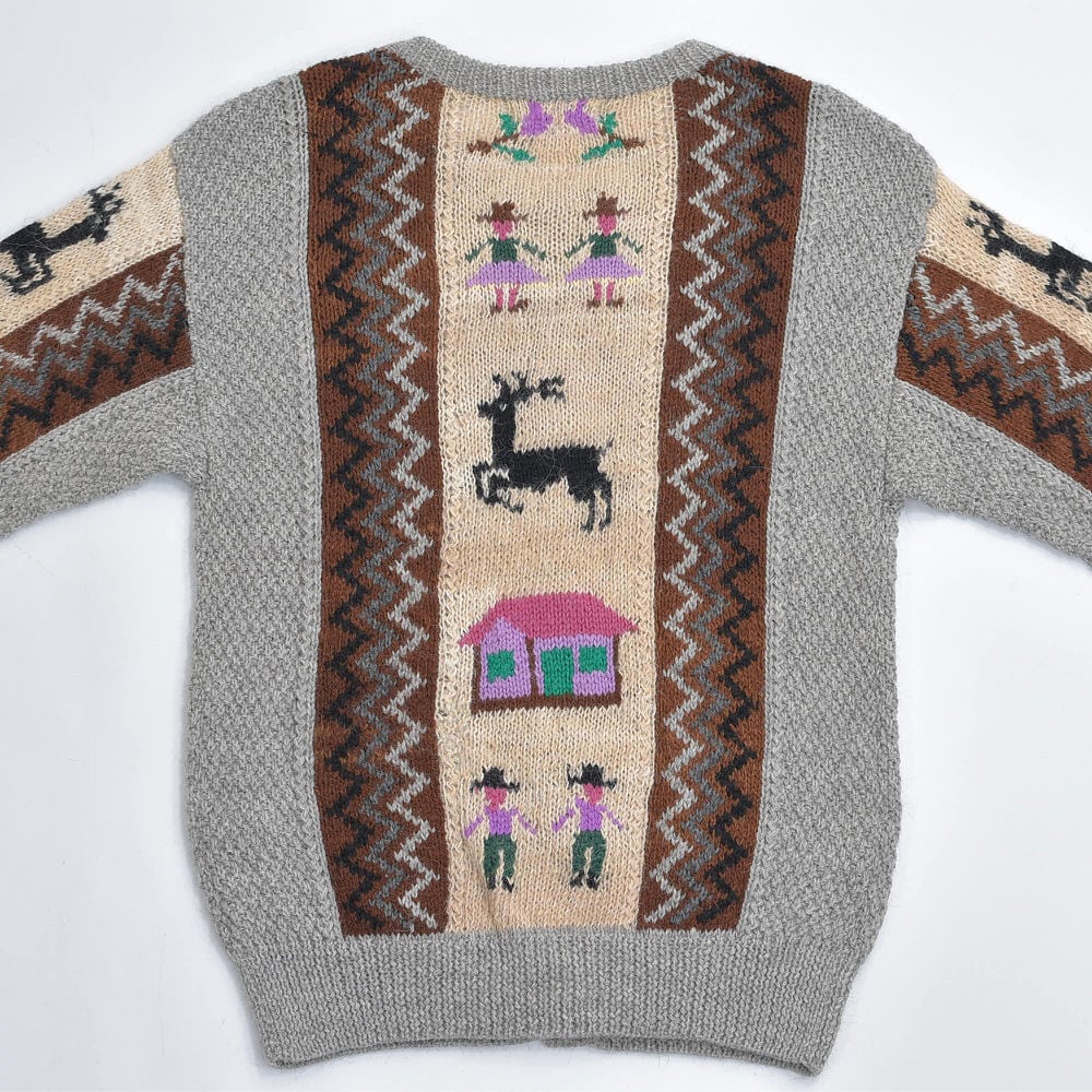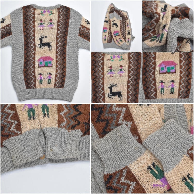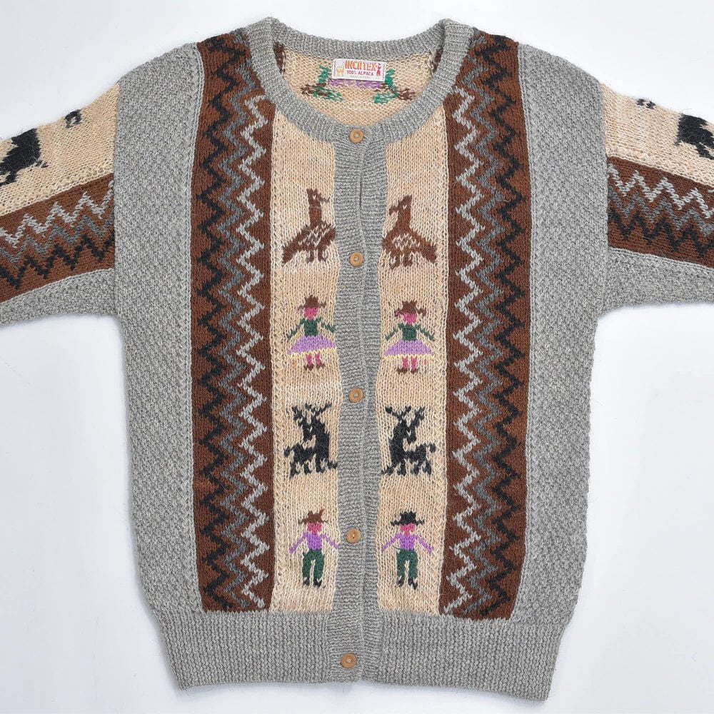 80~90s INCATEX インカテックス モチーフデザイン アルパカ ウール ニット カーディガン セーター ペルー製 ハンドニット ベージュ 手編み ヴィンテージ ビンテージ 古着 レディースXL相当