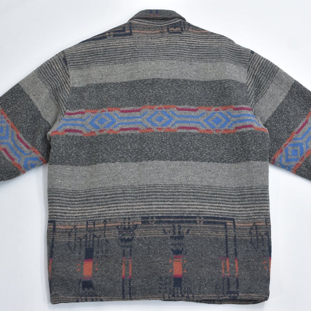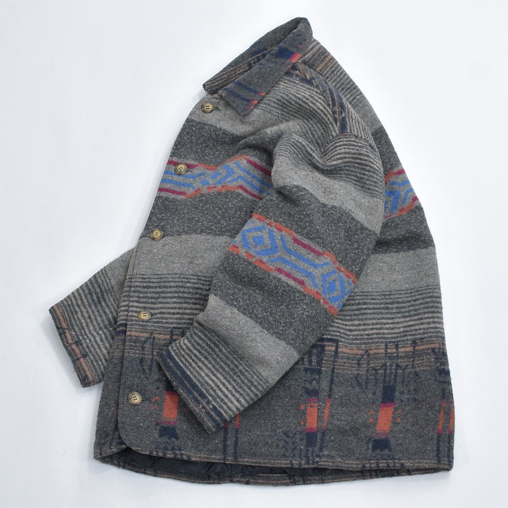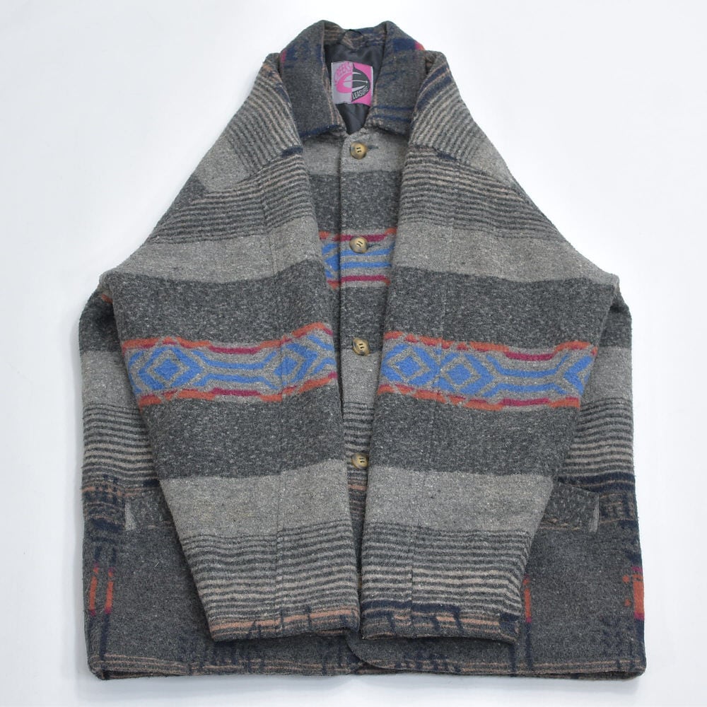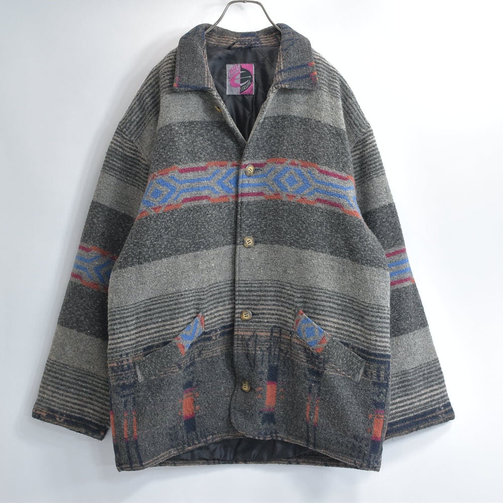 80~90s CREEKS クリークス ネイティブ柄 ウール ジャケット ブランケット コート アウター 中綿入り グレー キリム オルテガ トライバル ヴィンテージ ビンテージ 古着 メンズL~XL相当