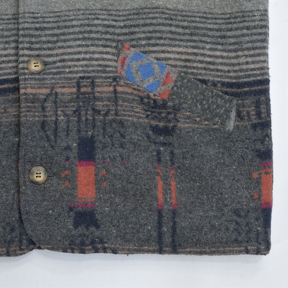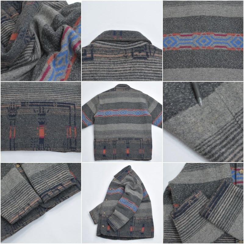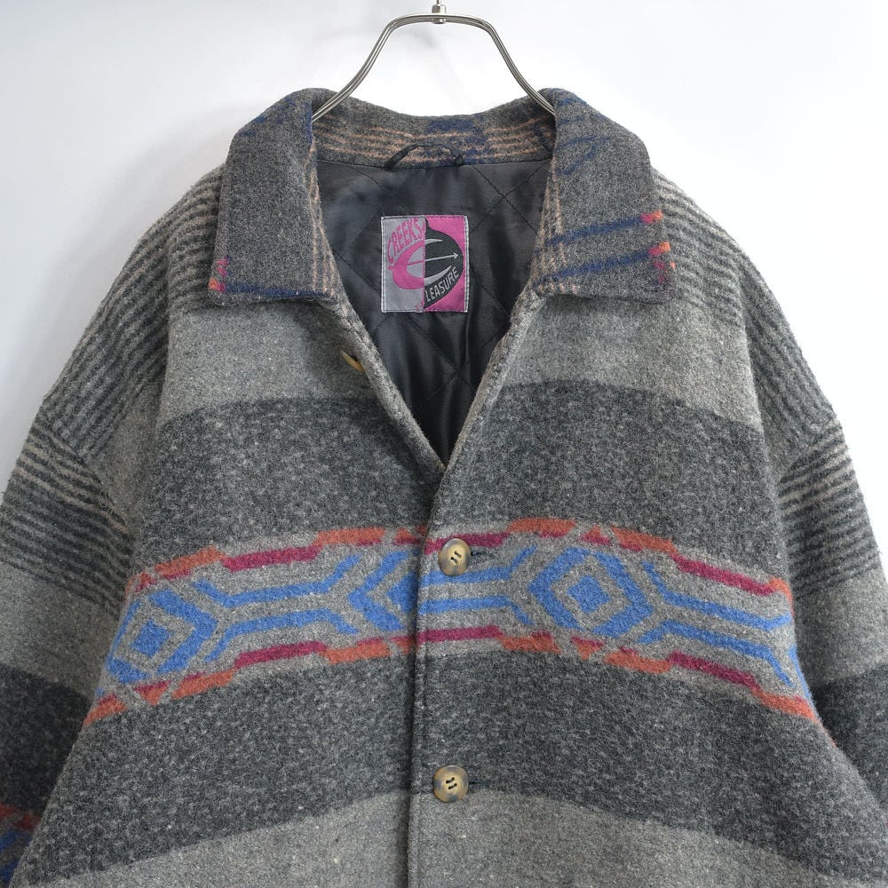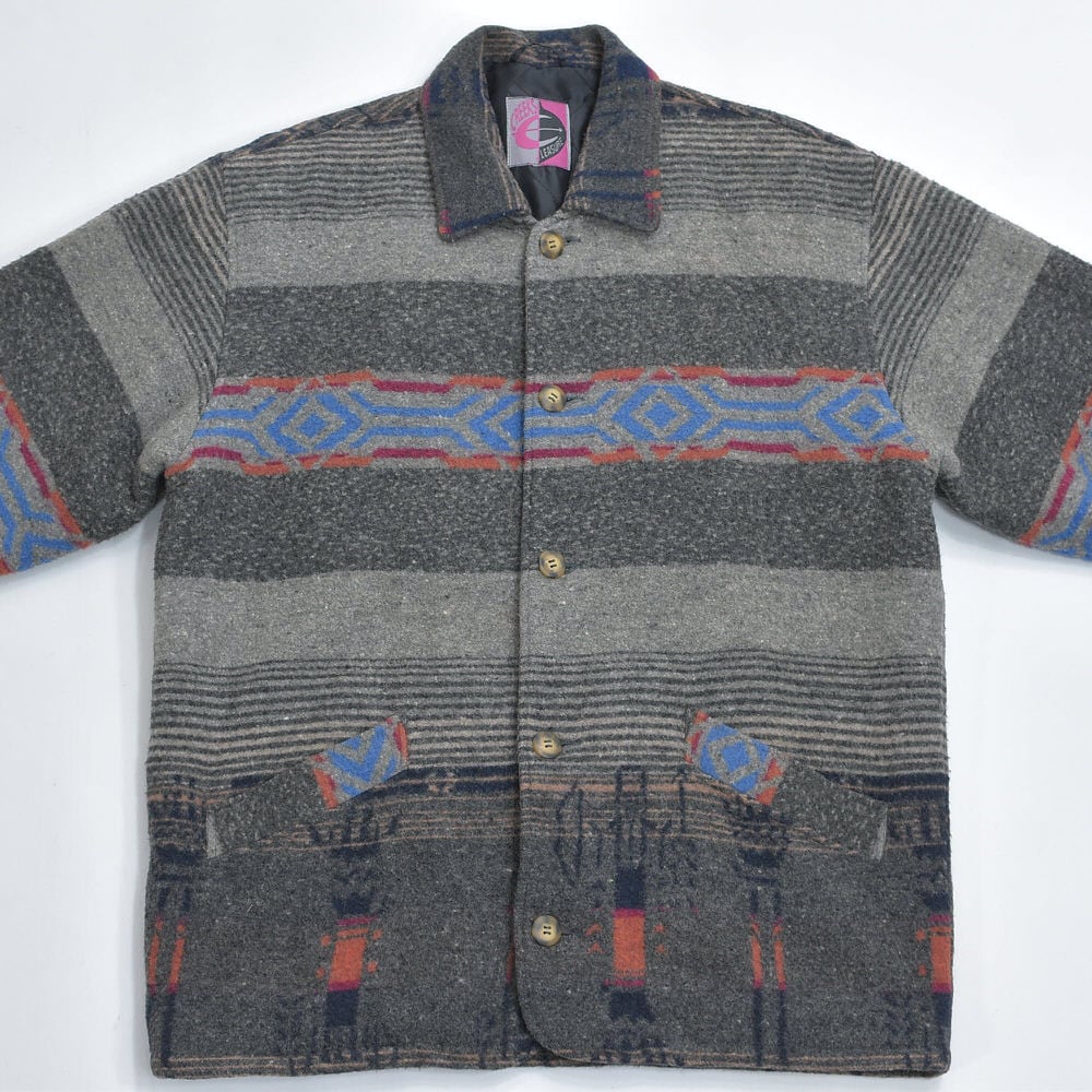 80~90s CREEKS クリークス ネイティブ柄 ウール ジャケット ブランケット コート アウター 中綿入り グレー キリム オルテガ トライバル ヴィンテージ ビンテージ 古着 メンズL~XL相当