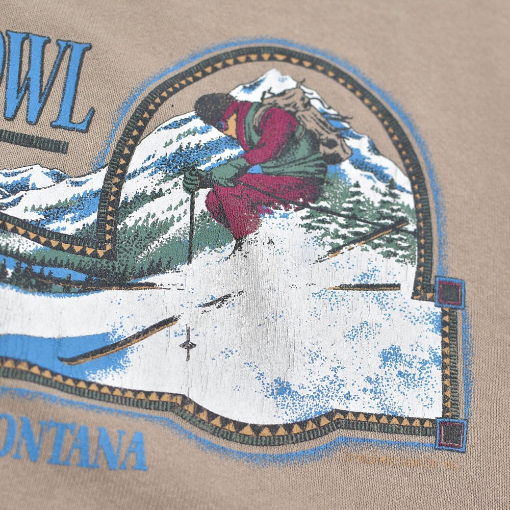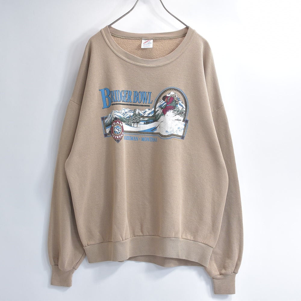 90s USA製 JERZEES ジャージーズ ブリッジャーボウル スキー プリント スウェット トレーナー プルオーバー モンタナ ベージュ ヴィンテージ ビンテージ アメリカ古着 メンズXL相当