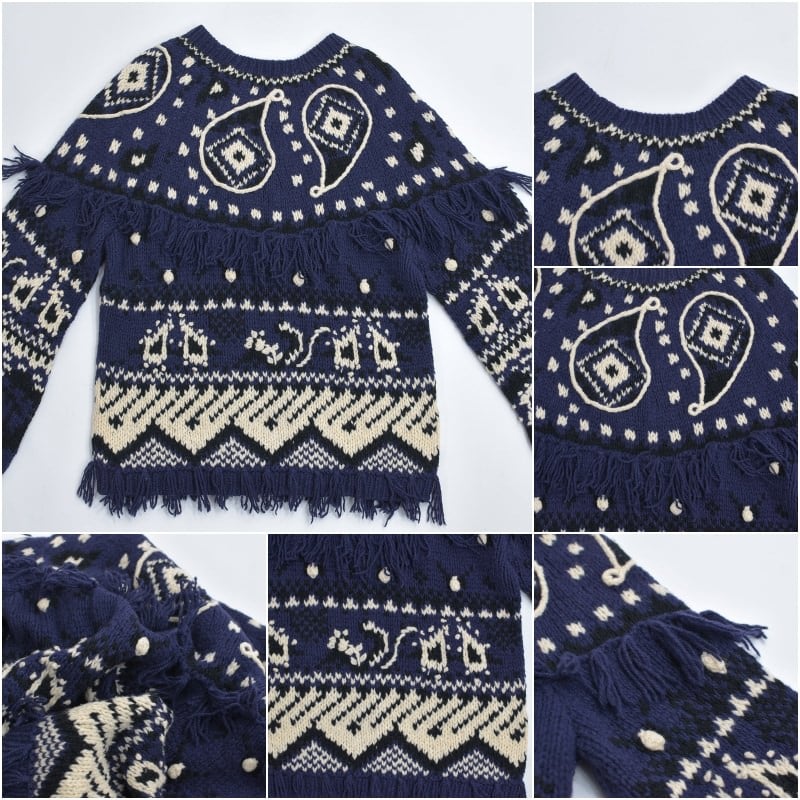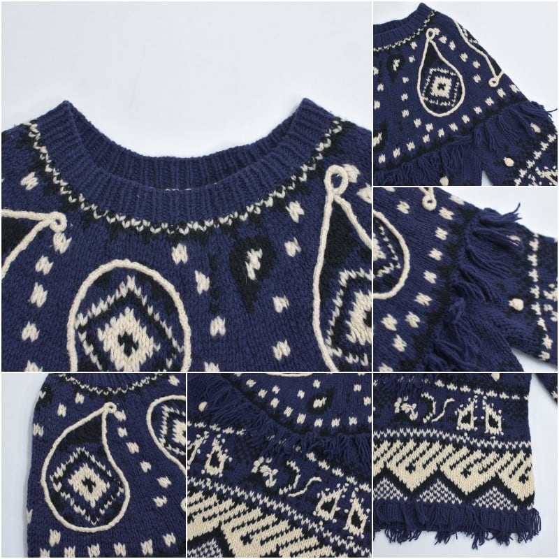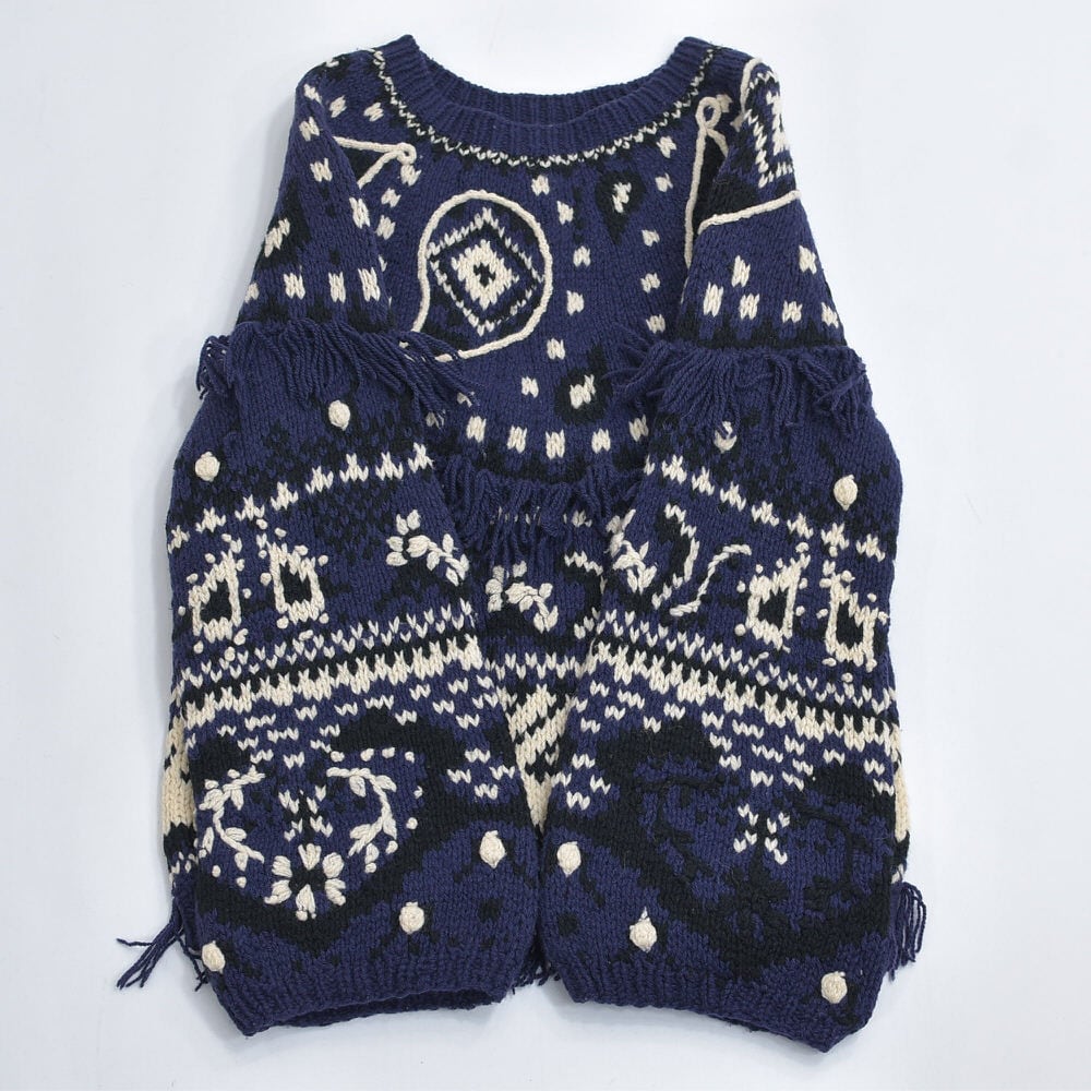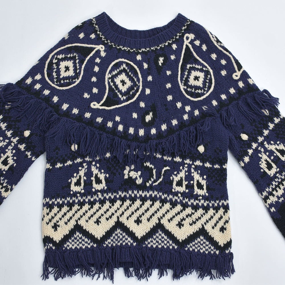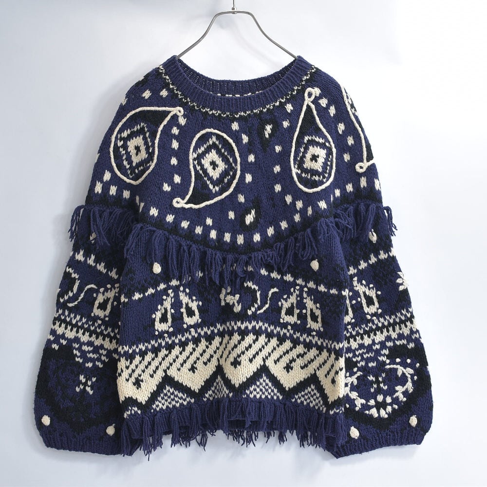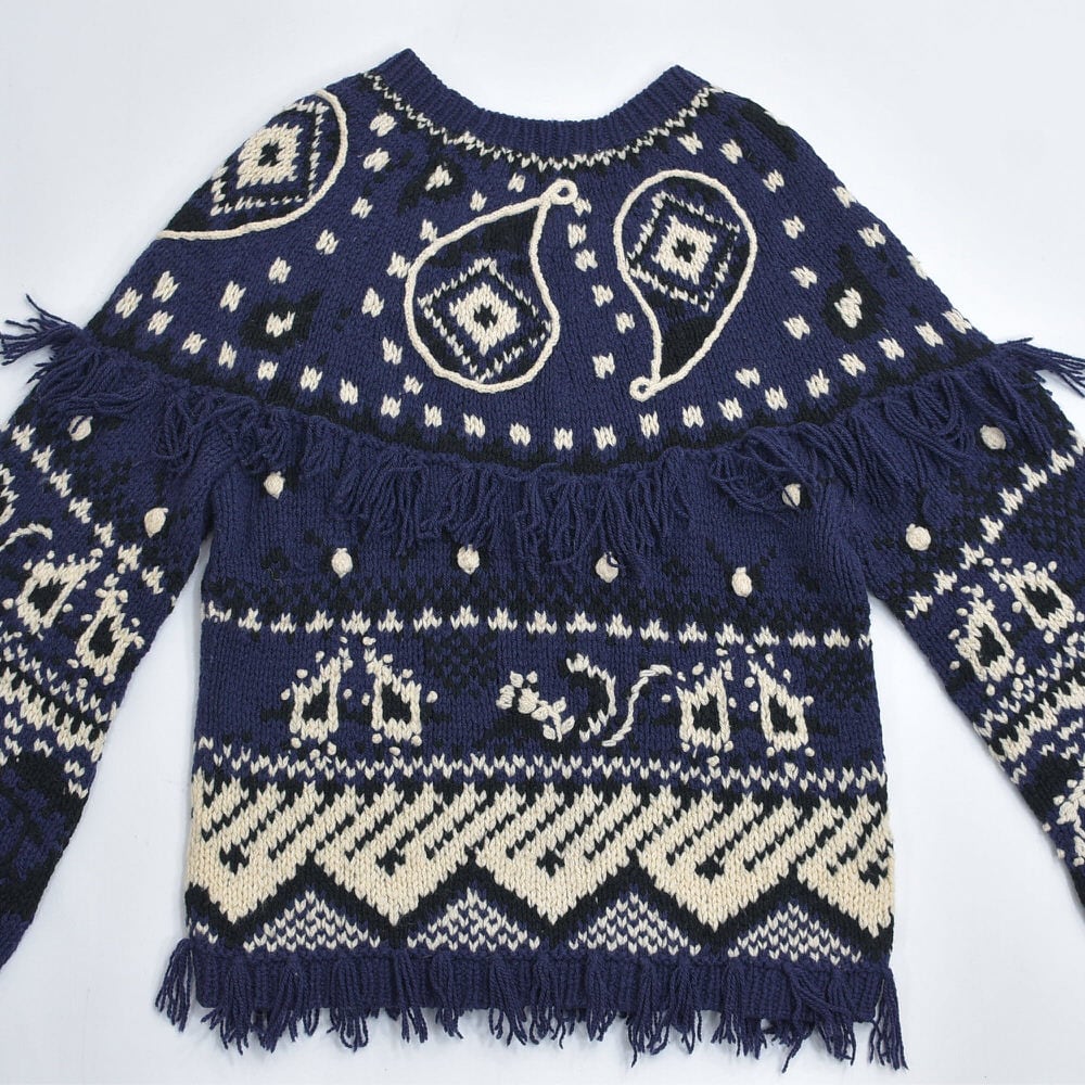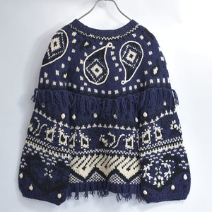 Hand Made ハンドメイド ペイズリー柄 フリンジクデザイン フレアスリーブ クルーネックニット セーター 幾何学模様 ヴィンテージ ビンテージ 古着 レディースM相当