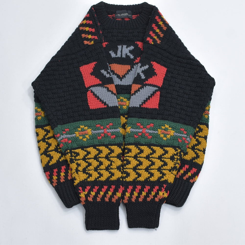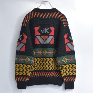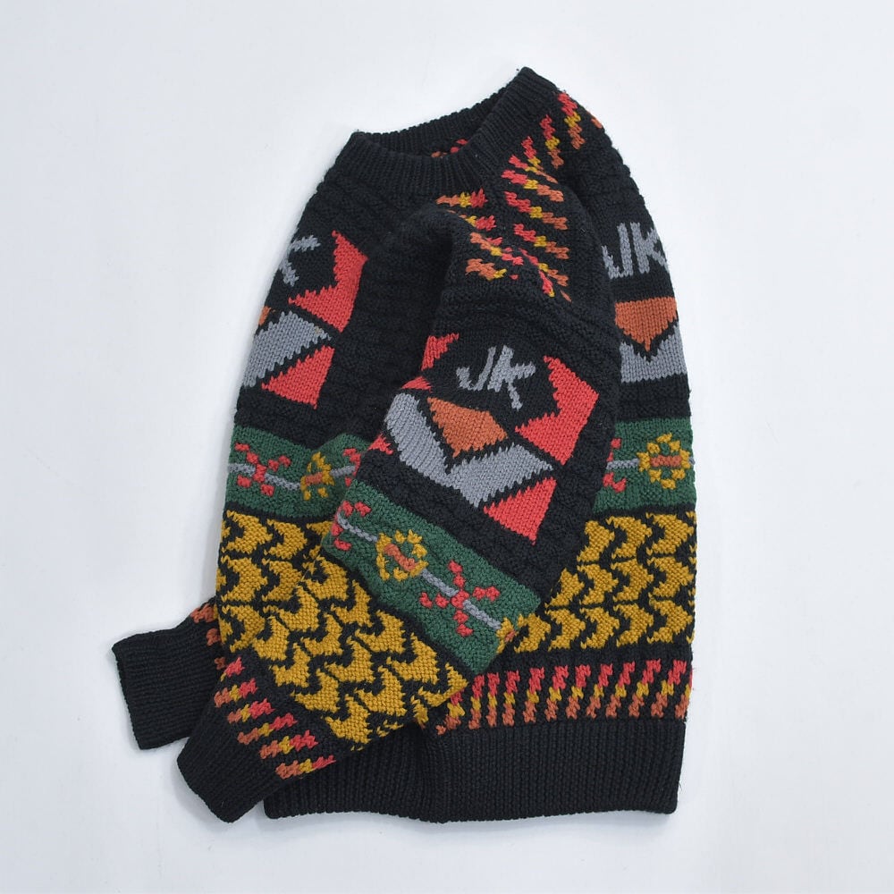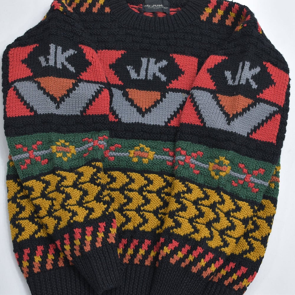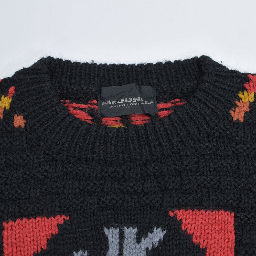 80~90s Mr. JUNKO コシノジュンコ ミスタージュンコ ロゴ 幾何学模様 ジャガードデザイン クルーネック プルオーバーニット セーター 黒 マルチカラー ジャパンヴィンテージ ビンテージ 古着 メンズMサイズ