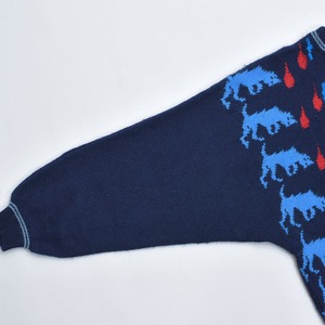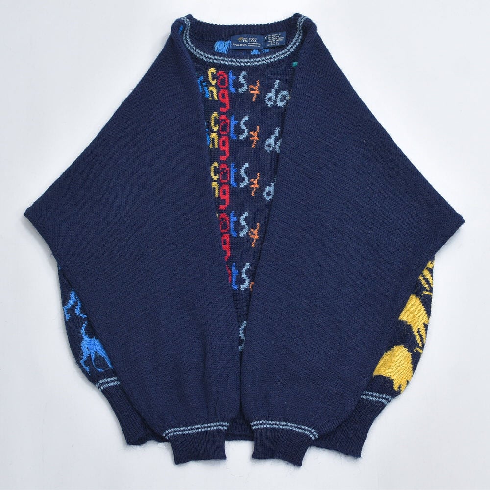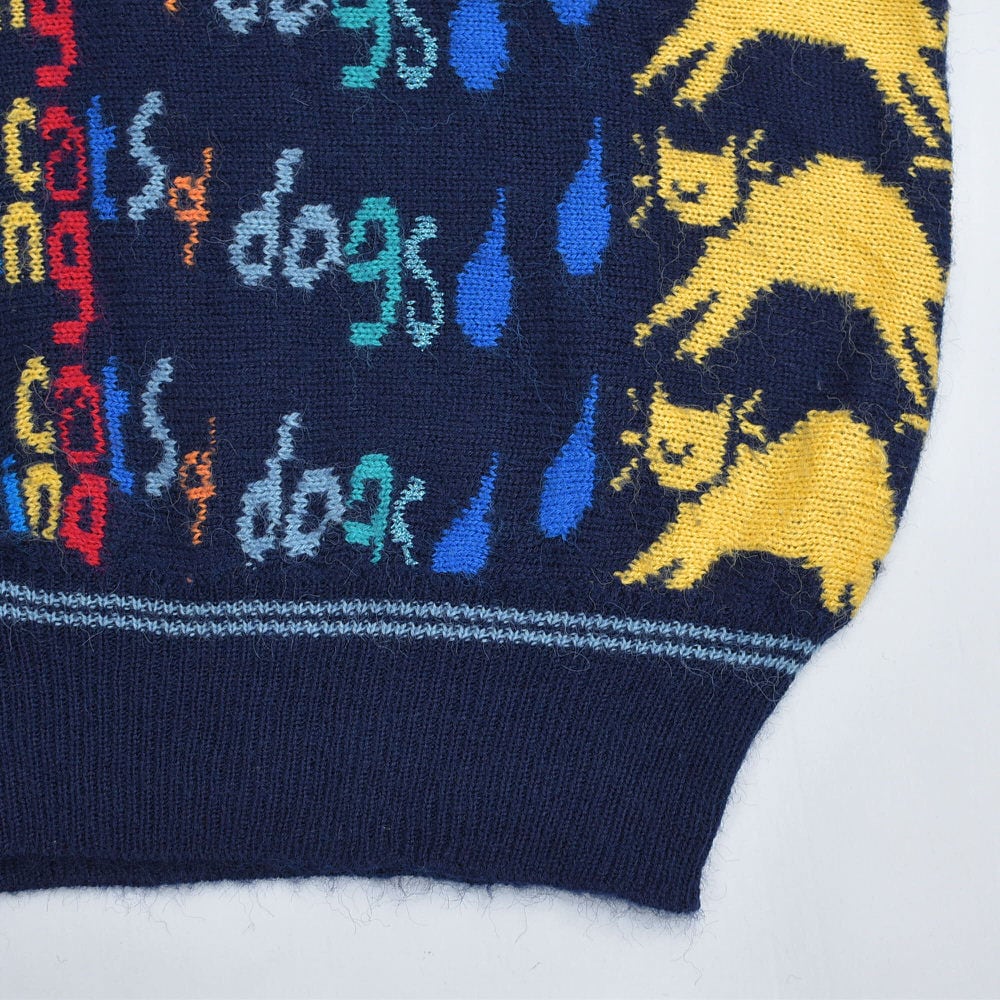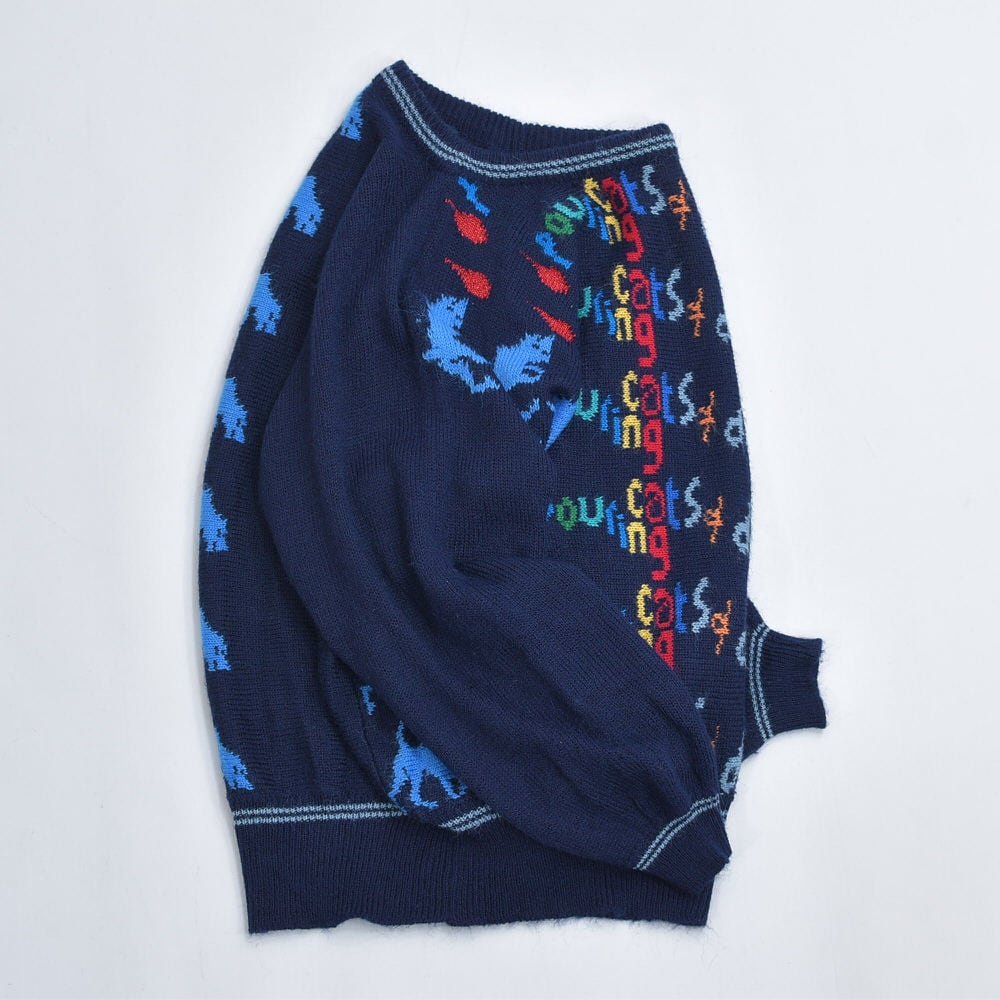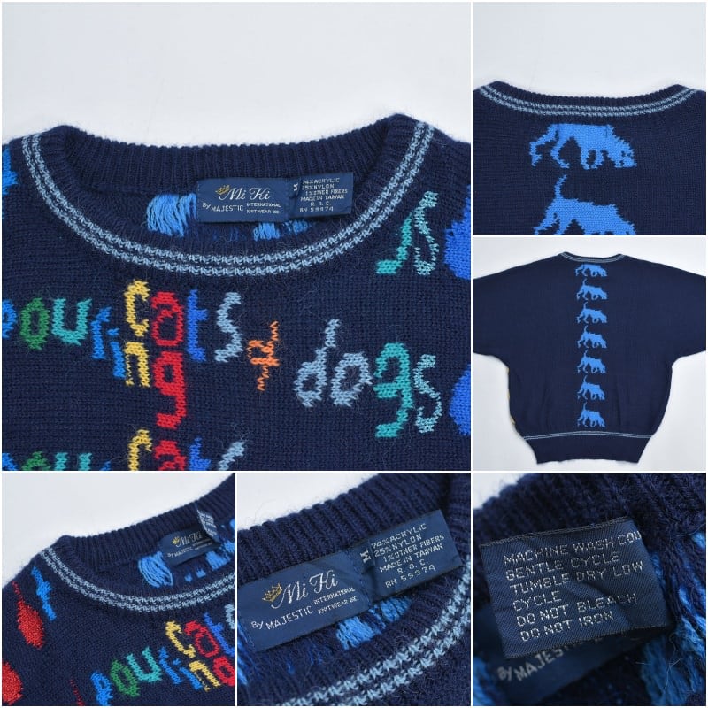 80~90s Mi Ki by MAJESTIC KNITWEAR キャッツアンドドッグス デザイン 総柄 ドルマンスリーブ クルーネックニット セーター ネイビー ヴィンテージ ビンテージ USA アメリカ古着 メンズL相当