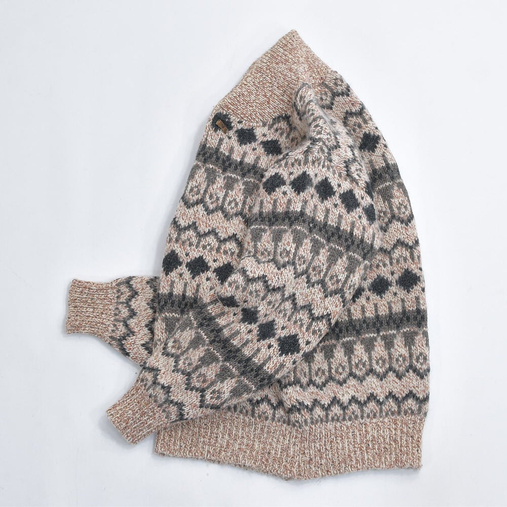 フェアアイル柄のようでいて、どことなくネイティブアメリカンのラグのような力強さも秘めた、個性豊かなデザイン
