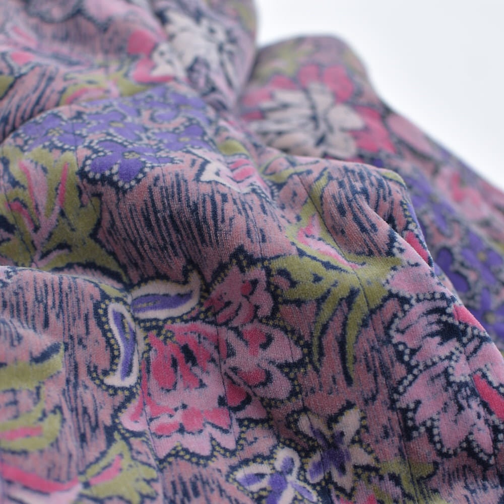 ベロアの艶やかなキャンバスに咲き乱れる花々は、まるで万華鏡を覗き込んだかのようなカオスと美の競演