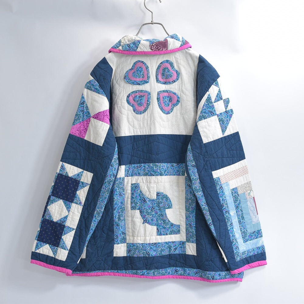 お花やペイズリー、ドットや幾何学模様などなど、色々な生地を一枚一枚繋ぎ合わせ、優しい風合いのジャケットに再構築したパッチワークキルトのジャケット
