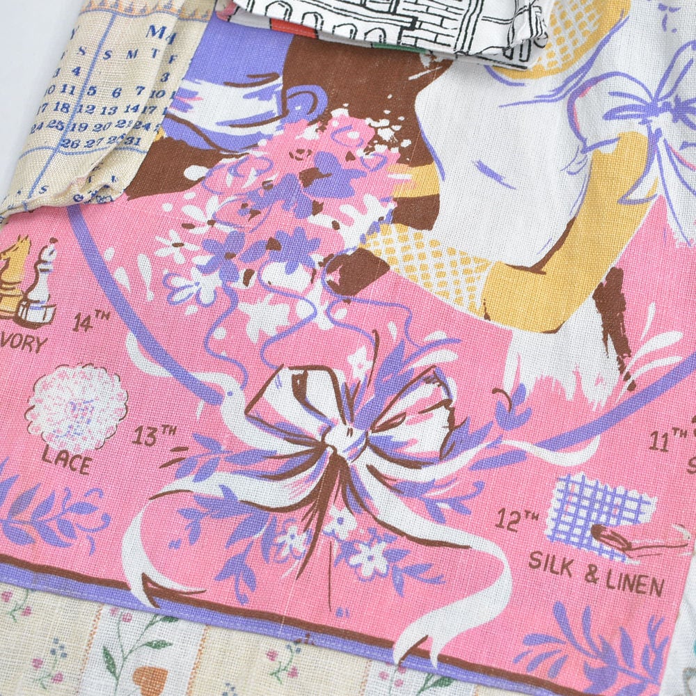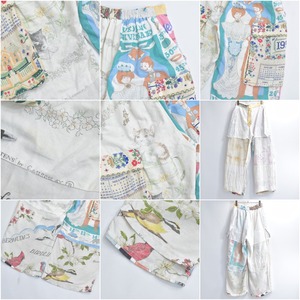 ティータオルやカレンダーの色んな生地を丁寧に繋ぎ合わせて一本のパンツに仕上げたリメイクパンツ