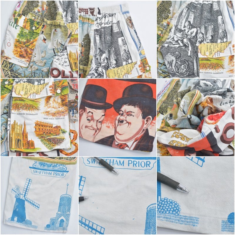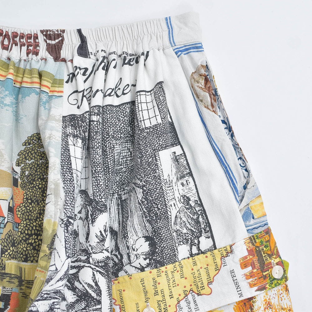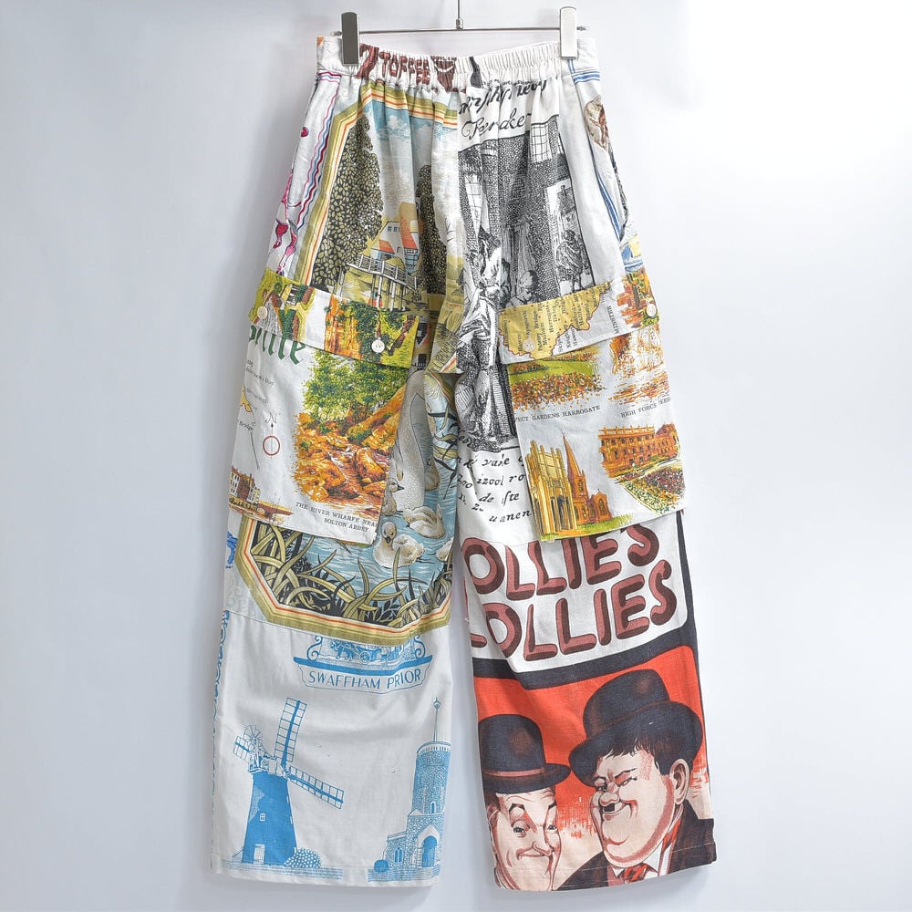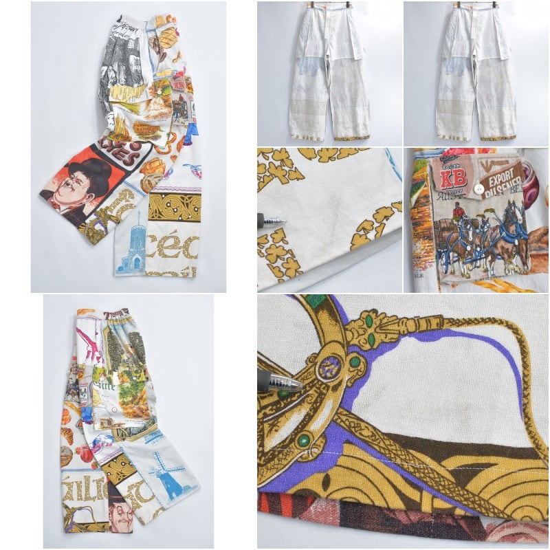 ティータオルやカレンダーの色んな生地を丁寧に繋ぎ合わせて一本のパンツに仕上げたリメイクパンツ