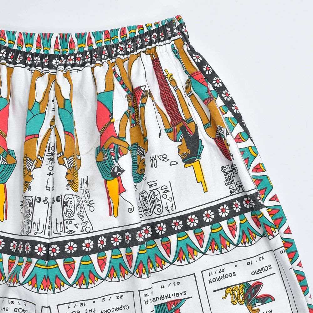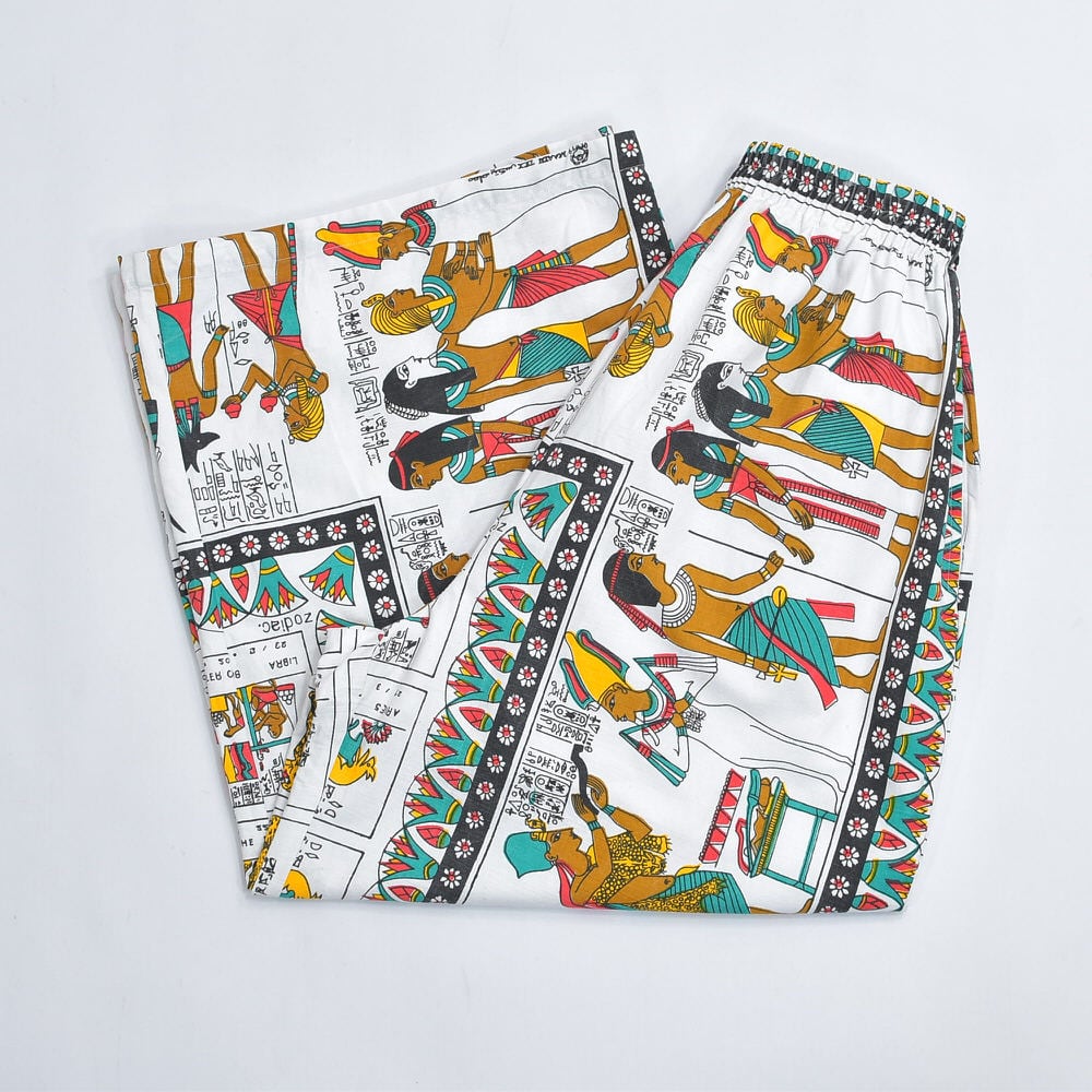 紀元前の文明を描いたかの様なエジプティシャンの生地をボトムスに再構築したリメイクパンツ