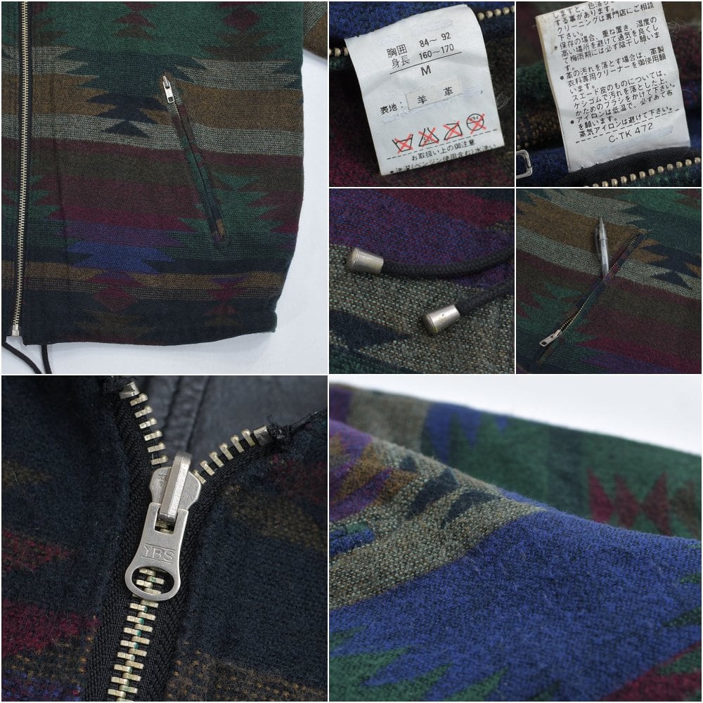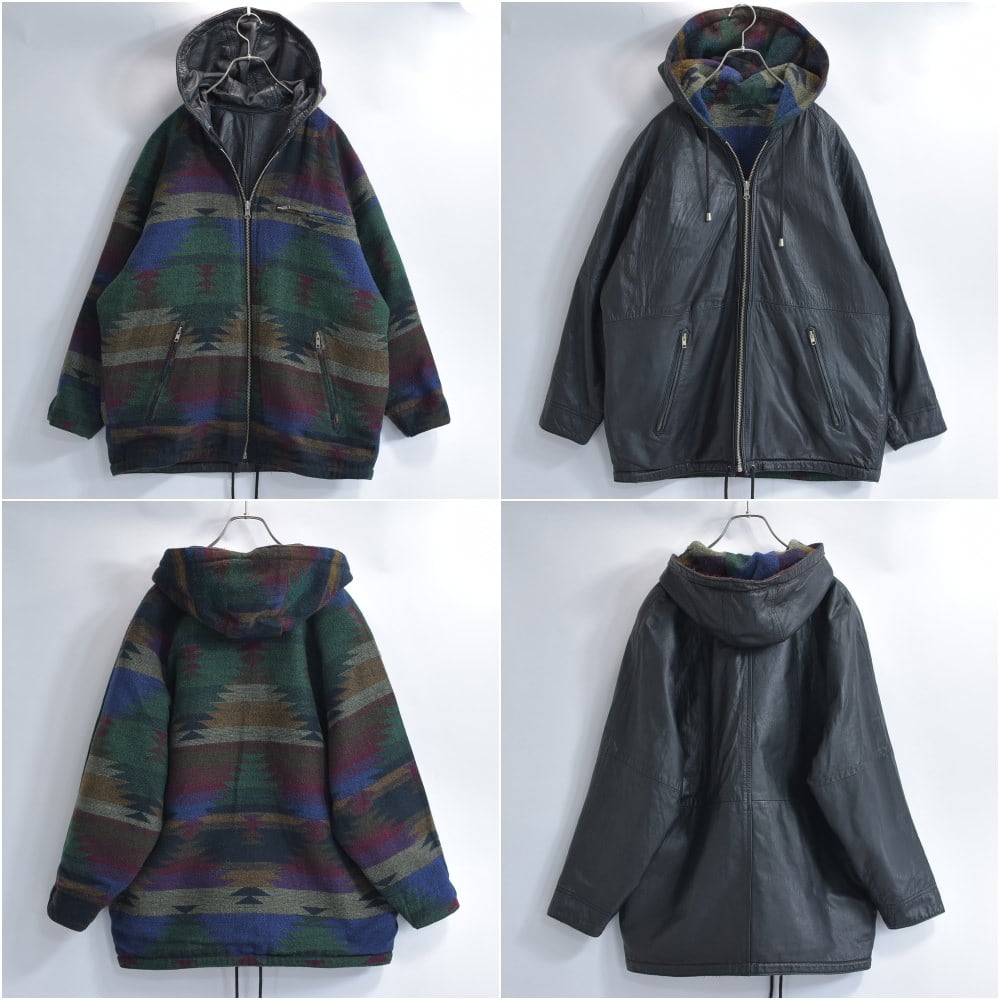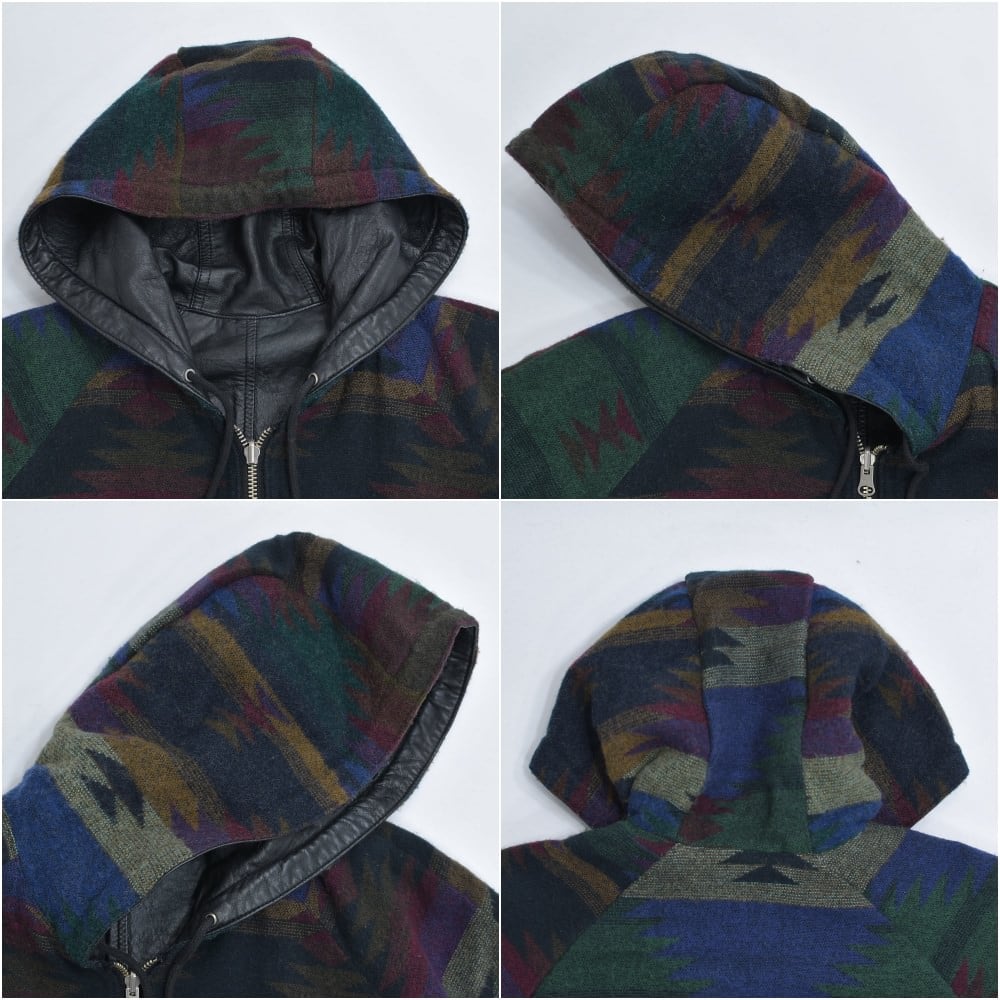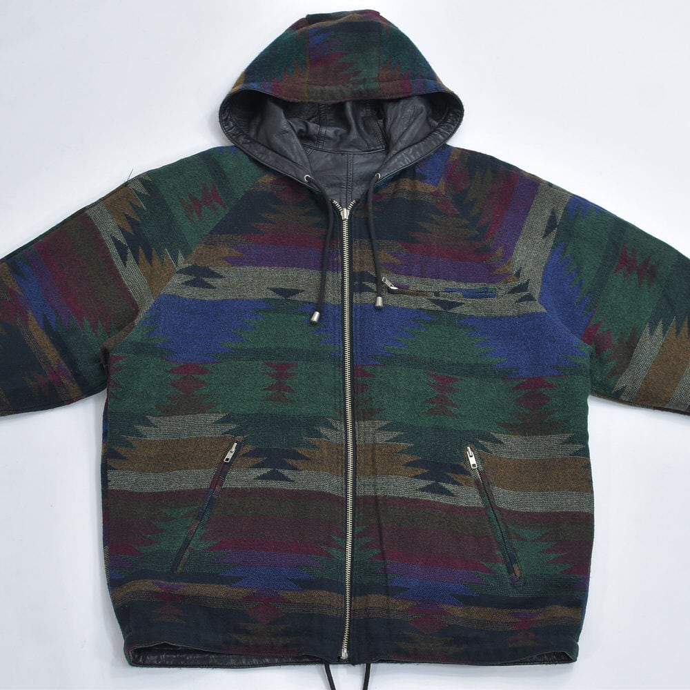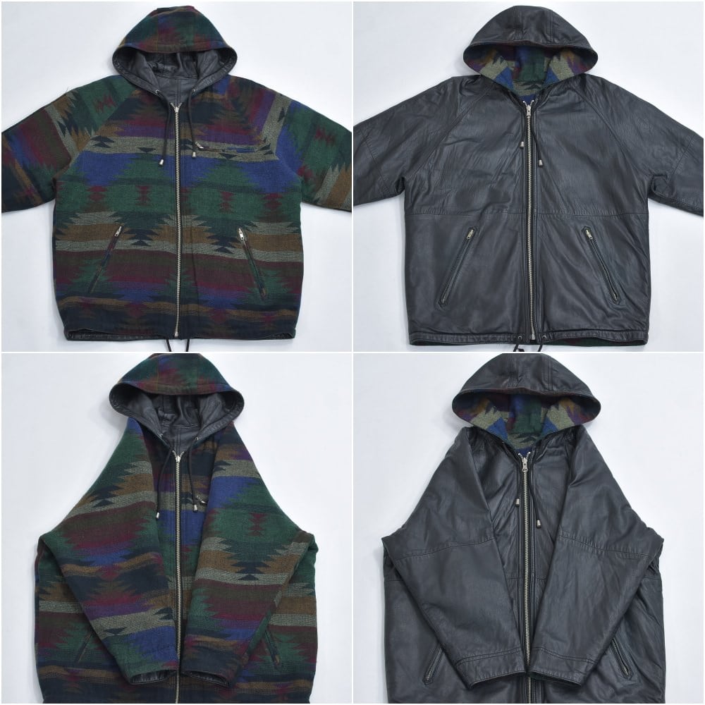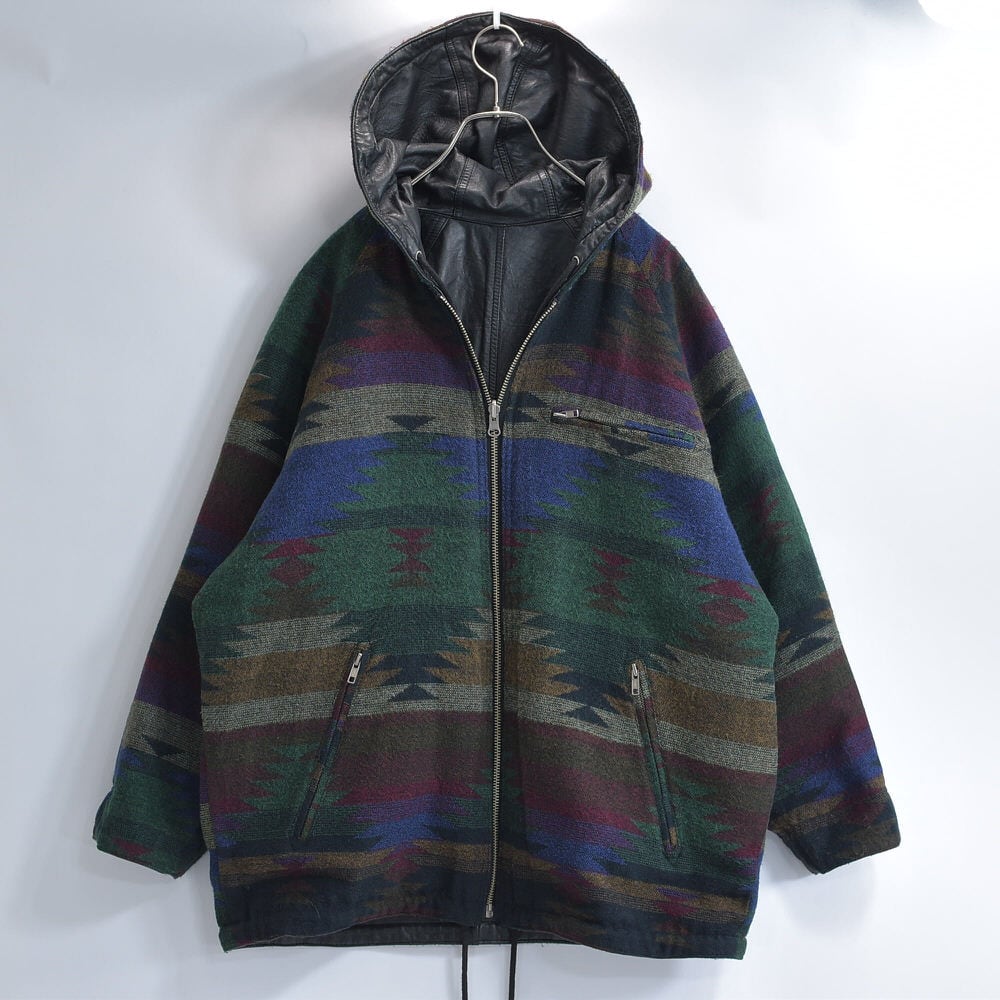 90s Reversible Jacket リバーシブル ネイティブ柄 ウール シープスキン レザー コンビネーション フーデッドジャケット ブルゾン ジャパンヴィンテージ ビンテージ 古着 メンズMサイズ