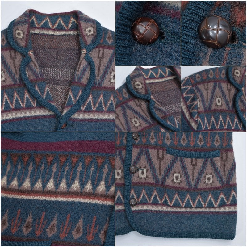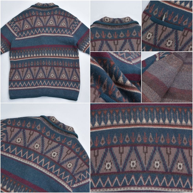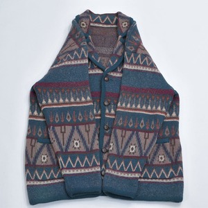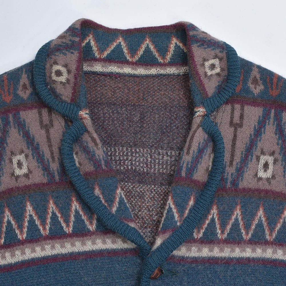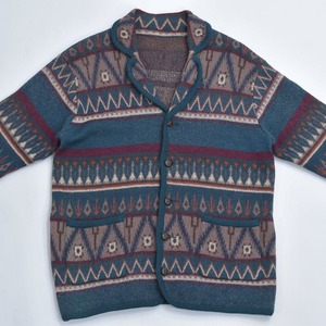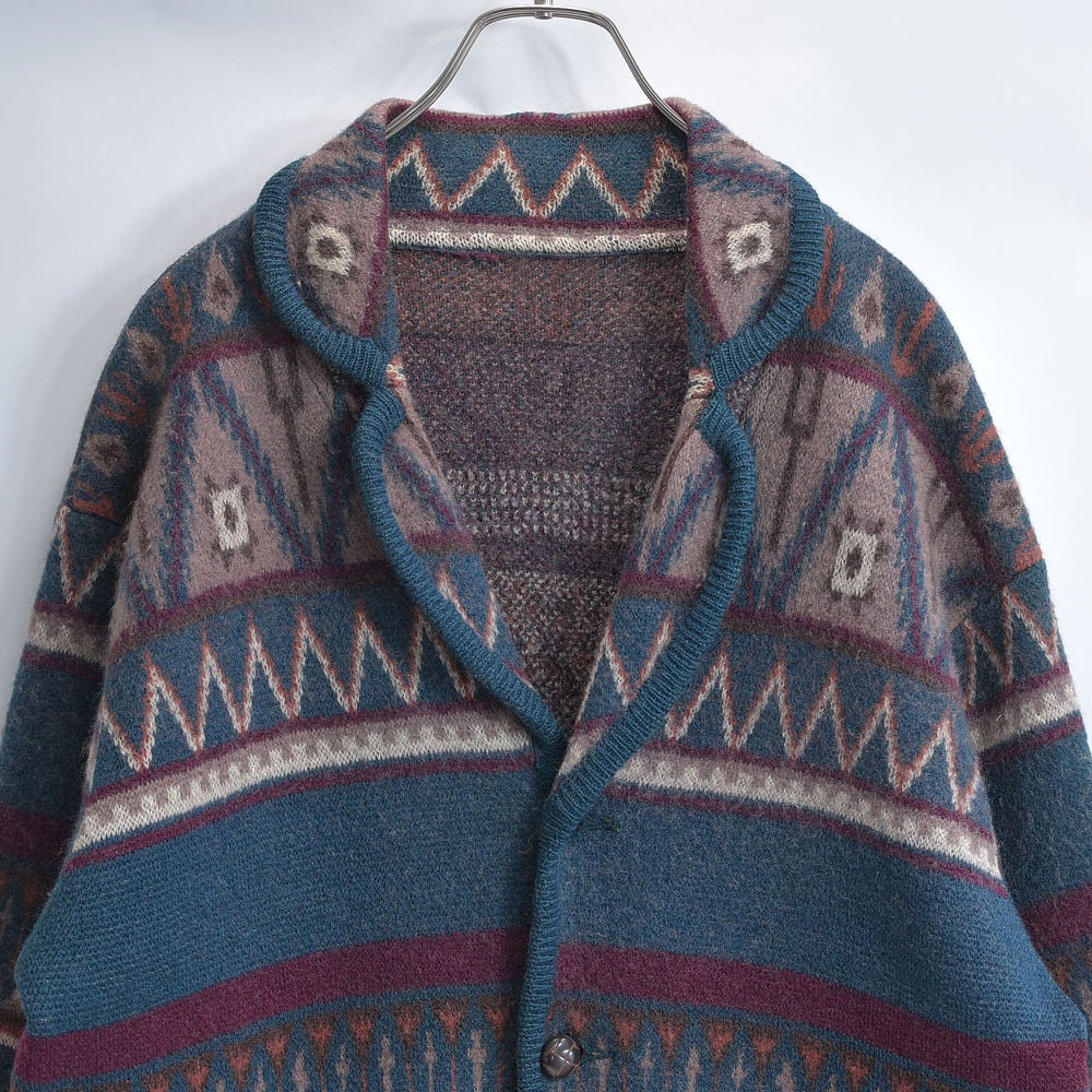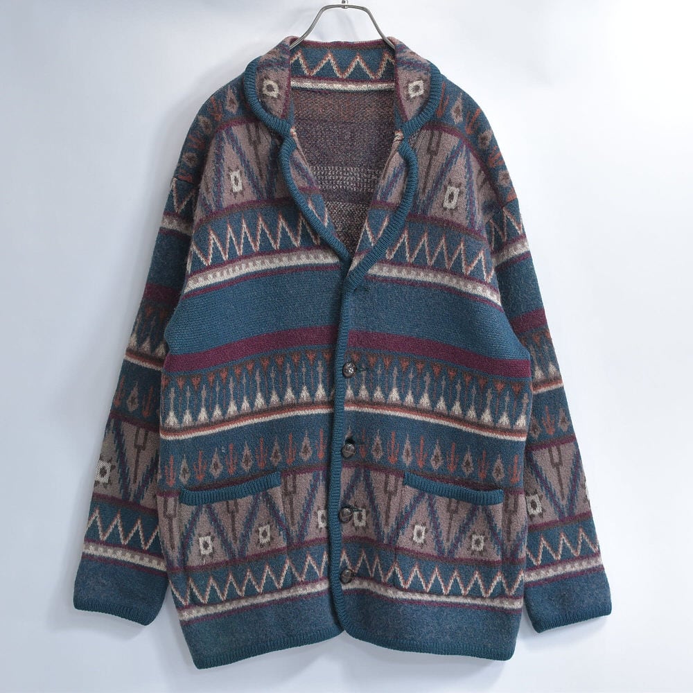 80〜90s Used ジャガード ネイティブ柄 変形ショールカラー デザイン ニットジャケット カーディガン 総柄 ヴィンテージ ビンテージ 古着 メンズL相当