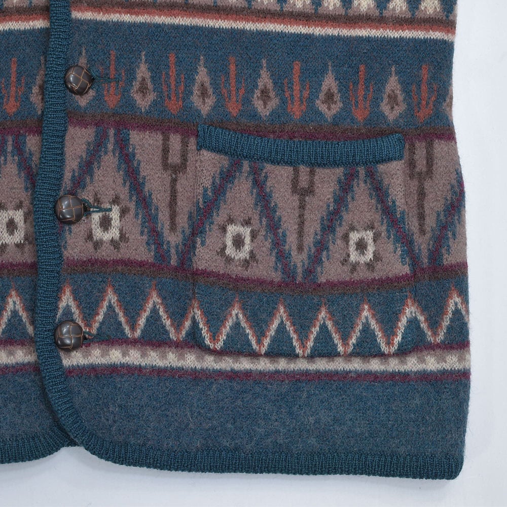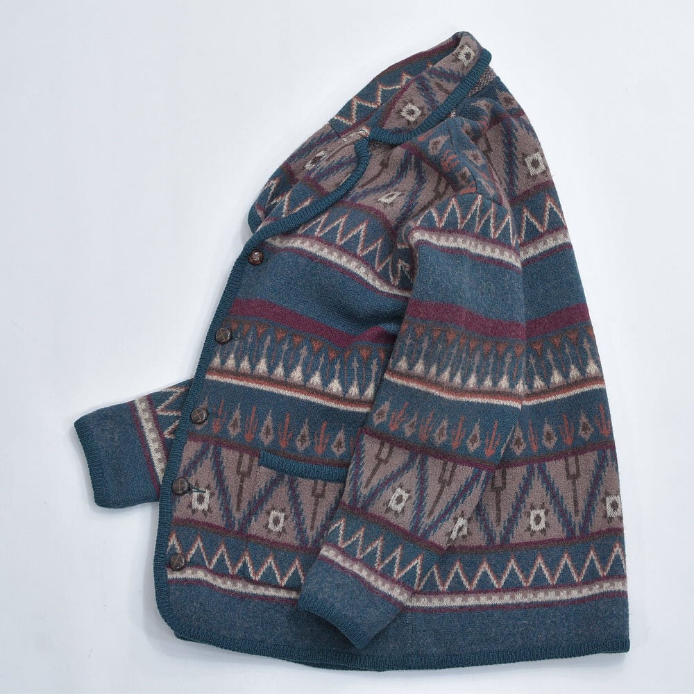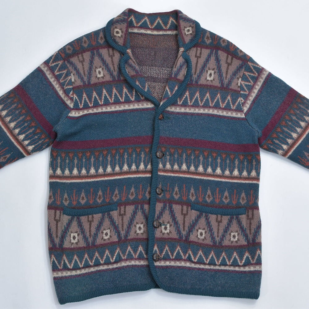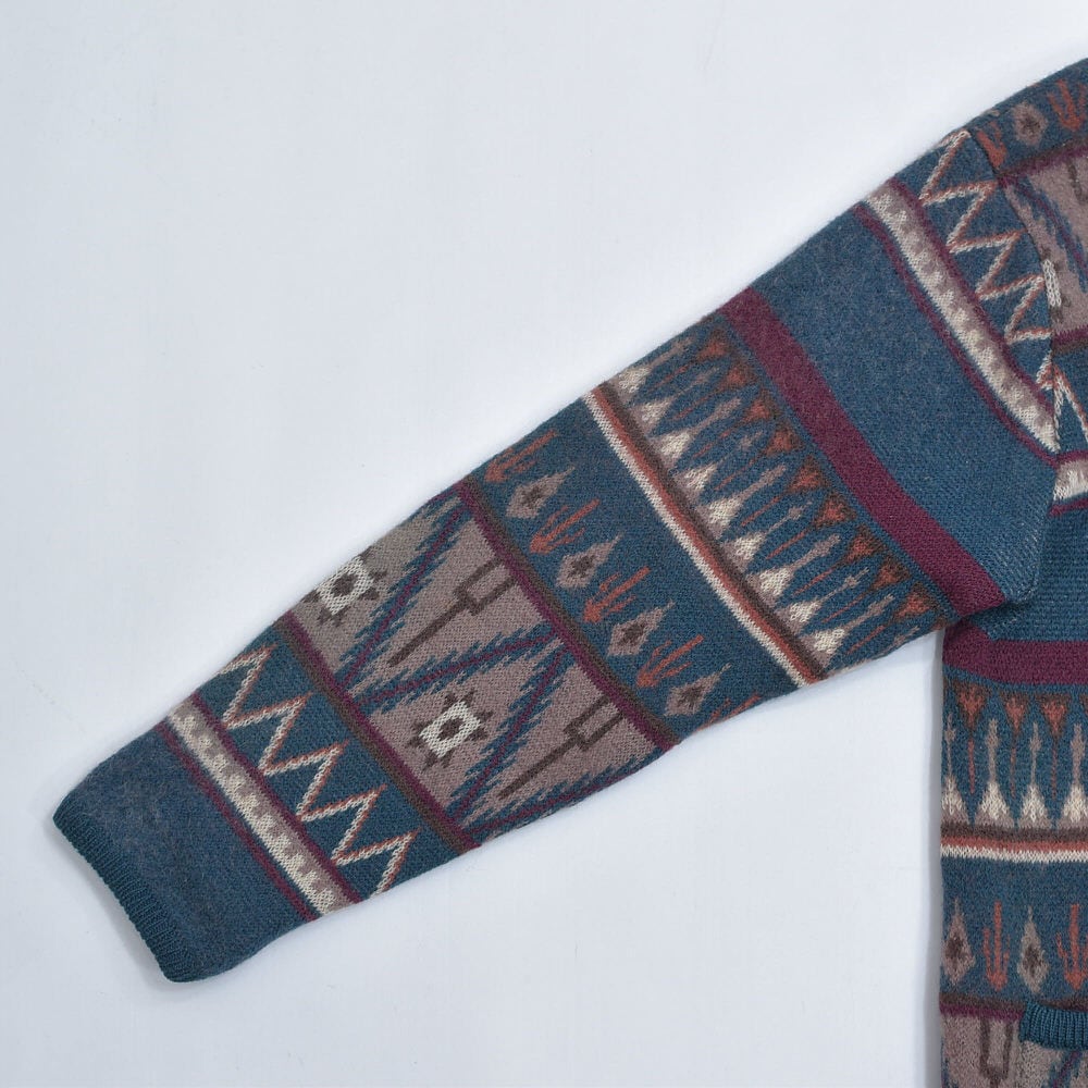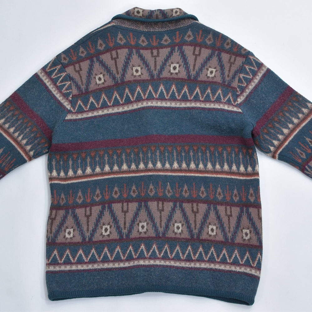 80~90s Used ジャガード ネイティブ柄 変形ショールカラー デザイン ニットジャケット カーディガン 総柄 ヴィンテージ ビンテージ 古着 メンズL相当