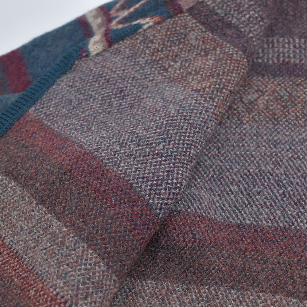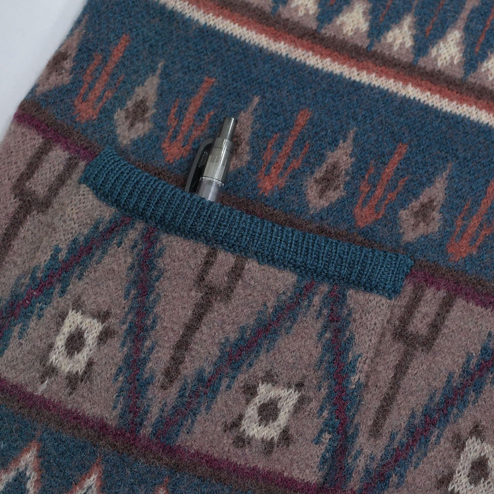 深く落ち着いたブルーを基調に、幾何学的なネイティブ柄が整然と並ぶその佇まいは、単なるカジュアルウェアを超えた静かな知性を感じさせます