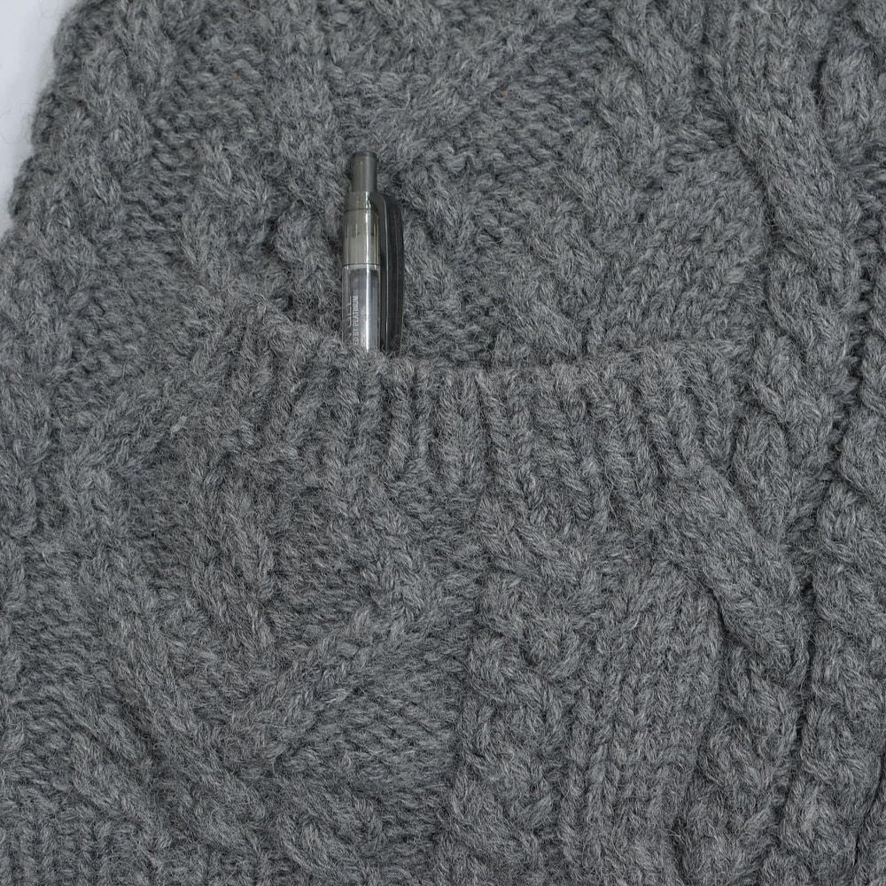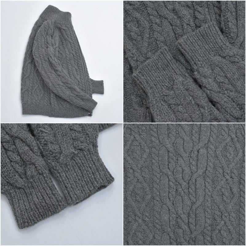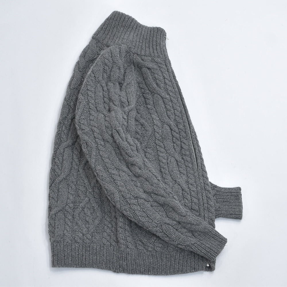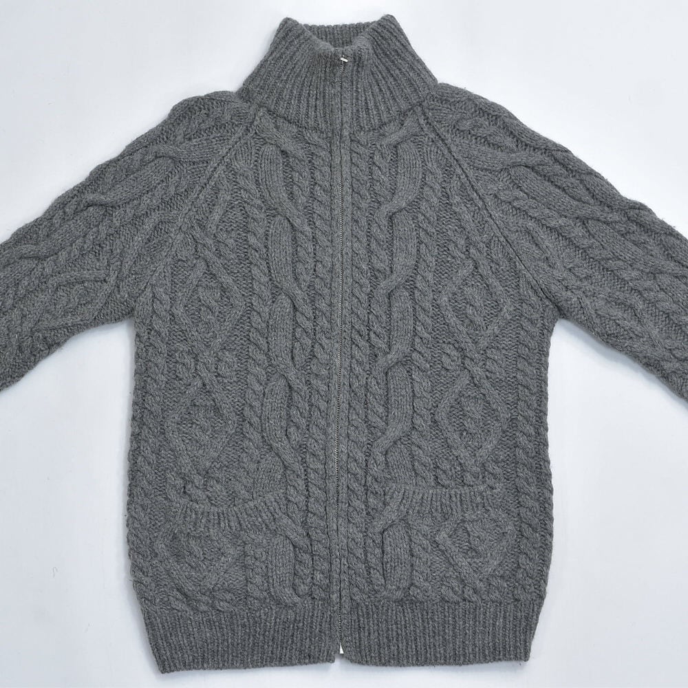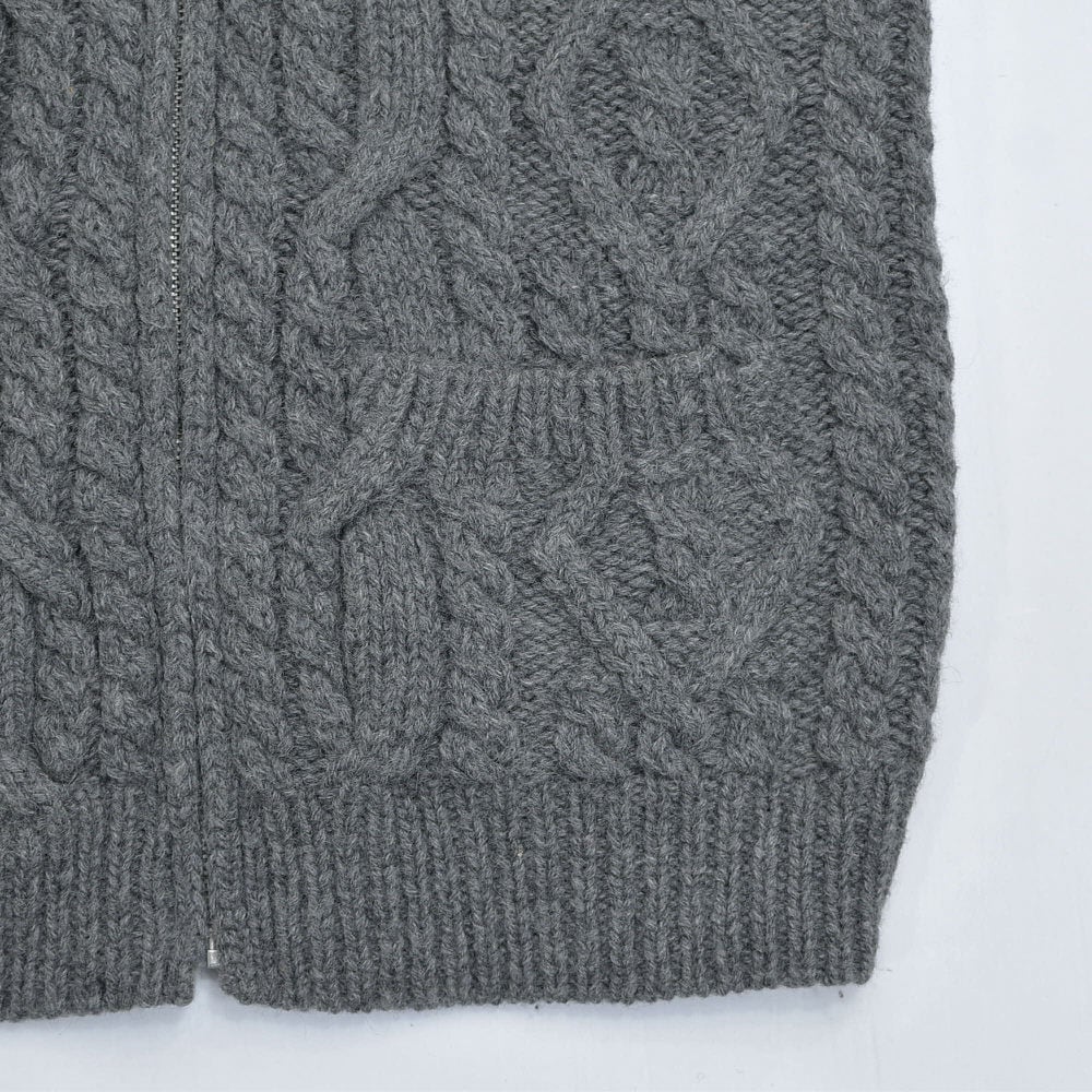 このカーディガンの面白いところは、伝統的なアラン編みでありながら、フルジップというアクティブな顔を持っていること