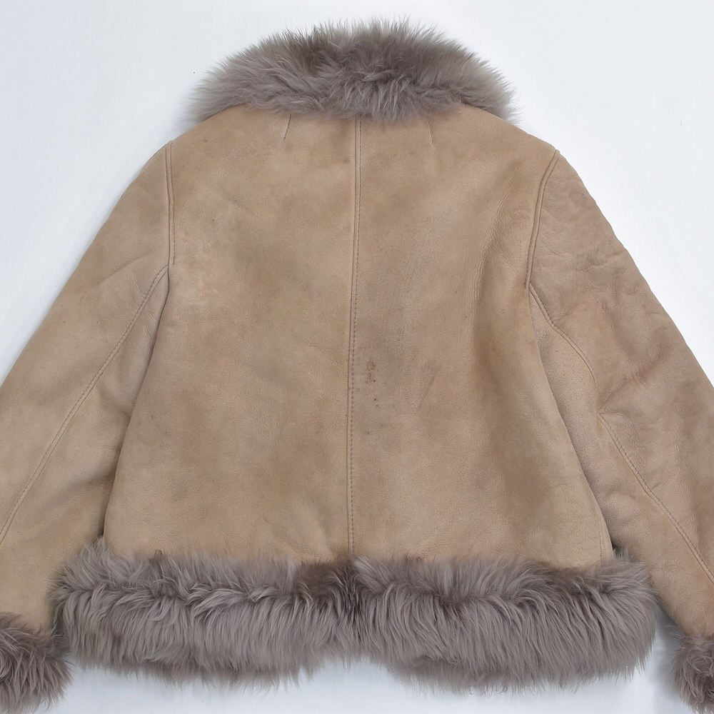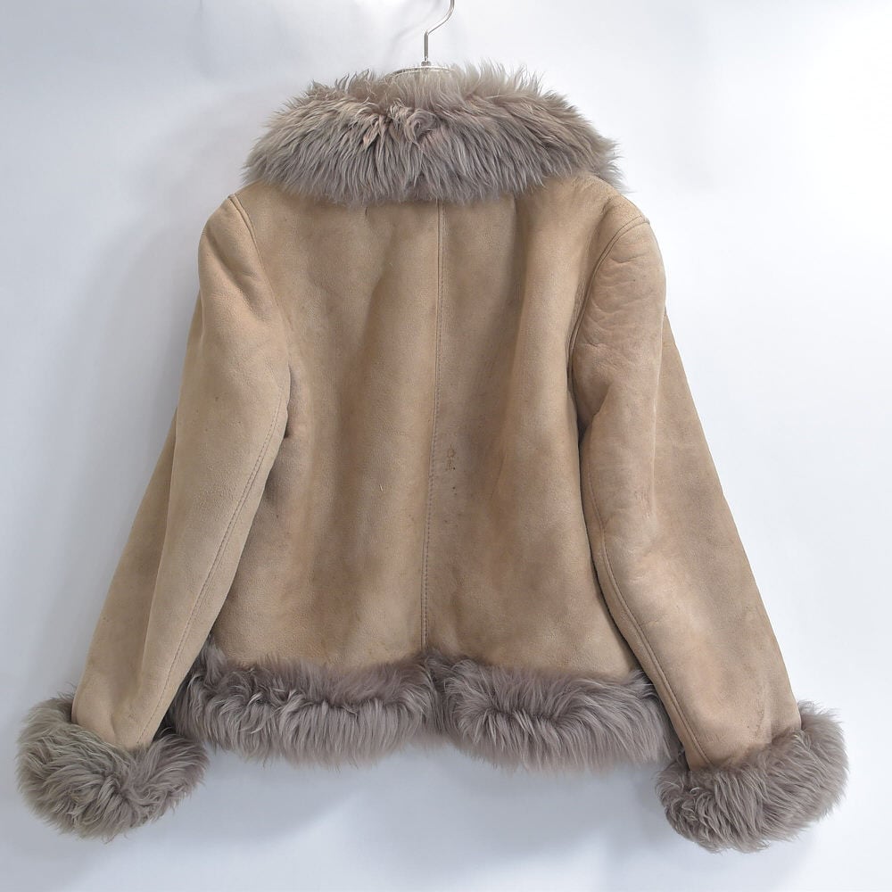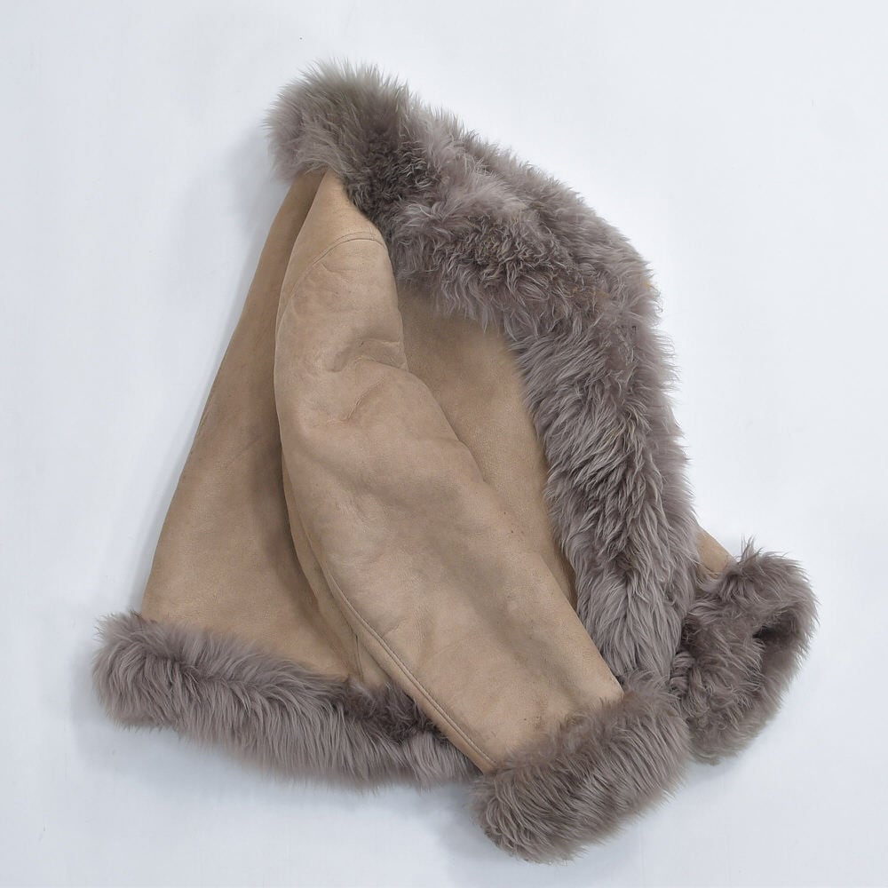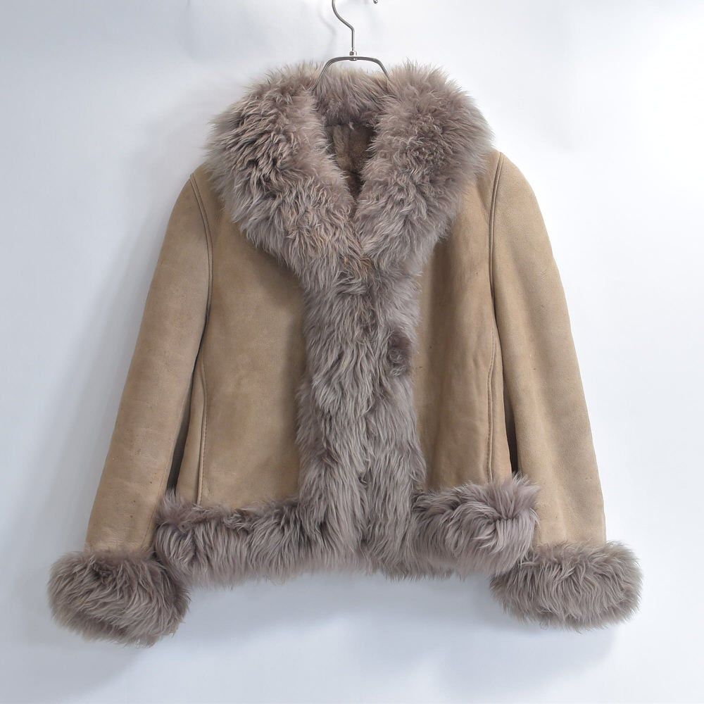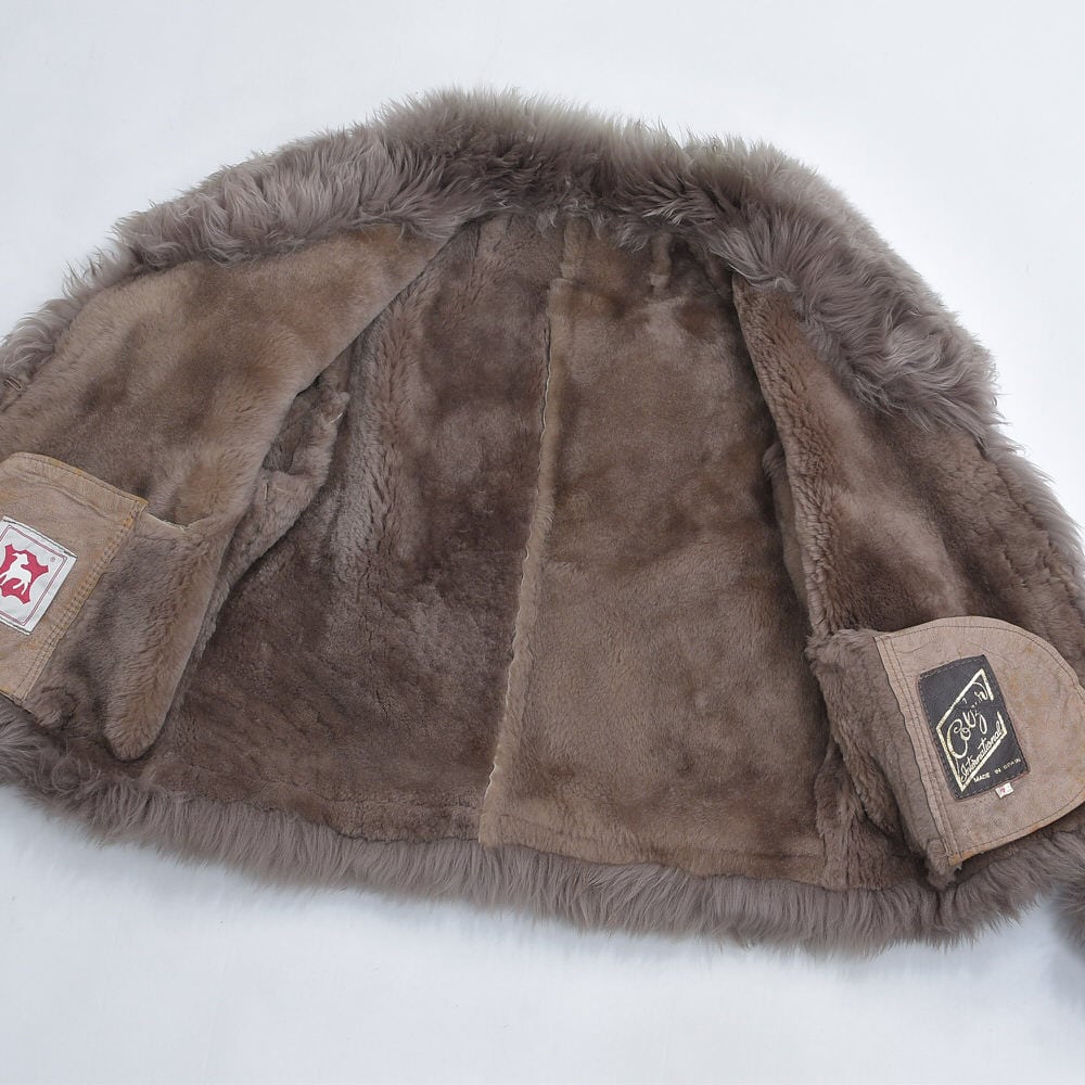80~90s スペイン製 Colzy International コルジー リアルムートン ファー ショールカラー ショートジャケット シアリングジャケット ブルゾン ヴィンテージ ビンテージ ヨーロッパ古着 グレージュ レディースM相当