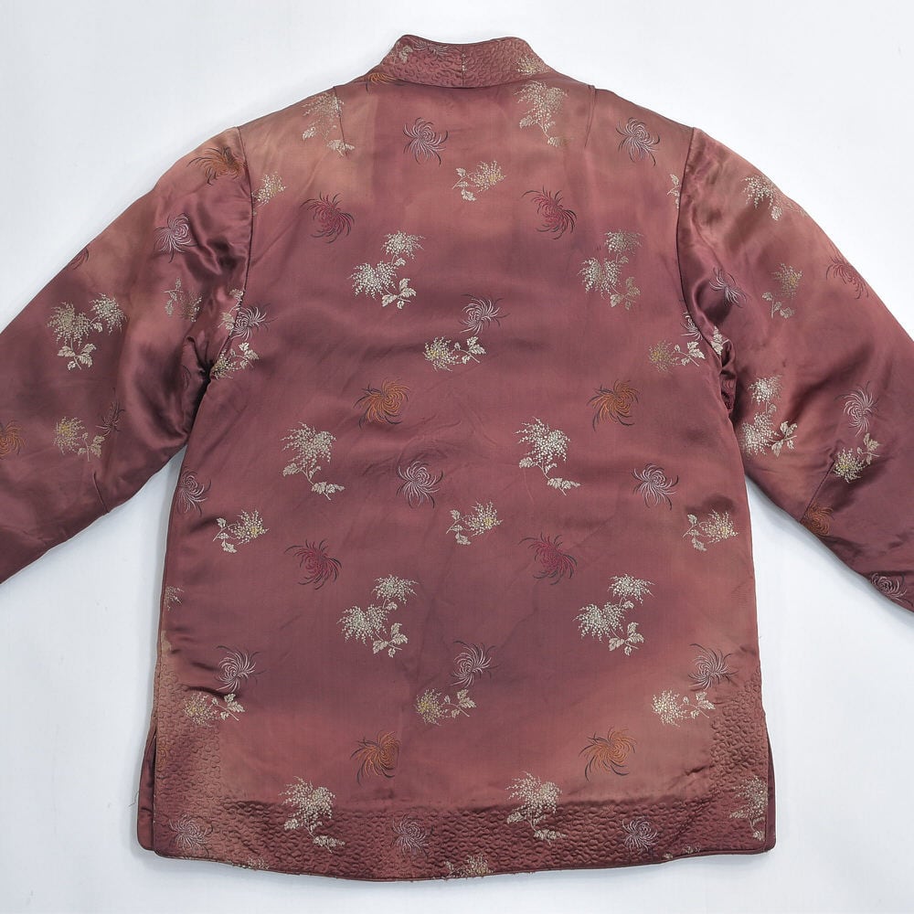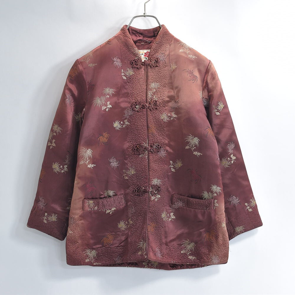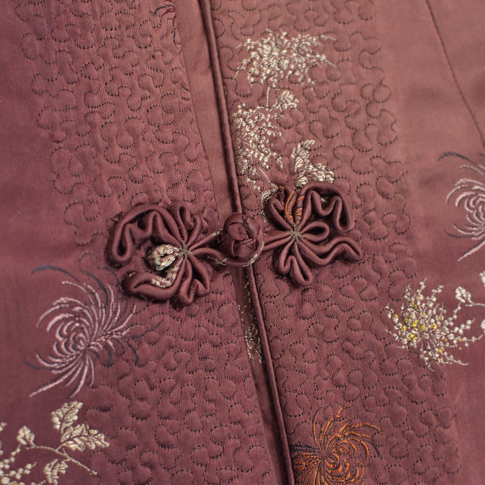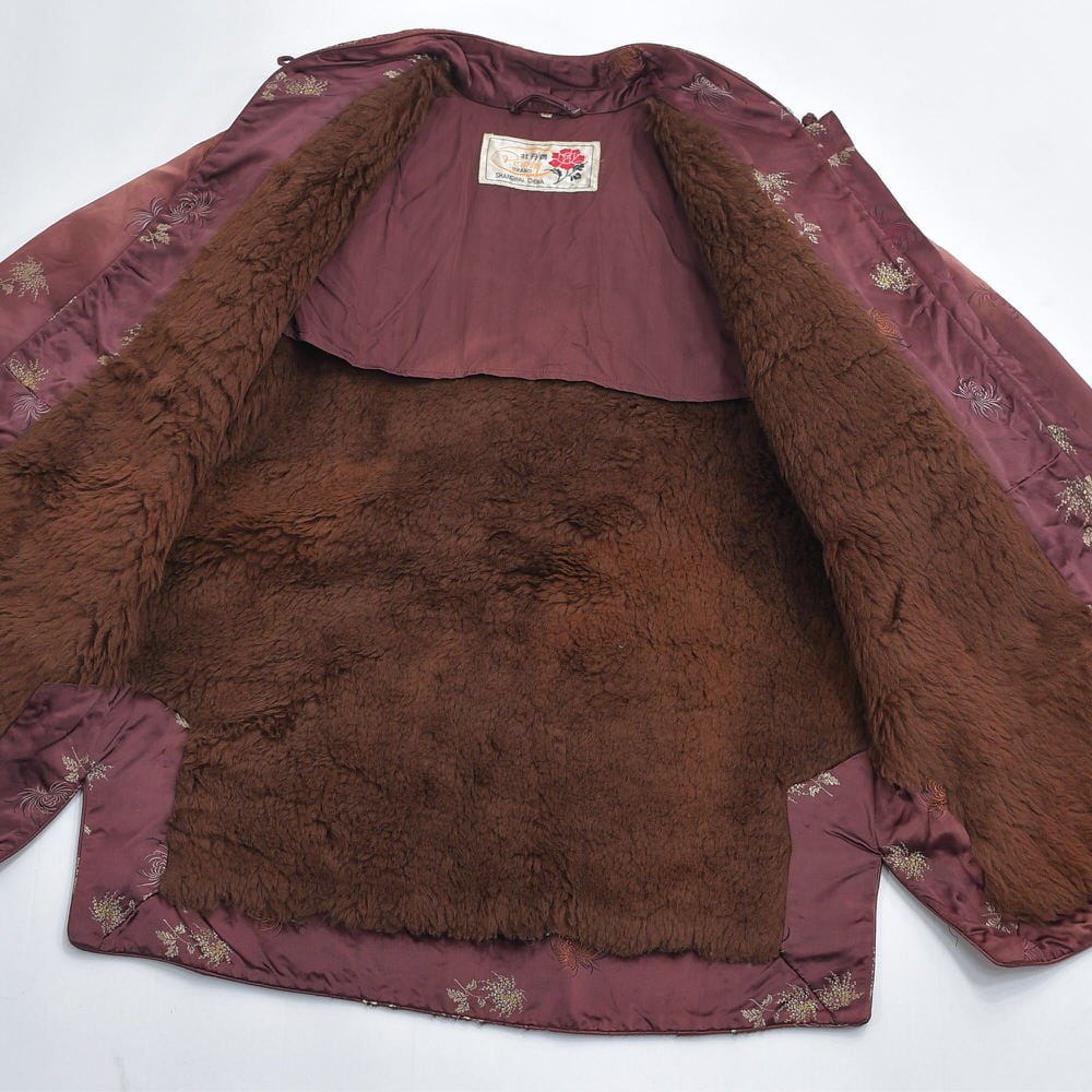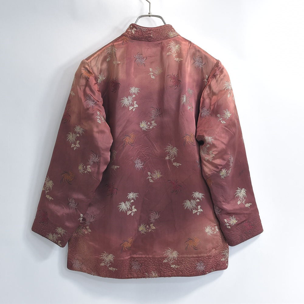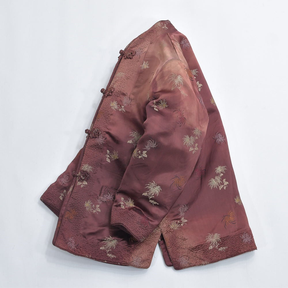 60s 上海製 Peony BRAND 牡丹牌 シルクブロケード ボアライナー 菊刺繍 チャイナジャケット マンダリン フェードブラウン ヴィンテージ ビンテージ 古着 レディースXS相当