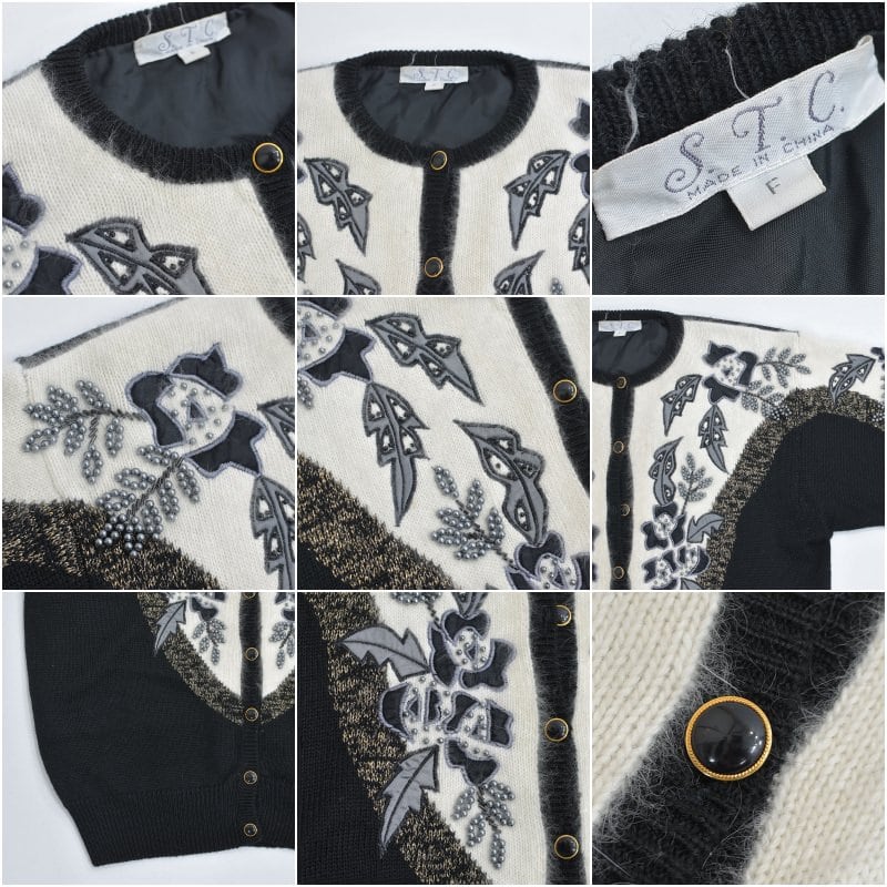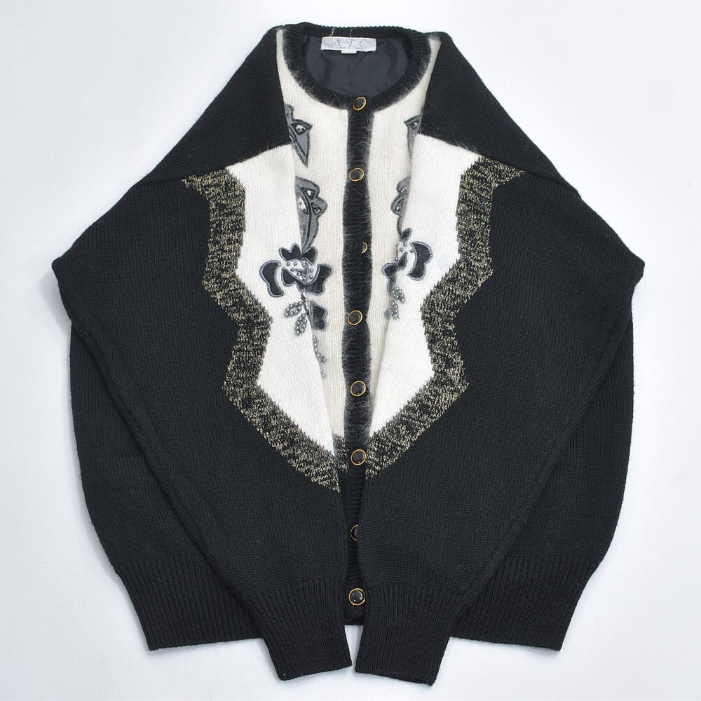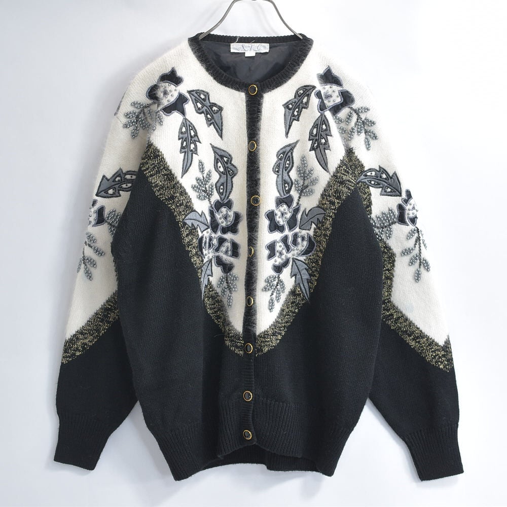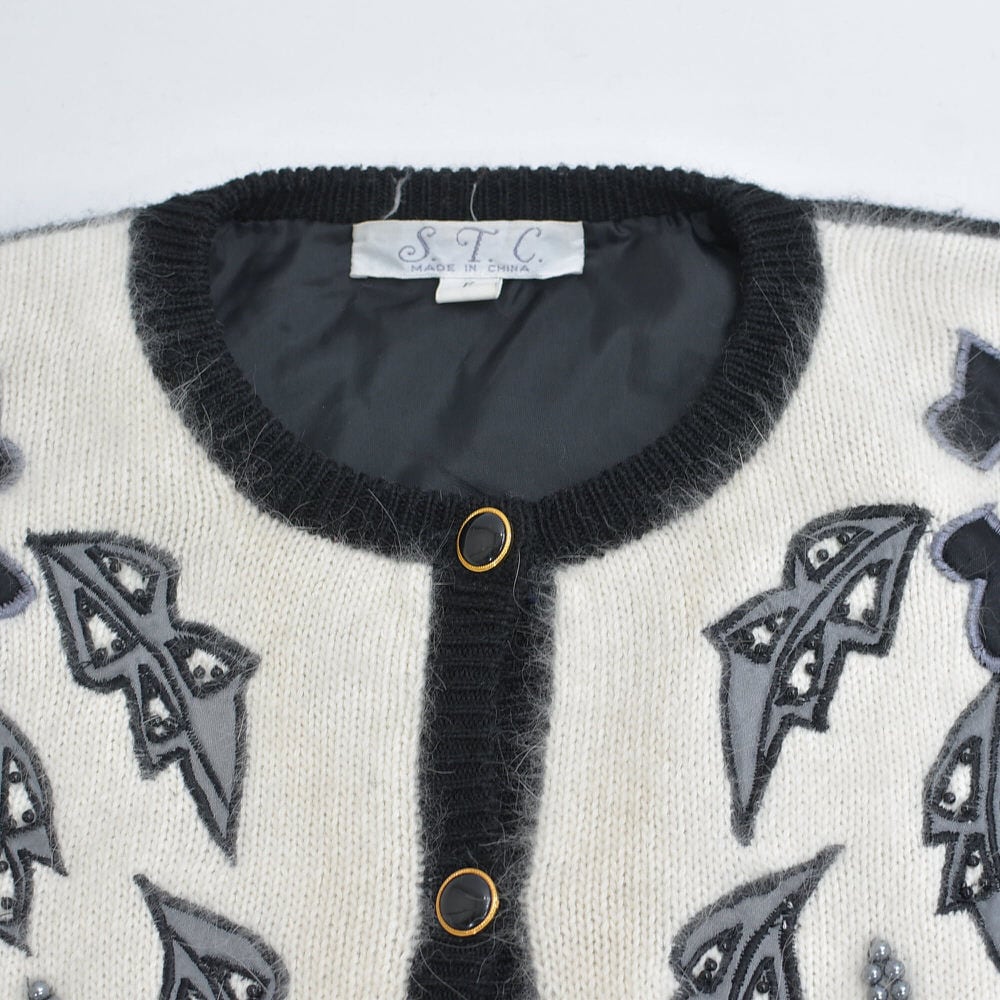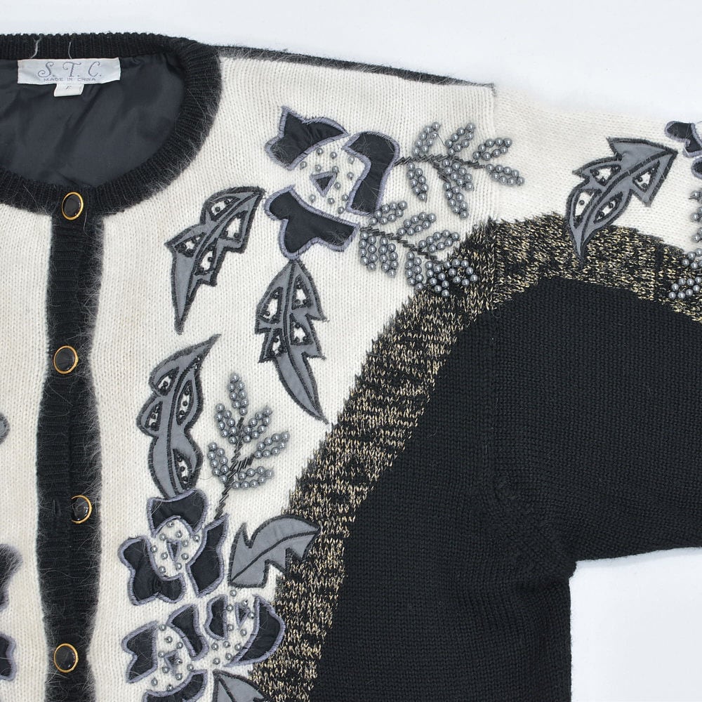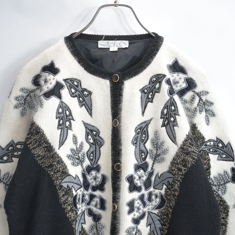 80〜90s S.T.C. デコレーション ビーズ パッチワーク 刺繍 デザイン バイカラー ニット カーディガン ブラック ホワイト アンゴラタッチ ヴィンテージ ビンテージ 古着 レディースL相当
